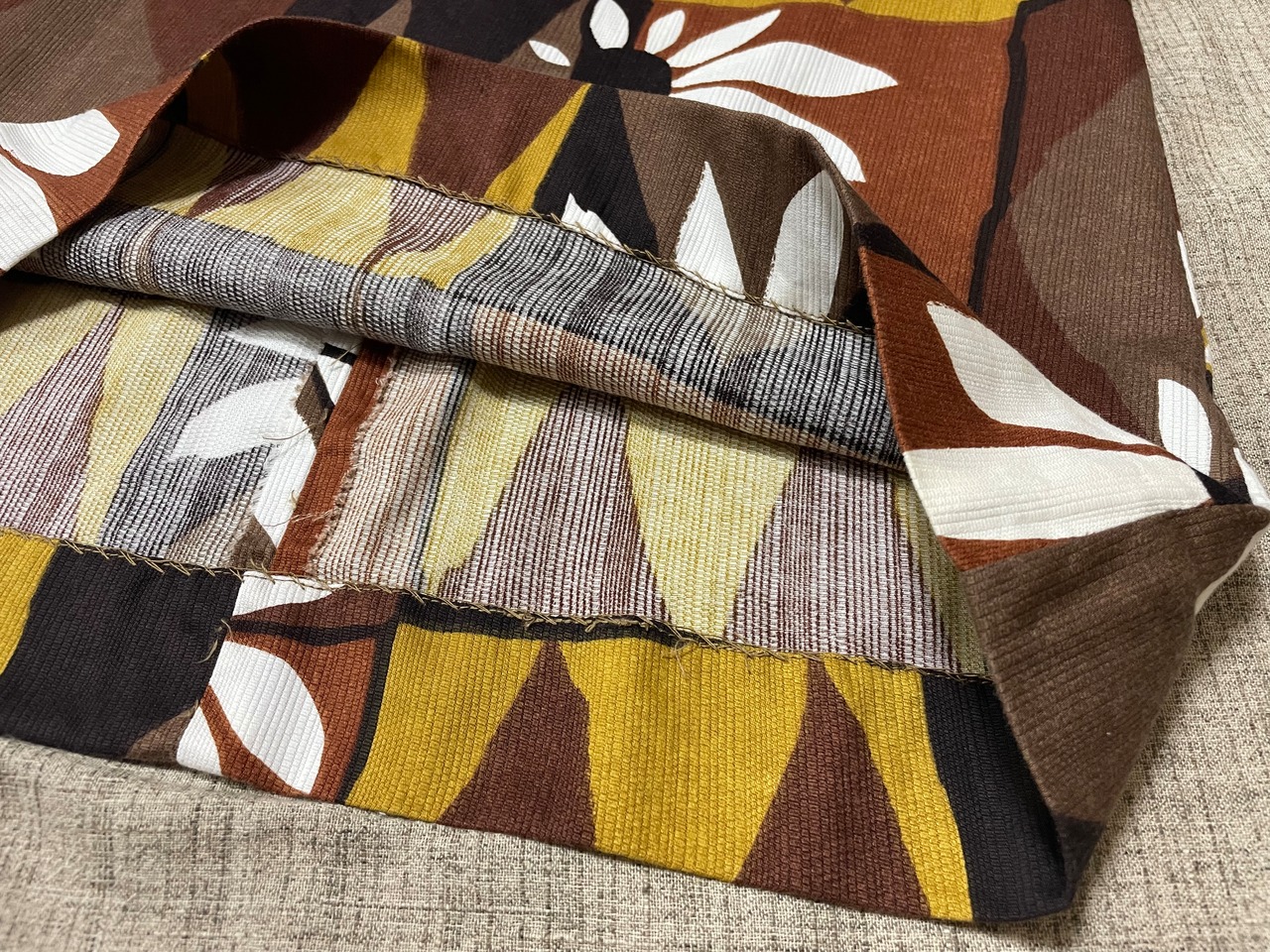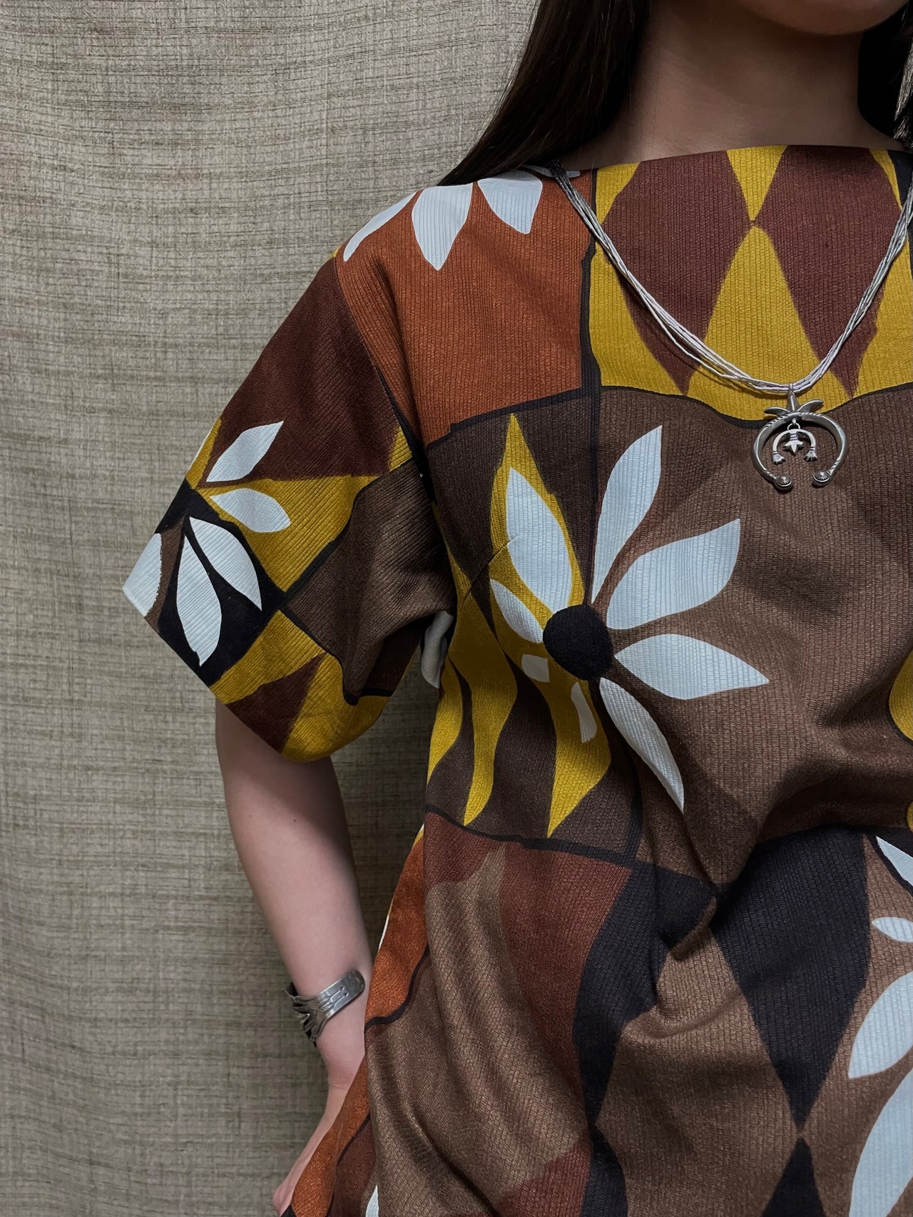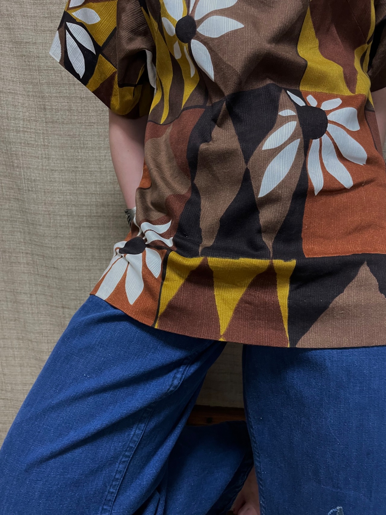 落ち着いたブラウン調のカラーに大胆な♢柄とフラワーデザインがステキな60sビンテージトップス。