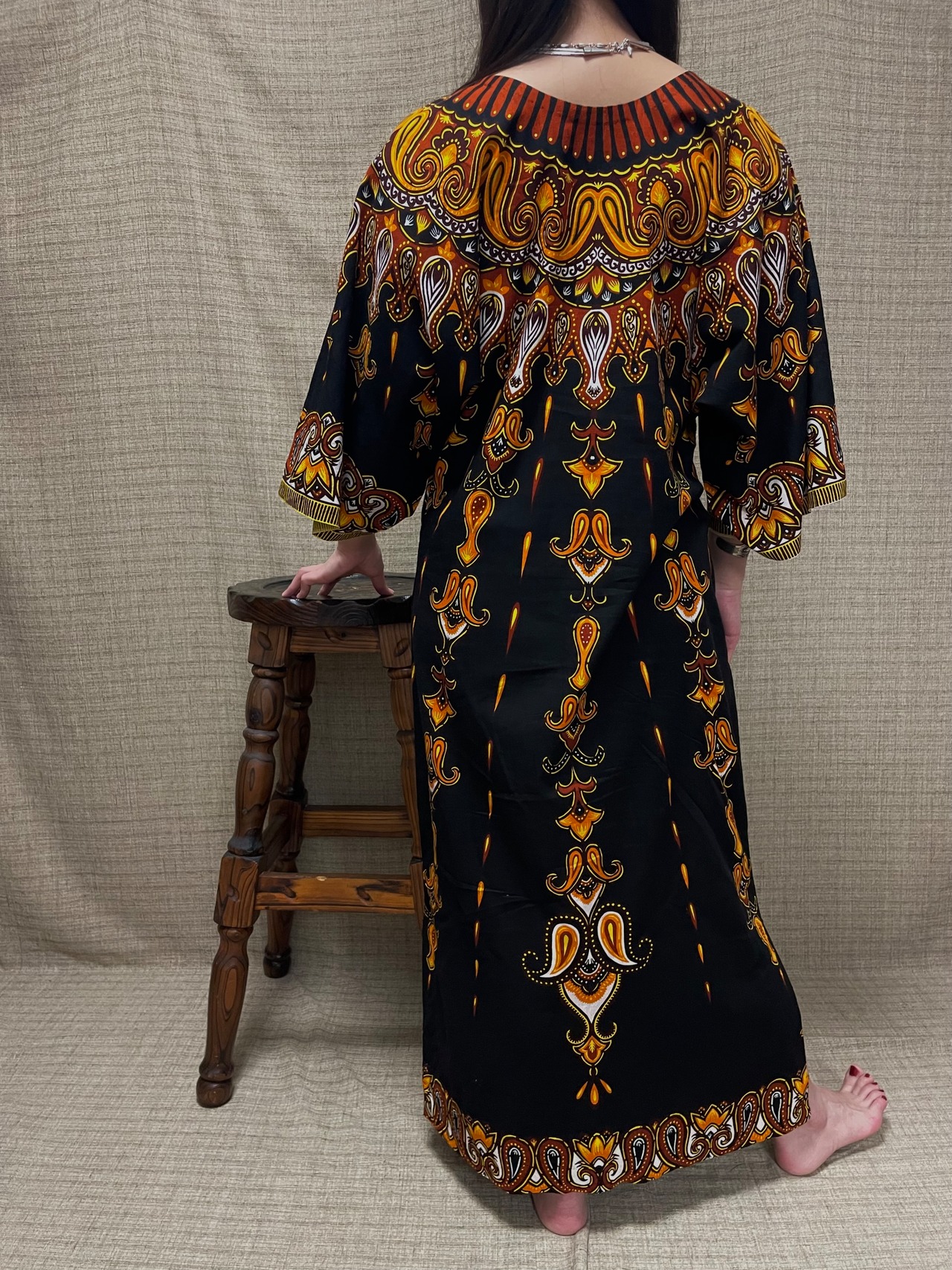 ブラックボディにパワフルなプリントがテンション上がる70sビンテージバティックドレス。