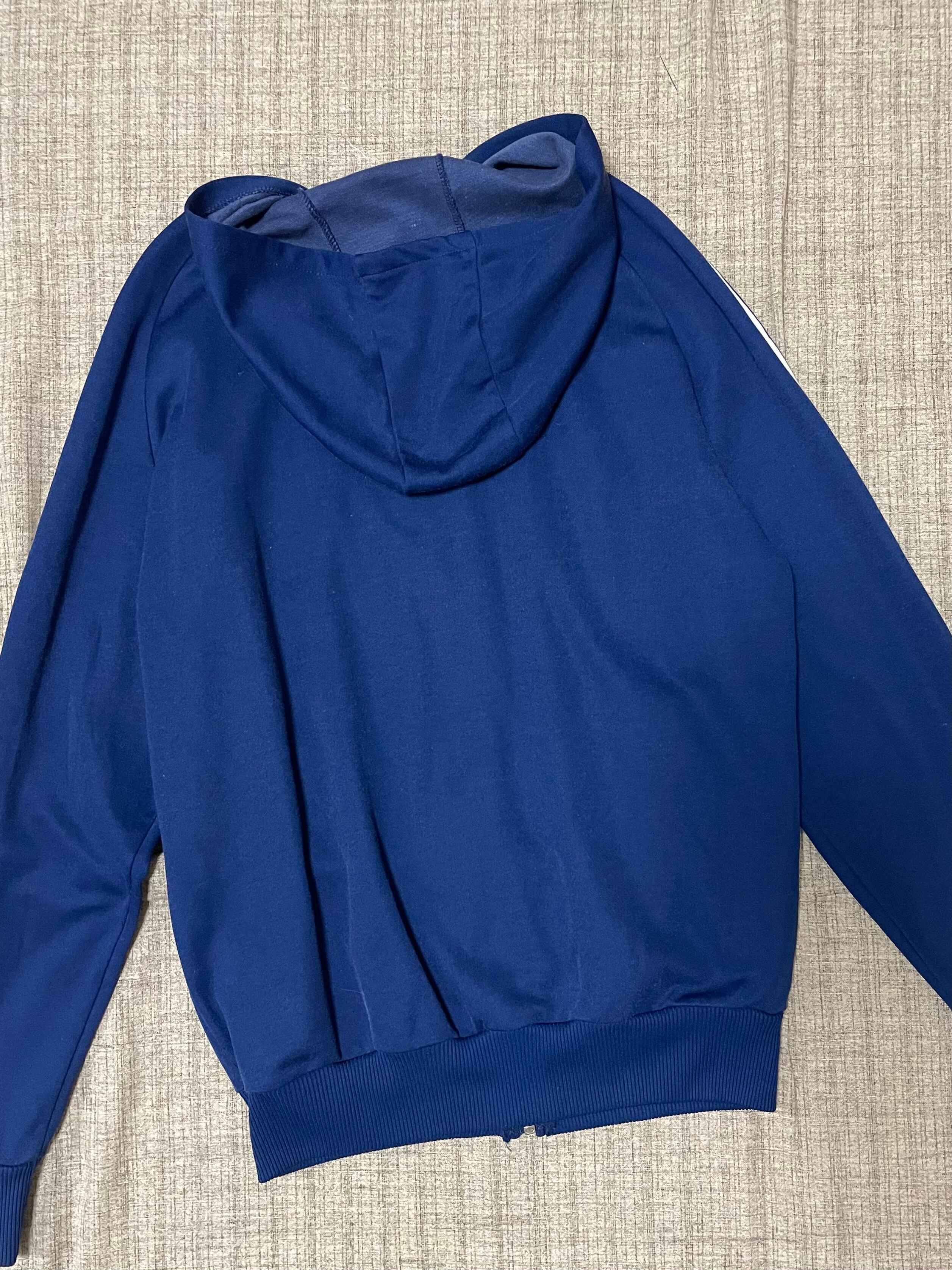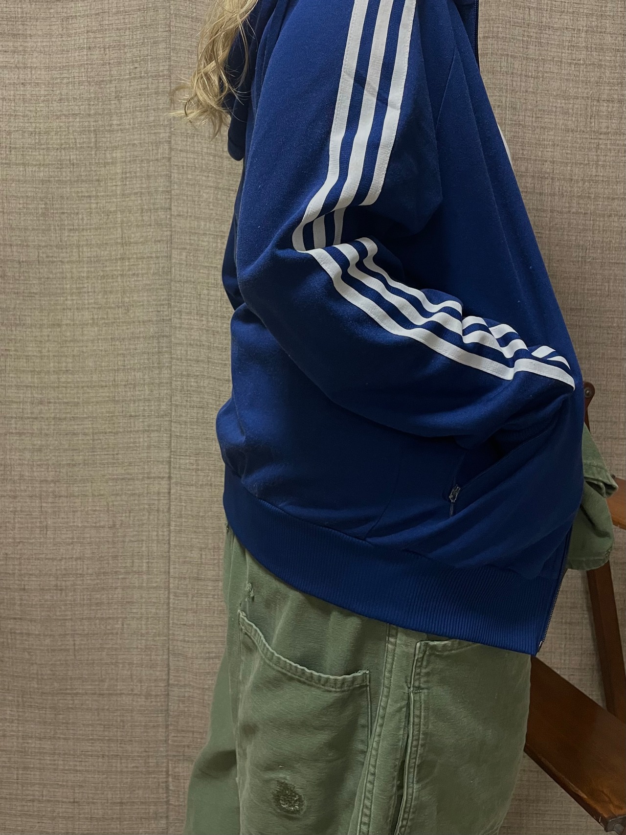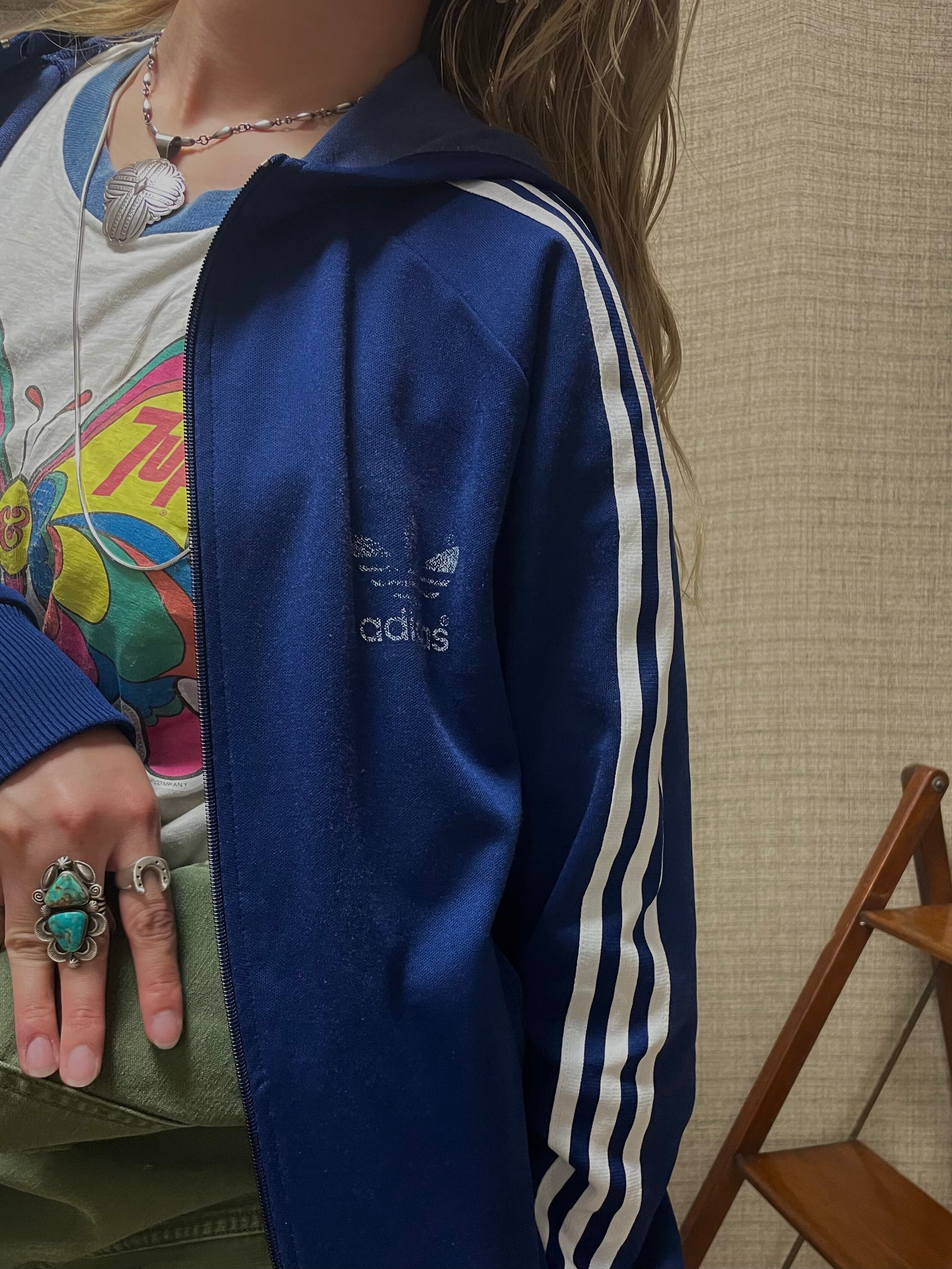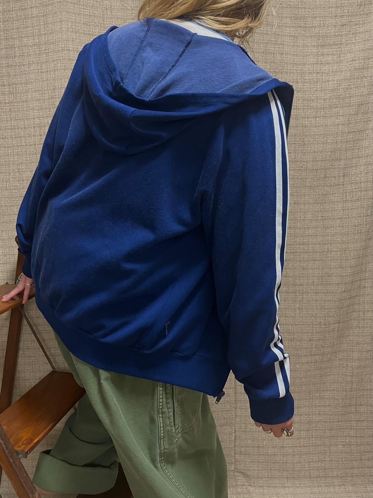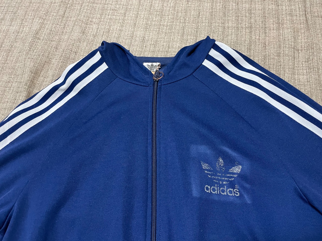 ネイビーボディに白い3本ラインで着回ししやすいアディダスの80sビンテージフード付きトラックジャケット。