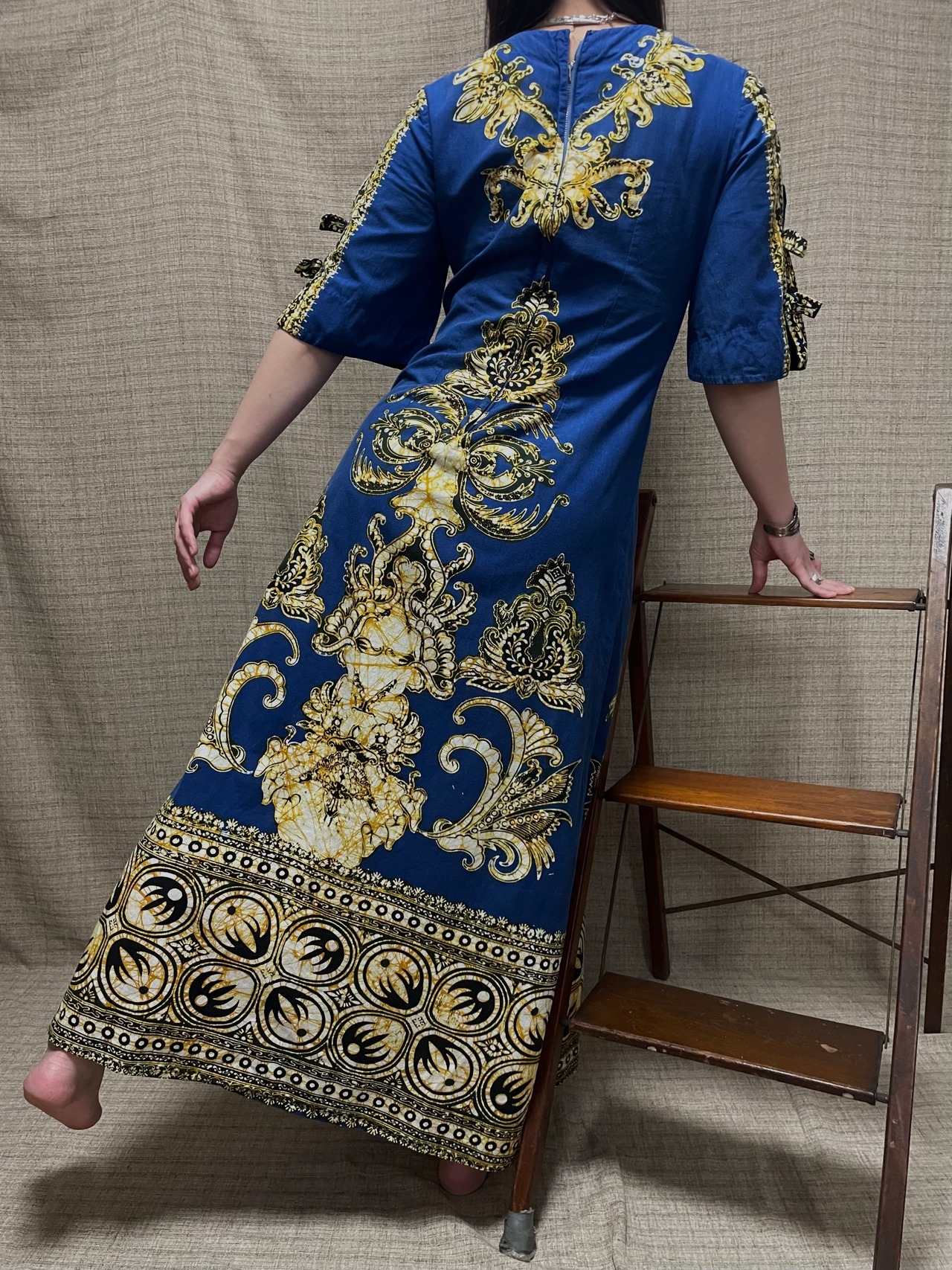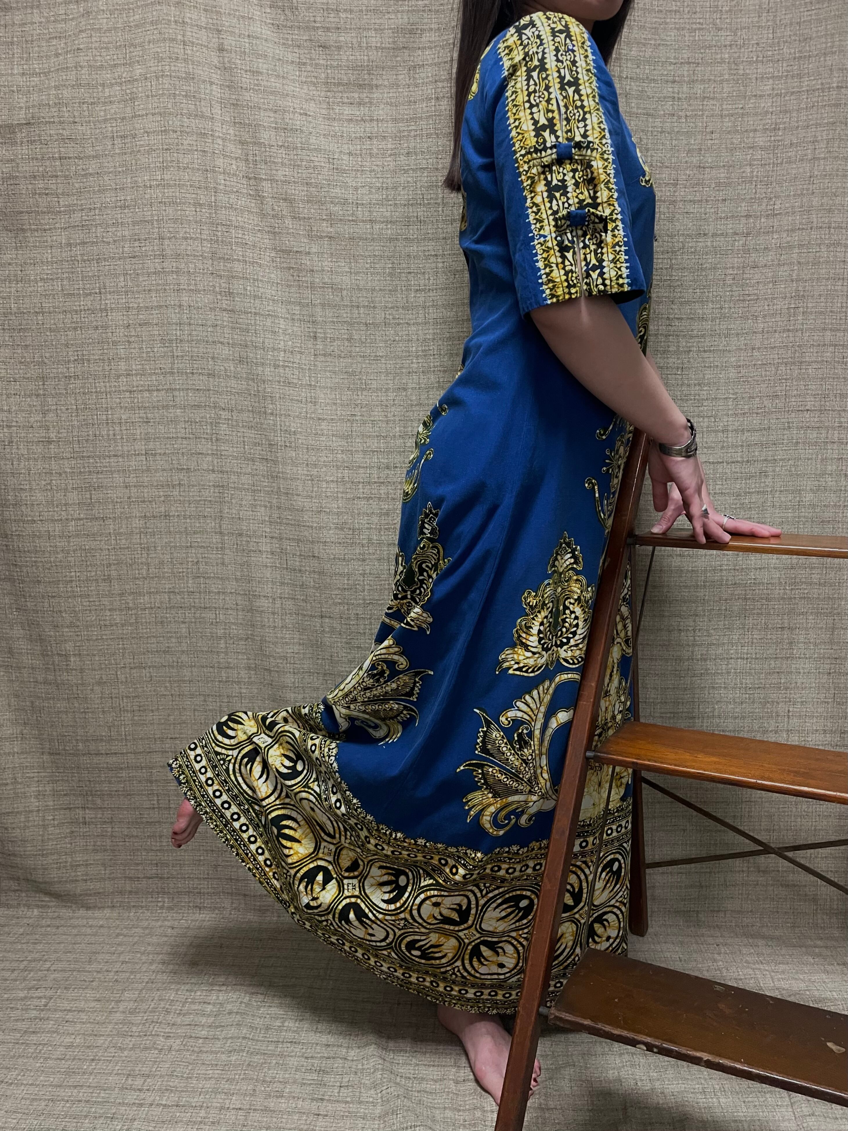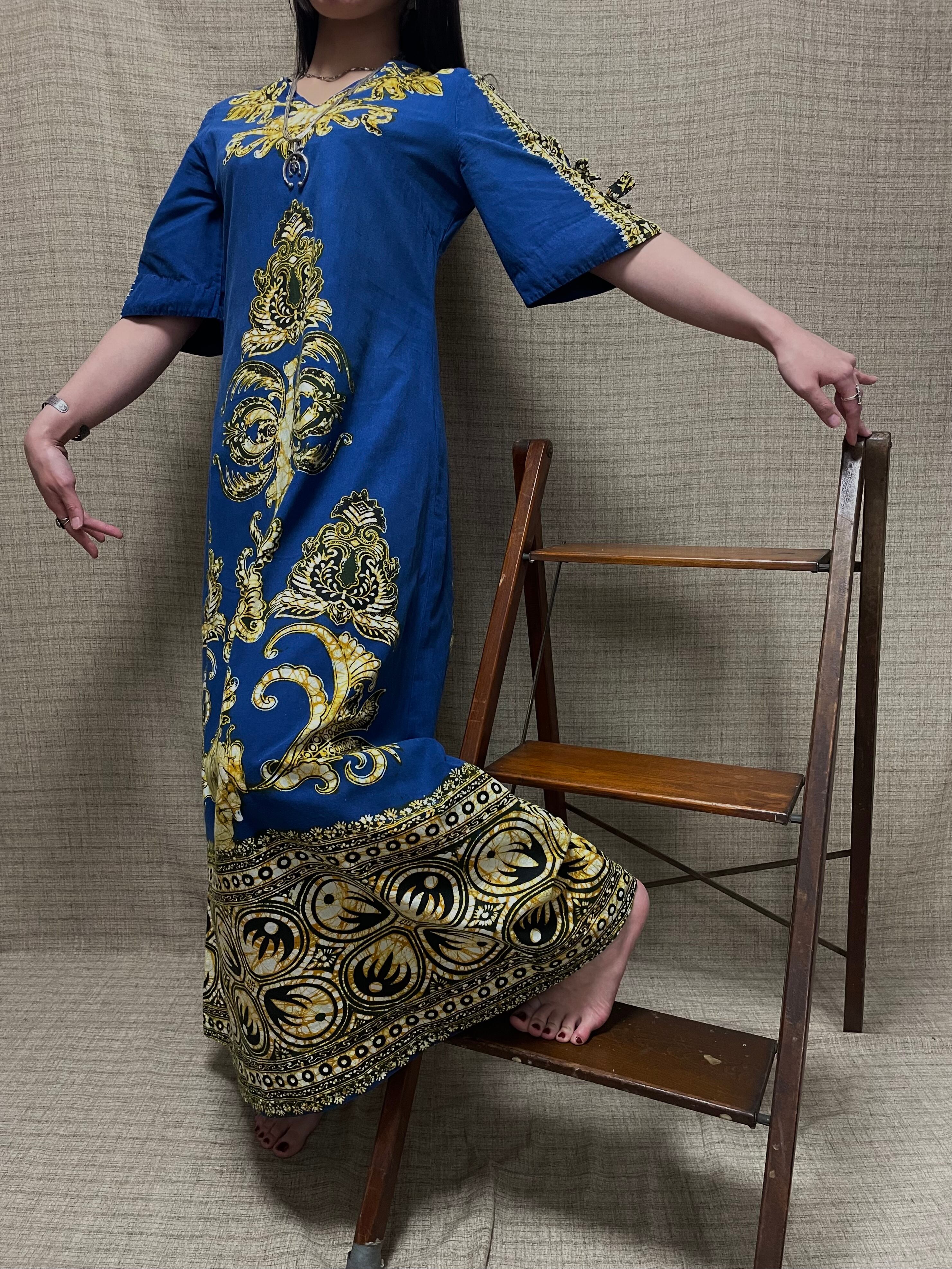 ブルーボディにパワフルなプリントがテンション上がる70sビンテージバティックドレス。