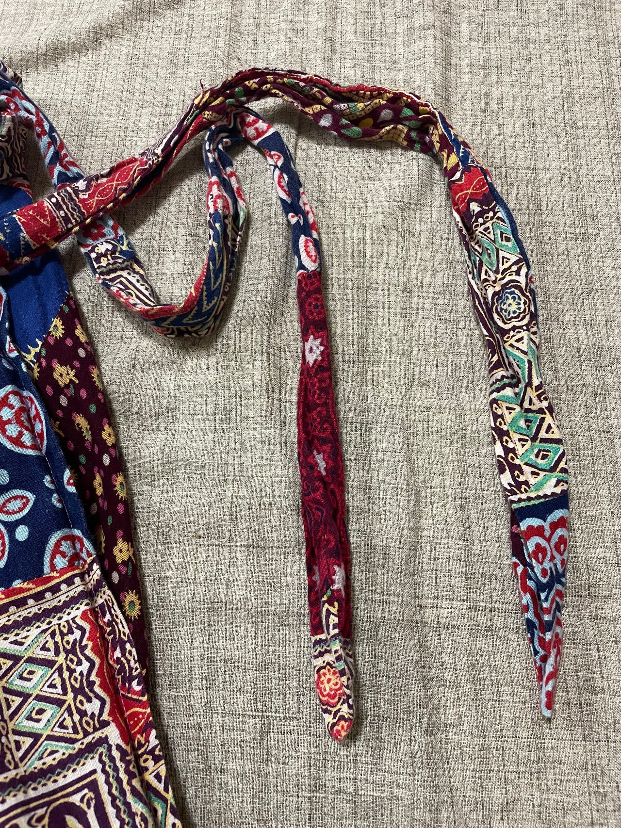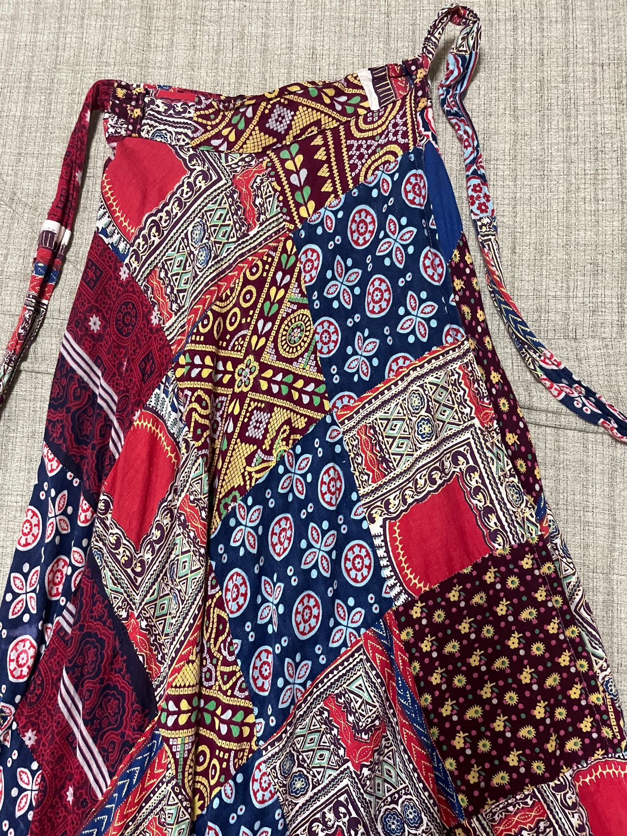 花柄や幾何学柄などの様々な生地を使用した贅沢パッチワークが圧巻なビンテージラップスカート。