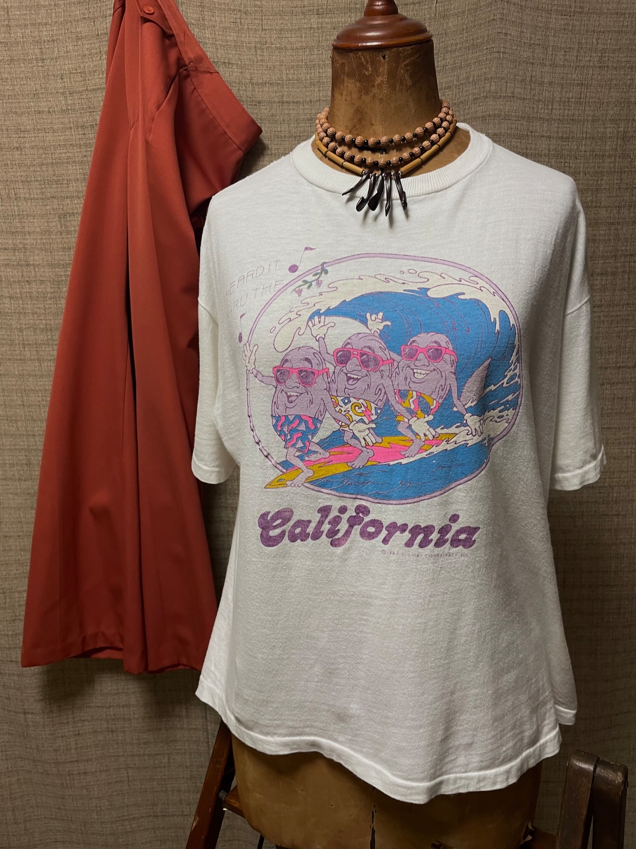 ホワイトボディにカリフォルニアレーズン風のブートプリントが目を惹くビンテージTシャツ。