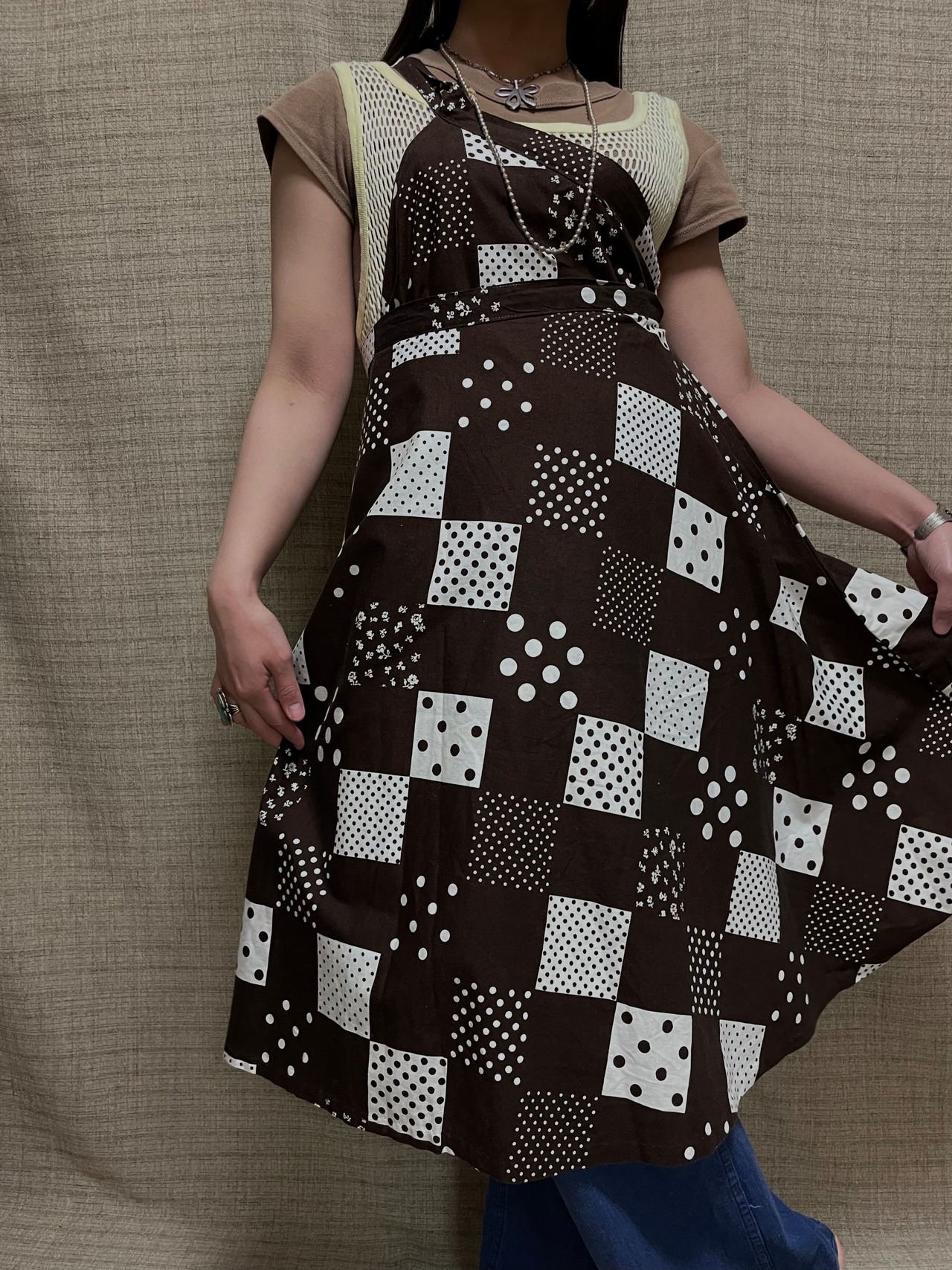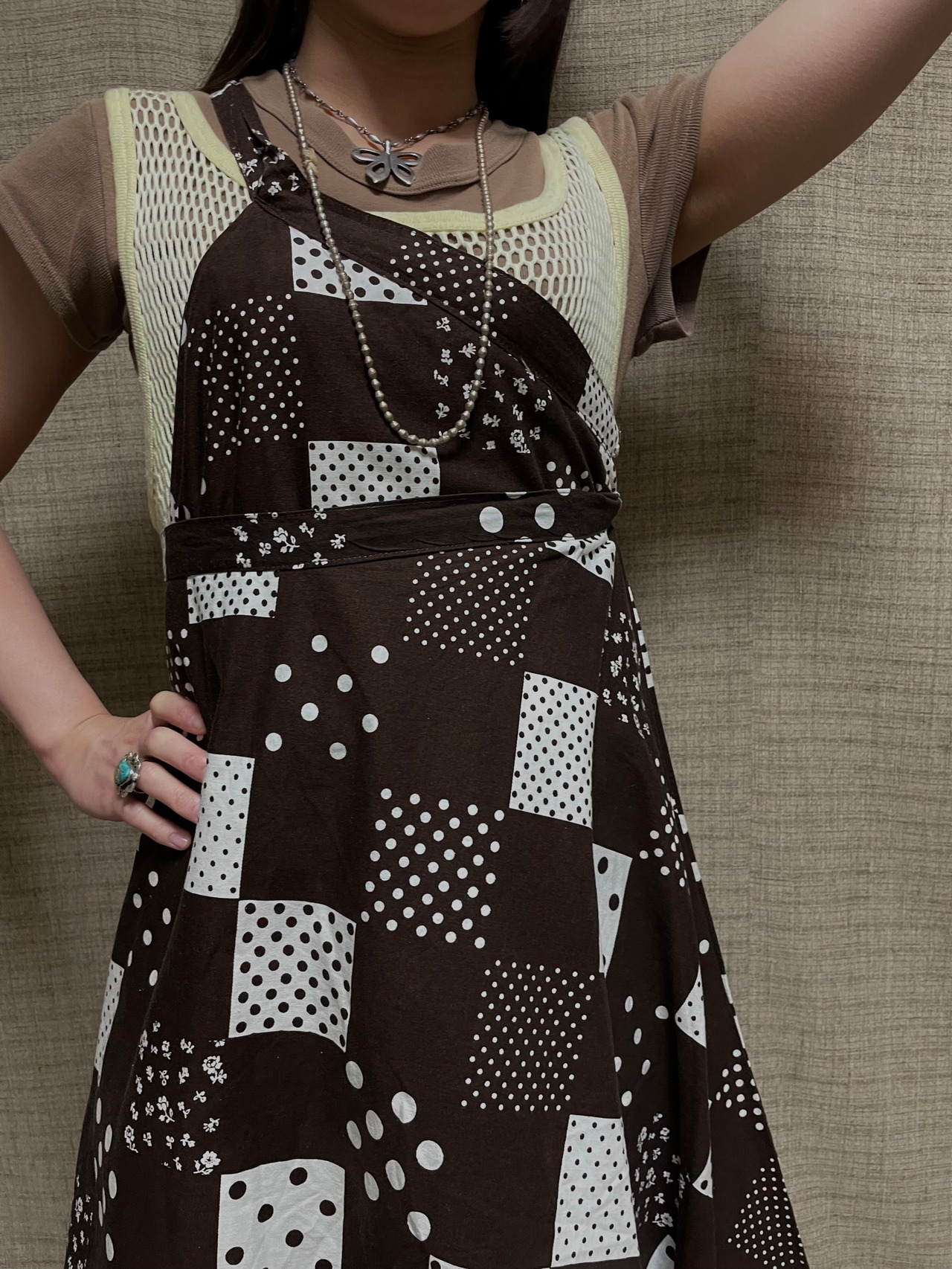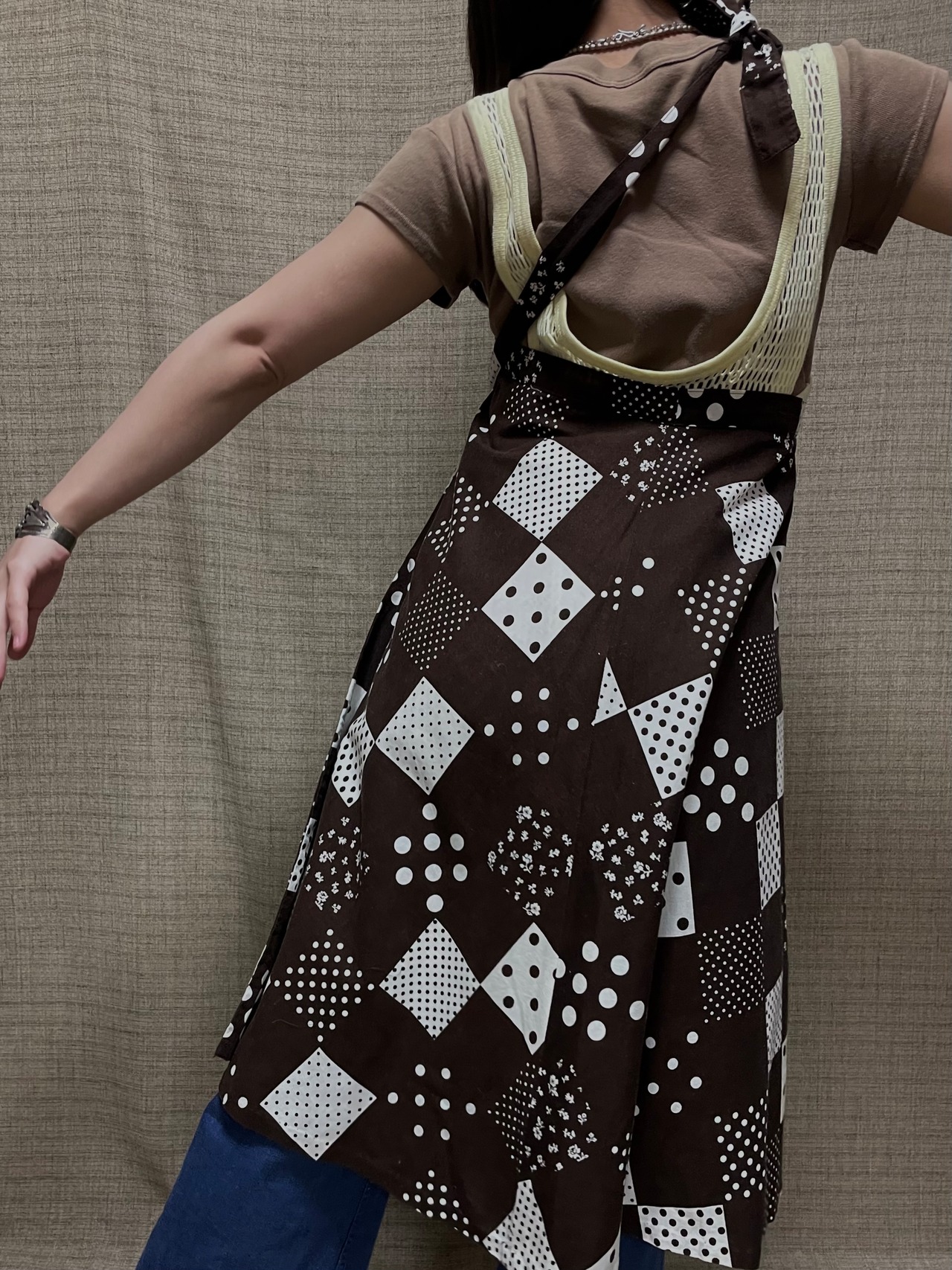 ブラウンボディに小花柄×ドットプリントの生地を使用したパッチワークプリントが可愛いビンテージラップスカート。