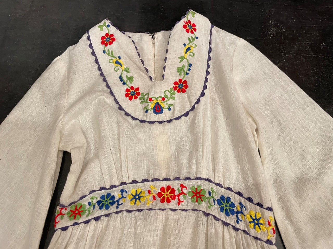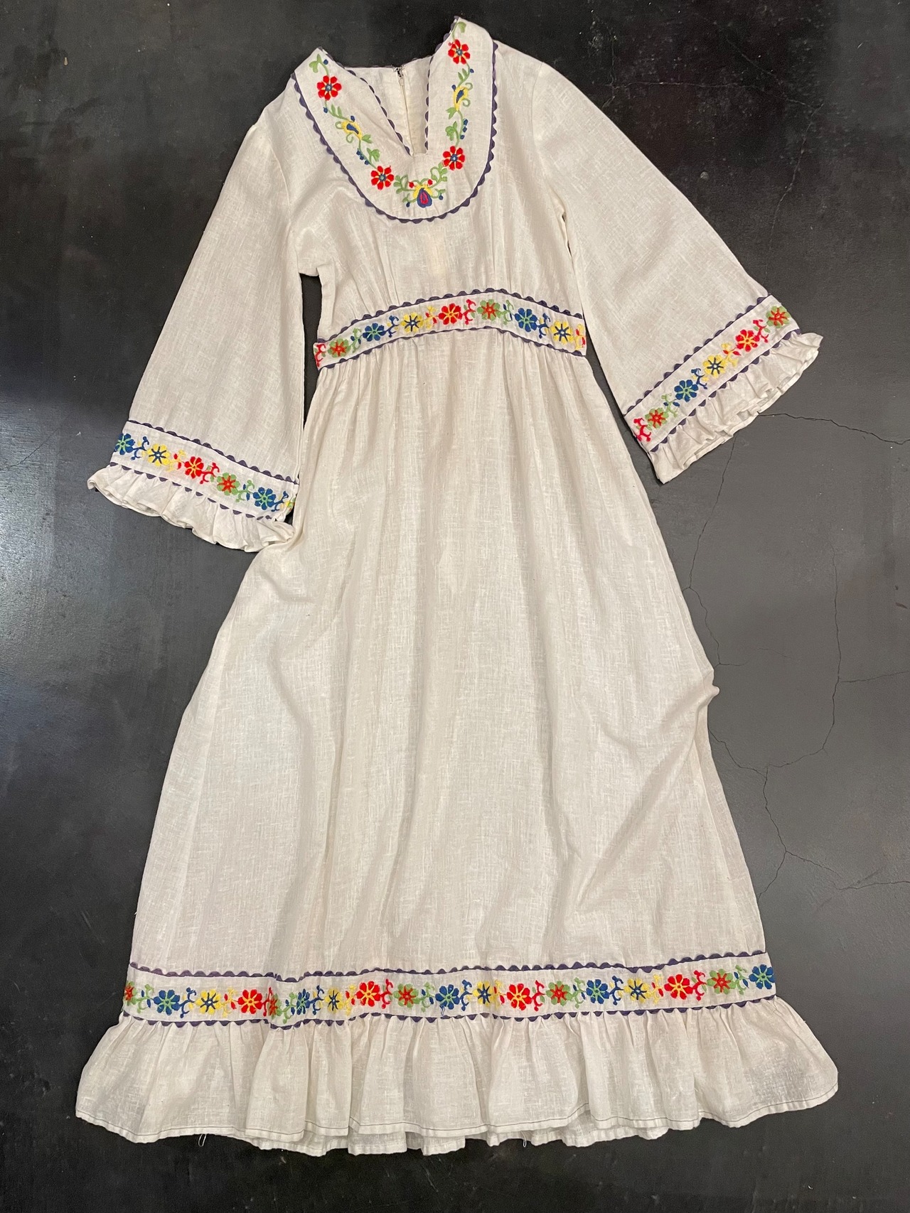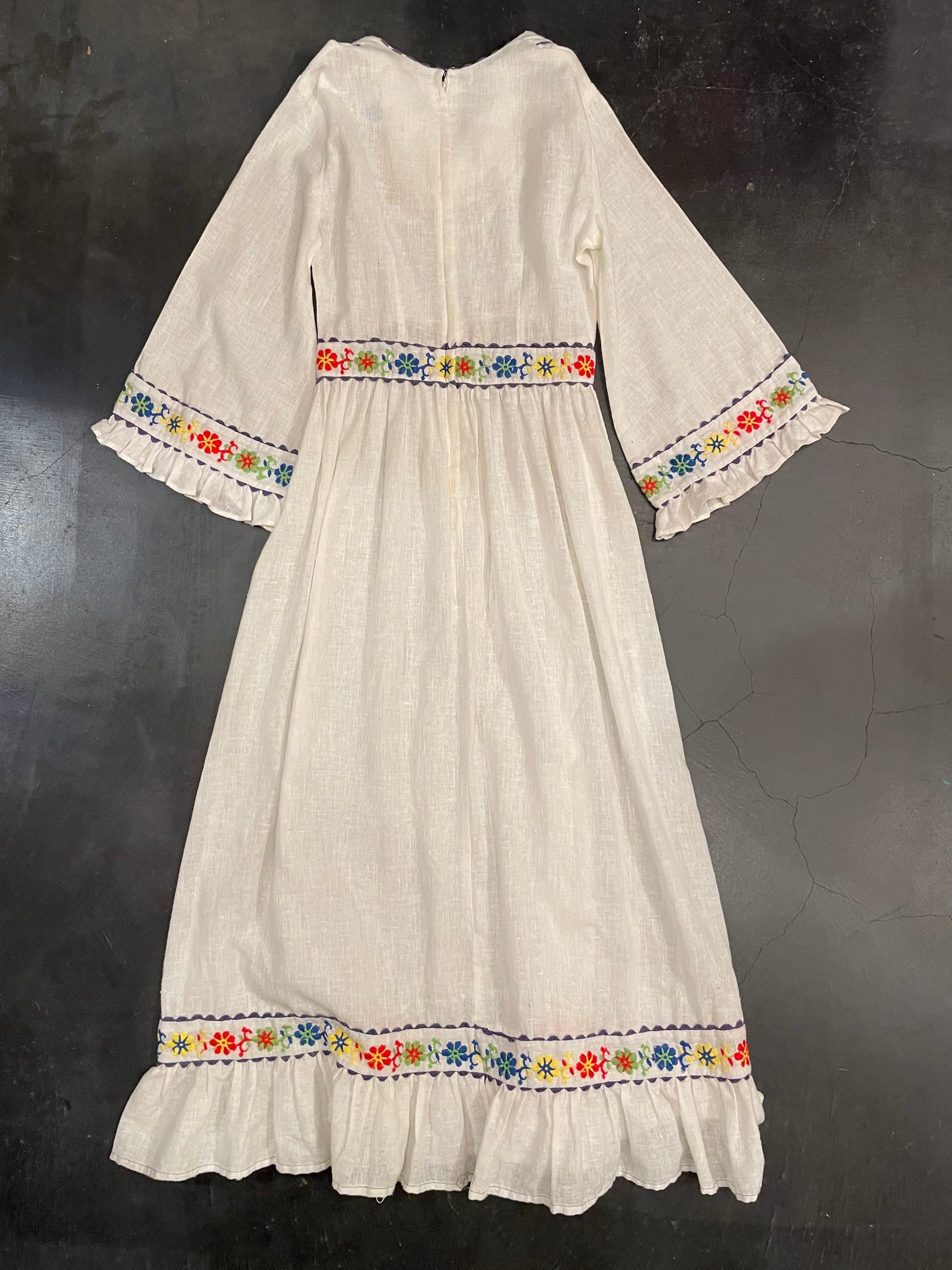 ホワイトボディにカラフルなフラワーステッチがテンション上がる70sビンテージドレス。