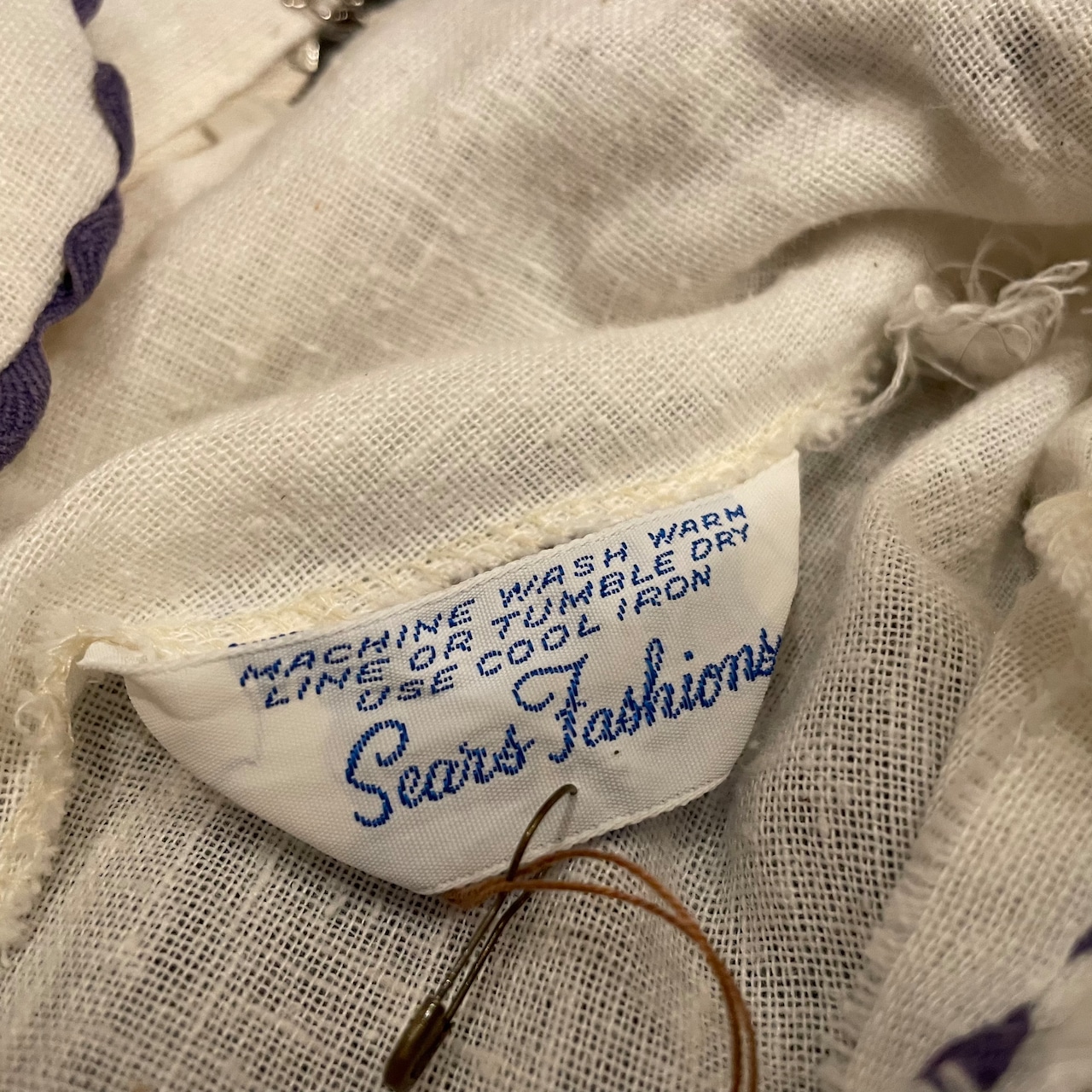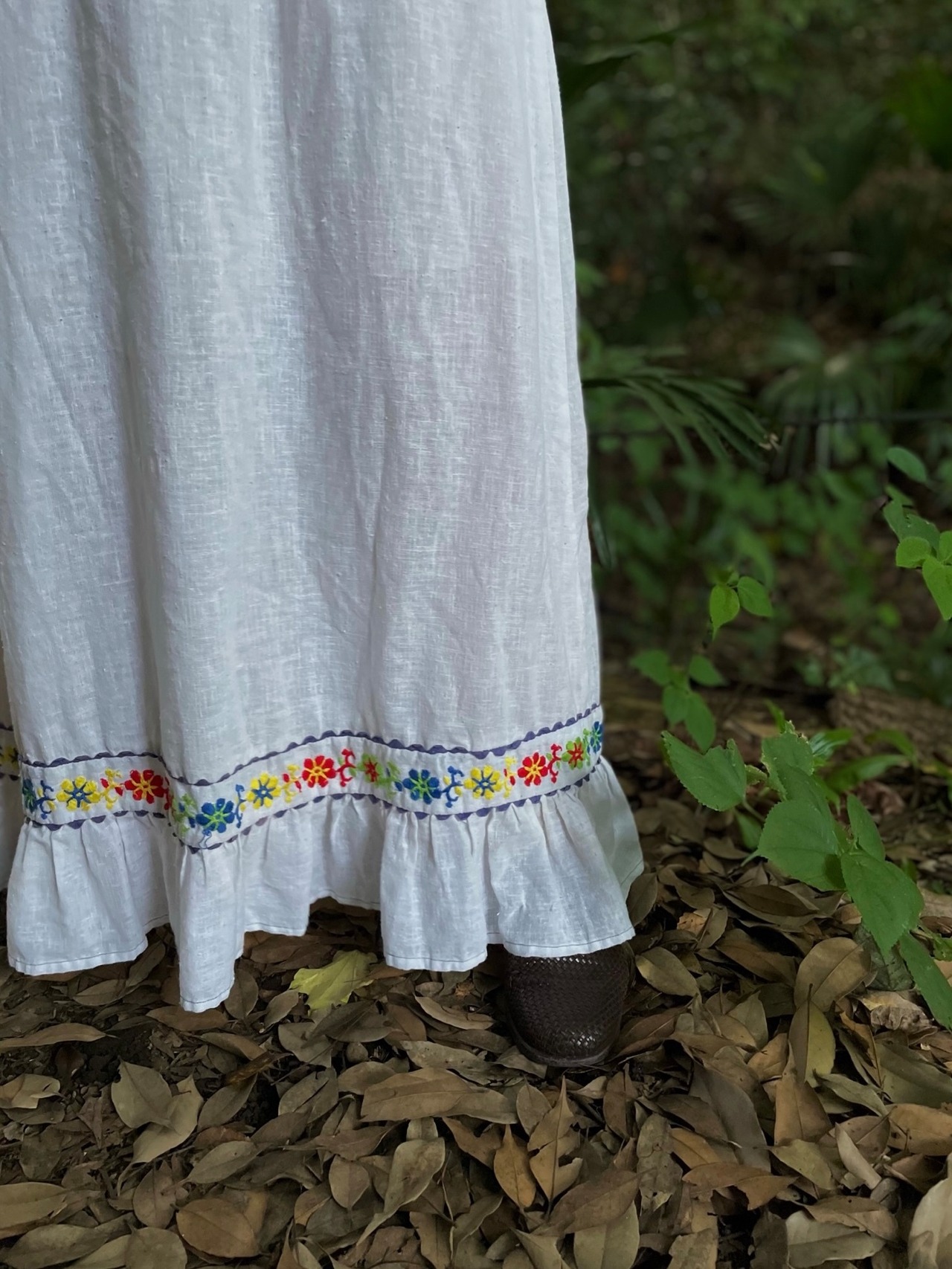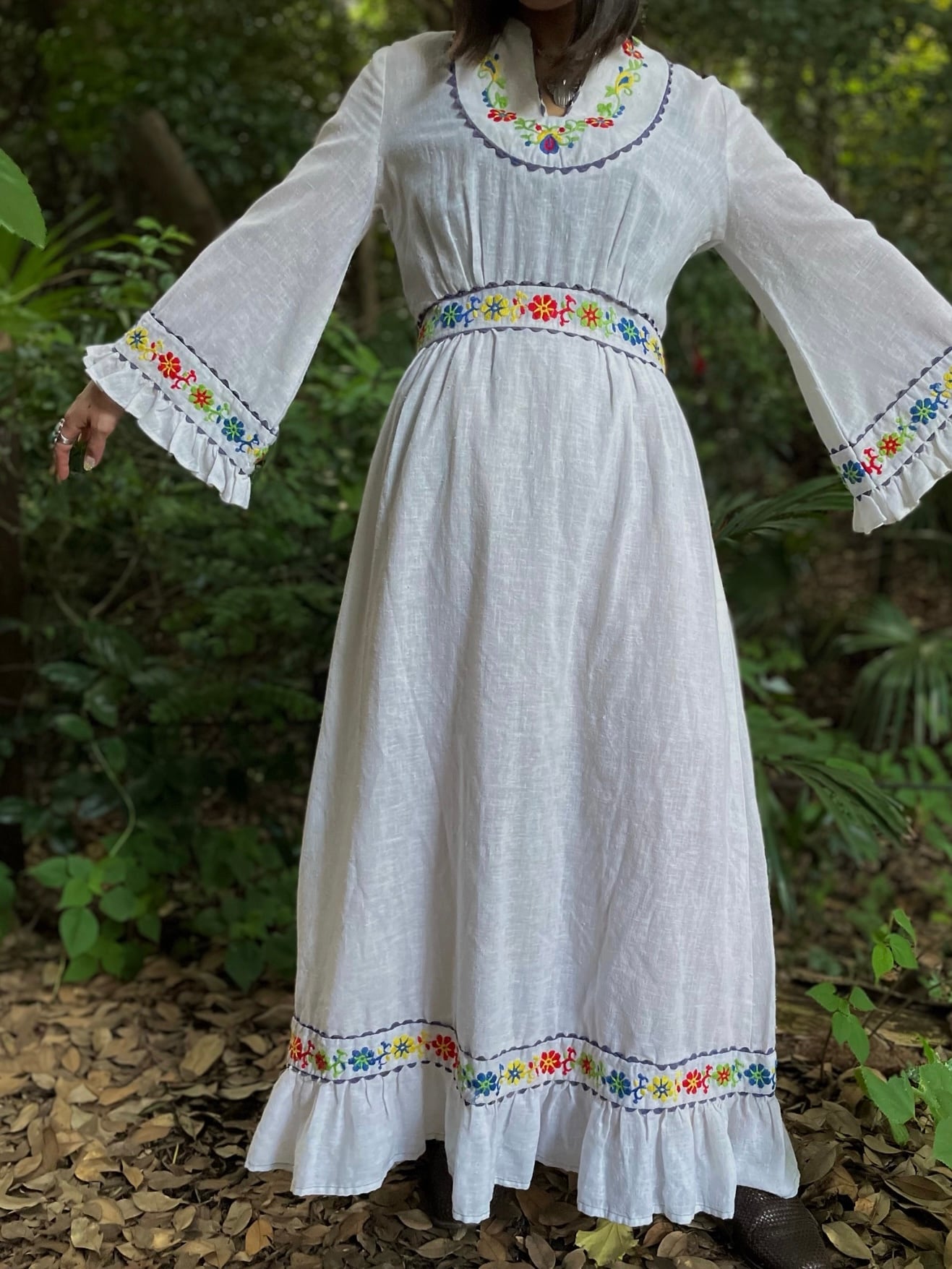 ホワイトボディにカラフルなフラワーステッチがテンション上がる70sビンテージドレス。