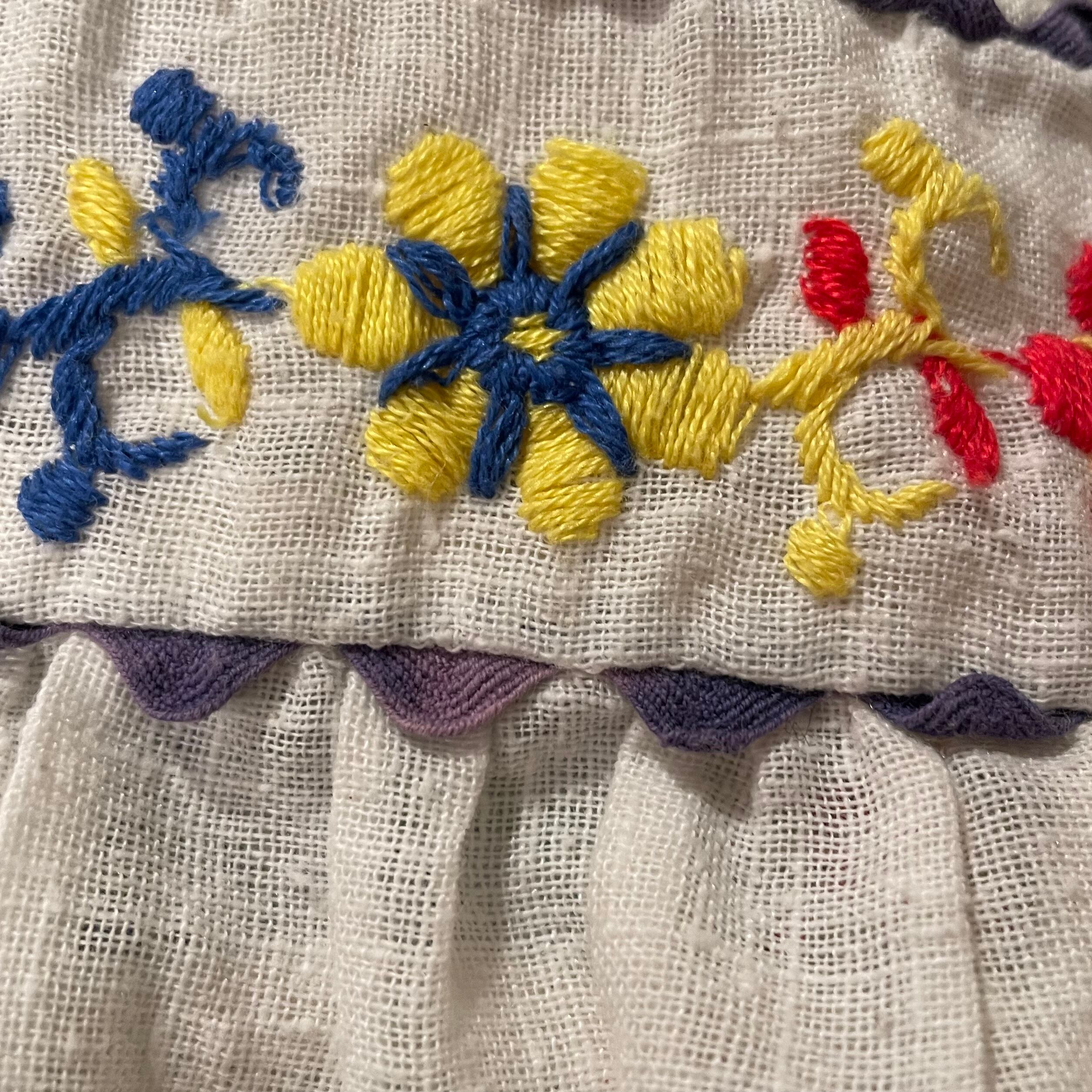 着心地の良いガーゼのようなボディに、この時代らしいカラフルな刺繍と、切り替え箇所にはヤマミチテープが施されアクセントに◎