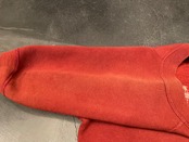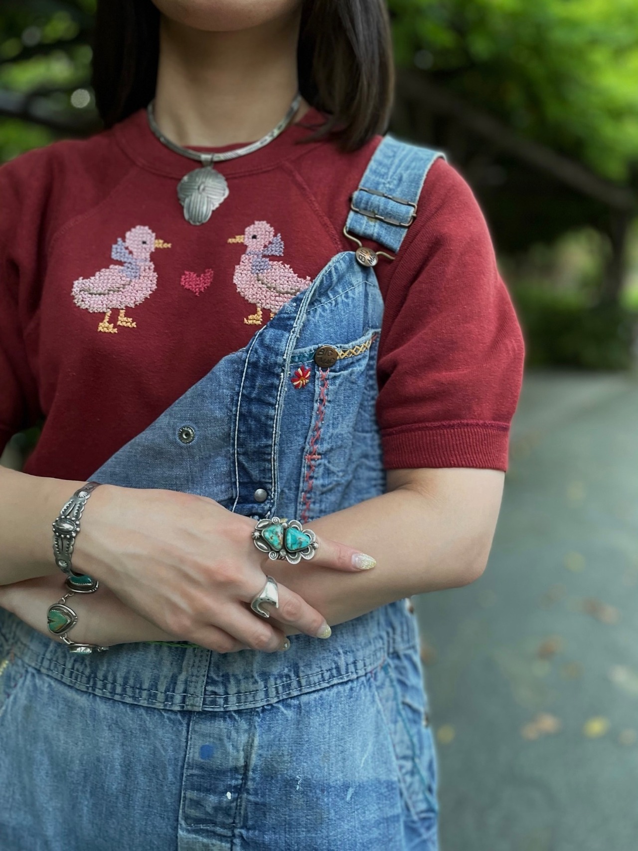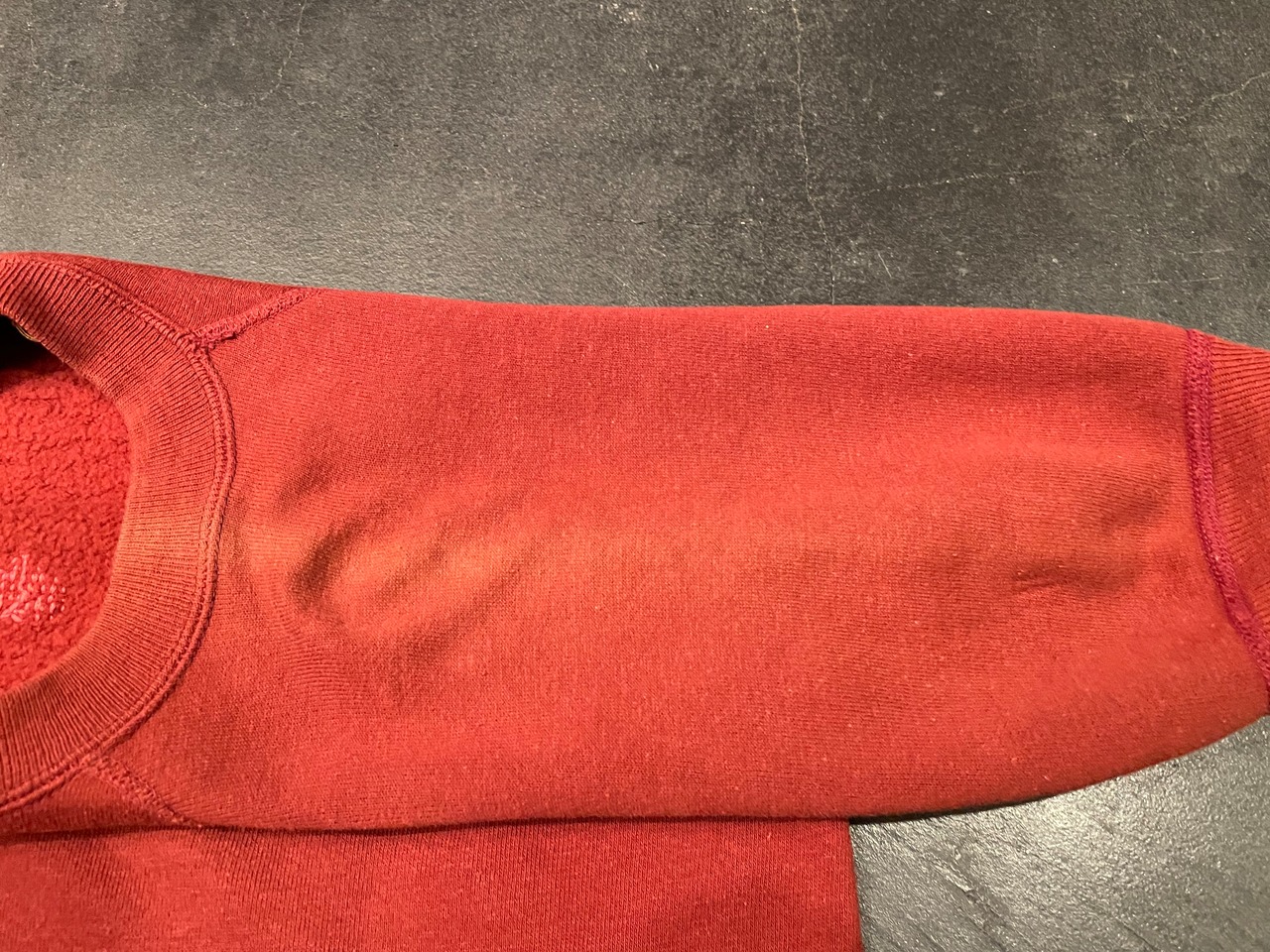フェードがかったエンジボディに、目を惹くアヒルのハンドステッチが施されたビンテージスウェット。