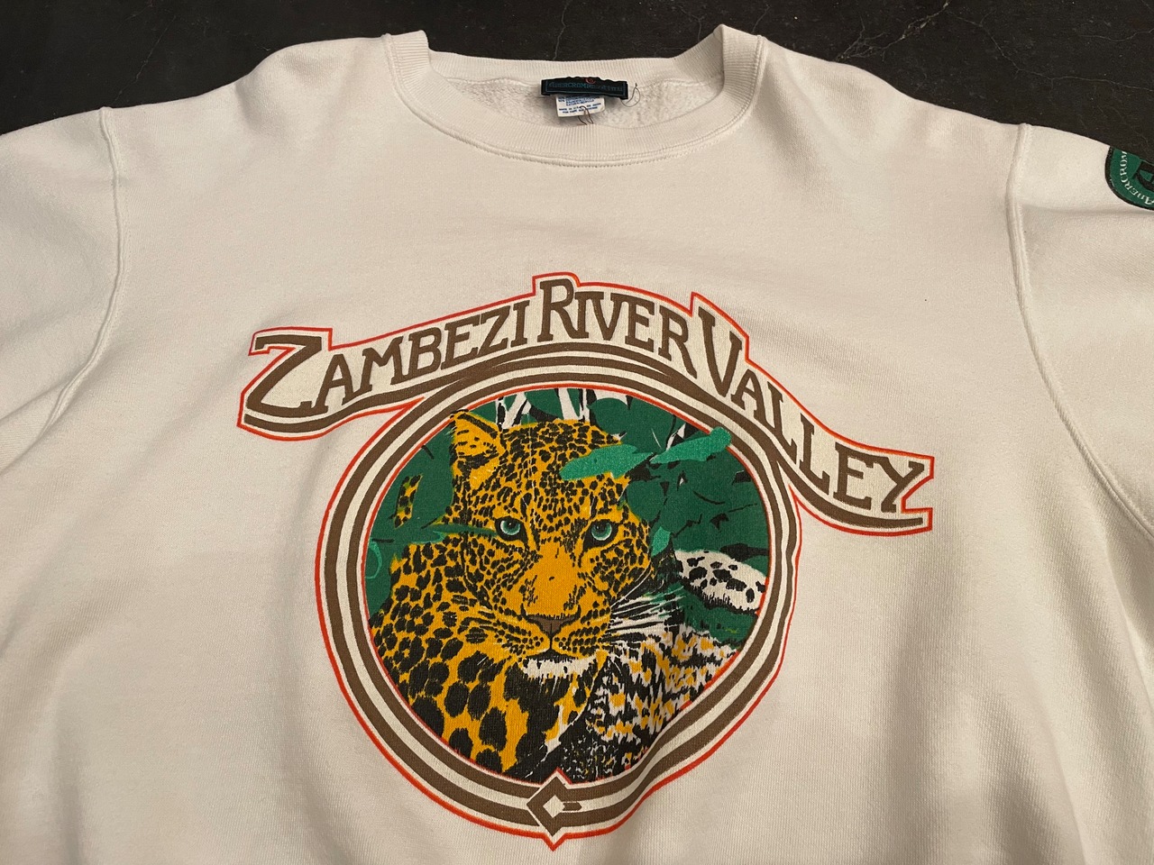 ホワイトボディに、インパクトのあるタイガープリントが目を惹くビンテージスウェット。