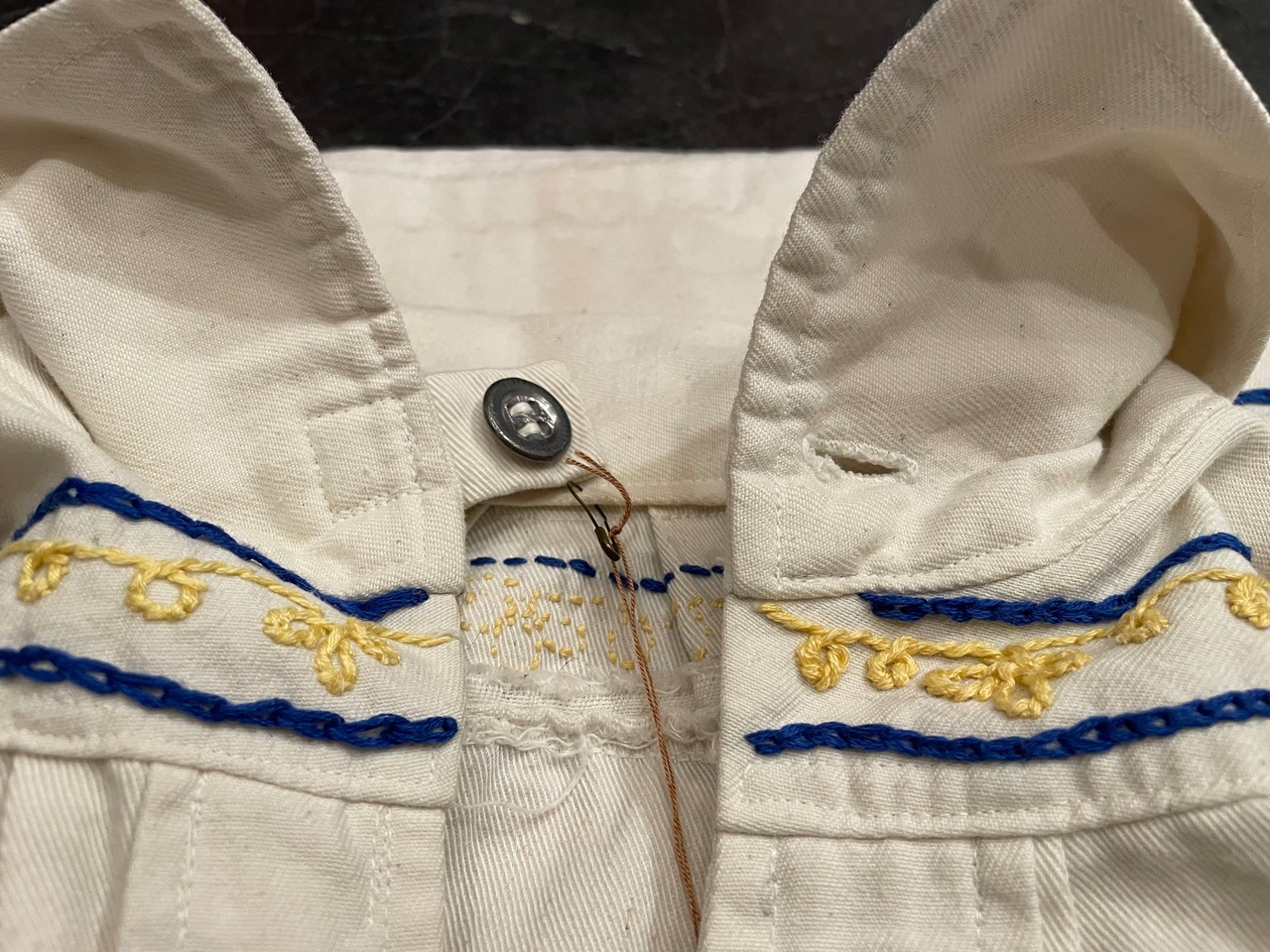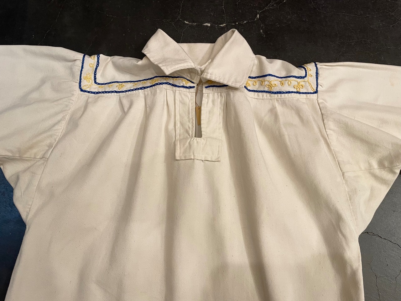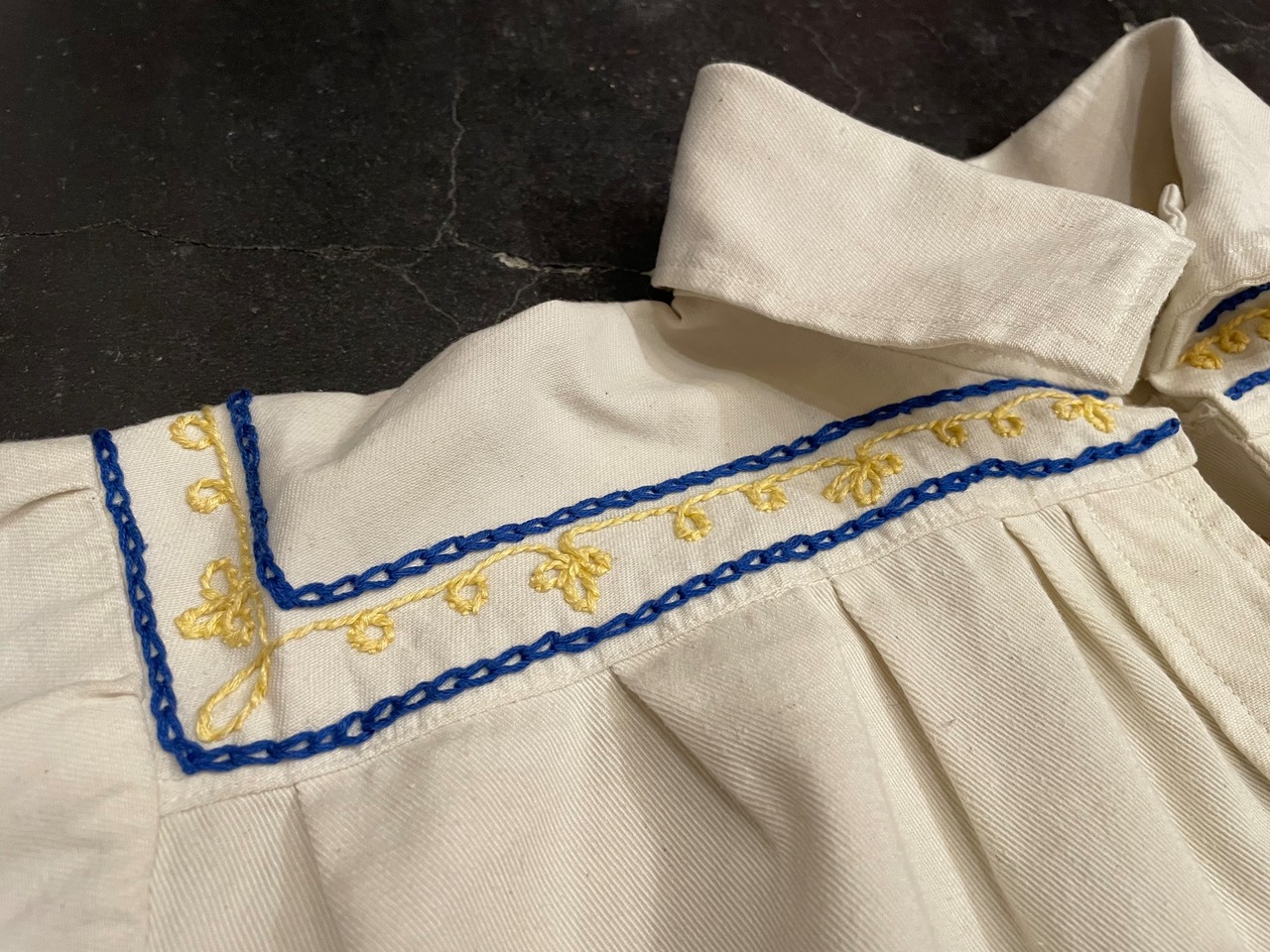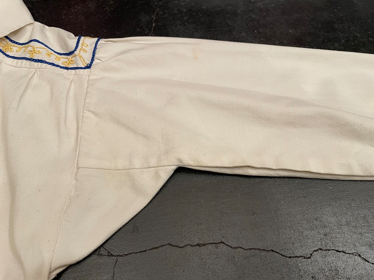 しっかりとした生地感のオフホワイトボディに雰囲気抜群な刺繍が施されたビンテージチャーチスモック。