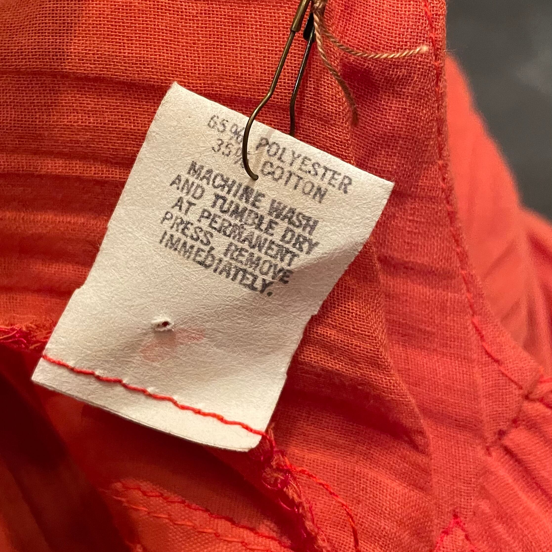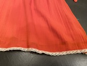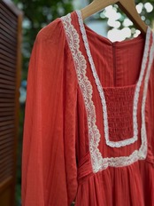絶妙なテラコッタカラーのプレーンボディにフロントのシャーリングや、細部のレース装飾がテンション上がる70sビンテージドレス。