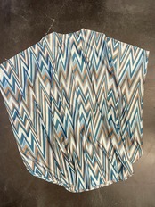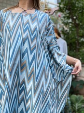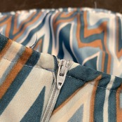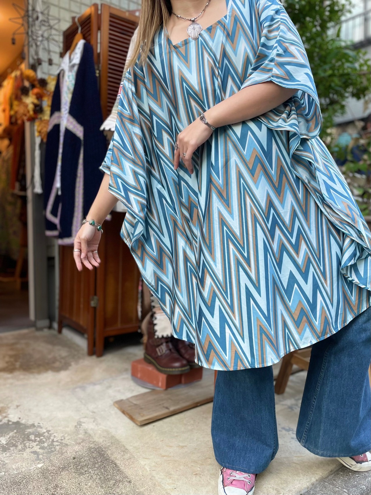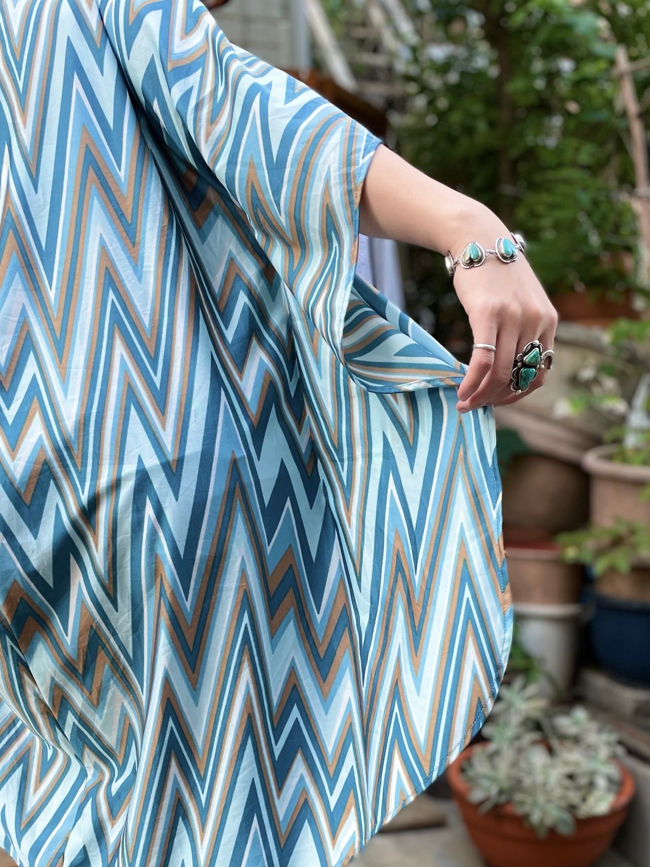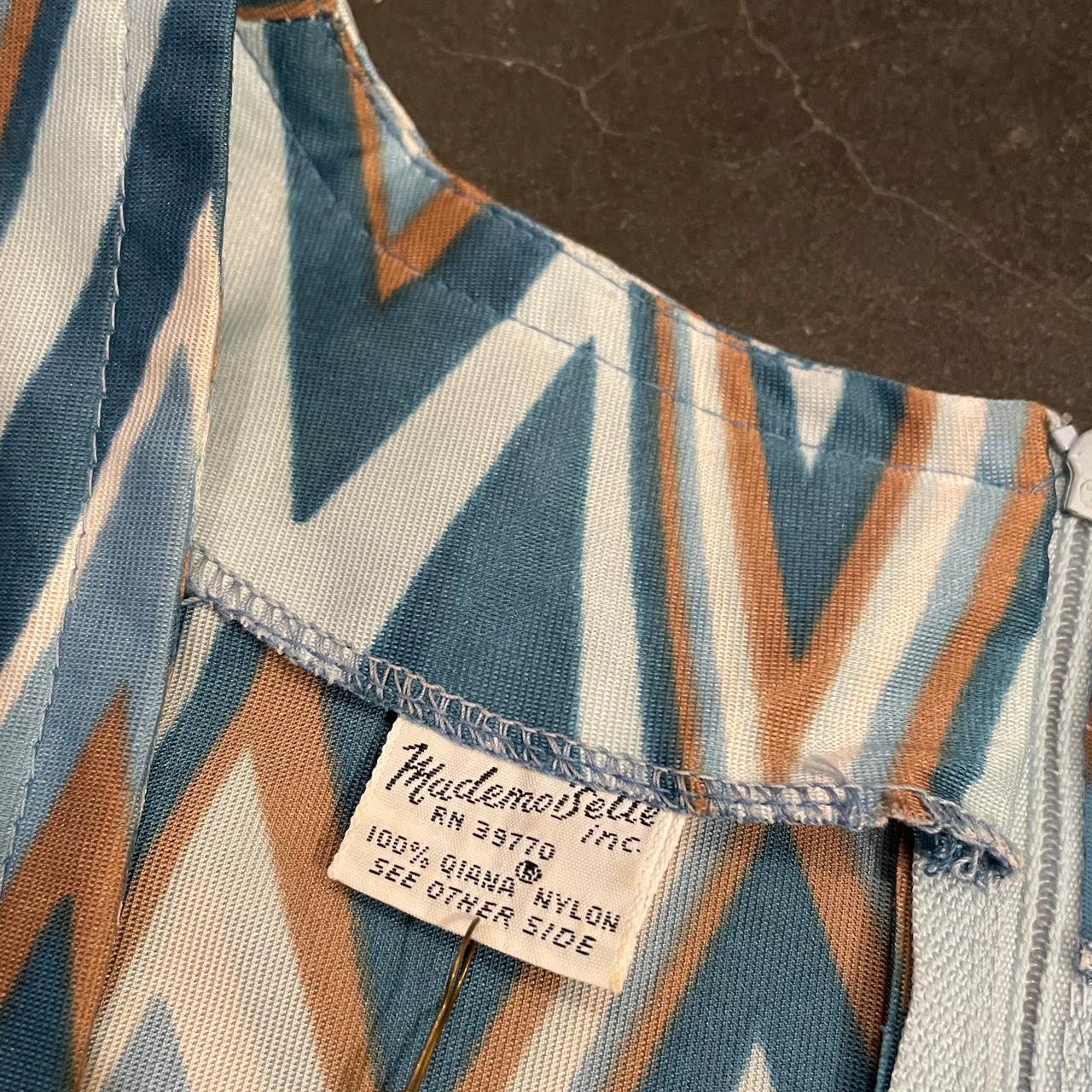 サックス×くすみブルー×ブラウンのジオメトリックパターンがテンション上がる70sビンテージドレス。