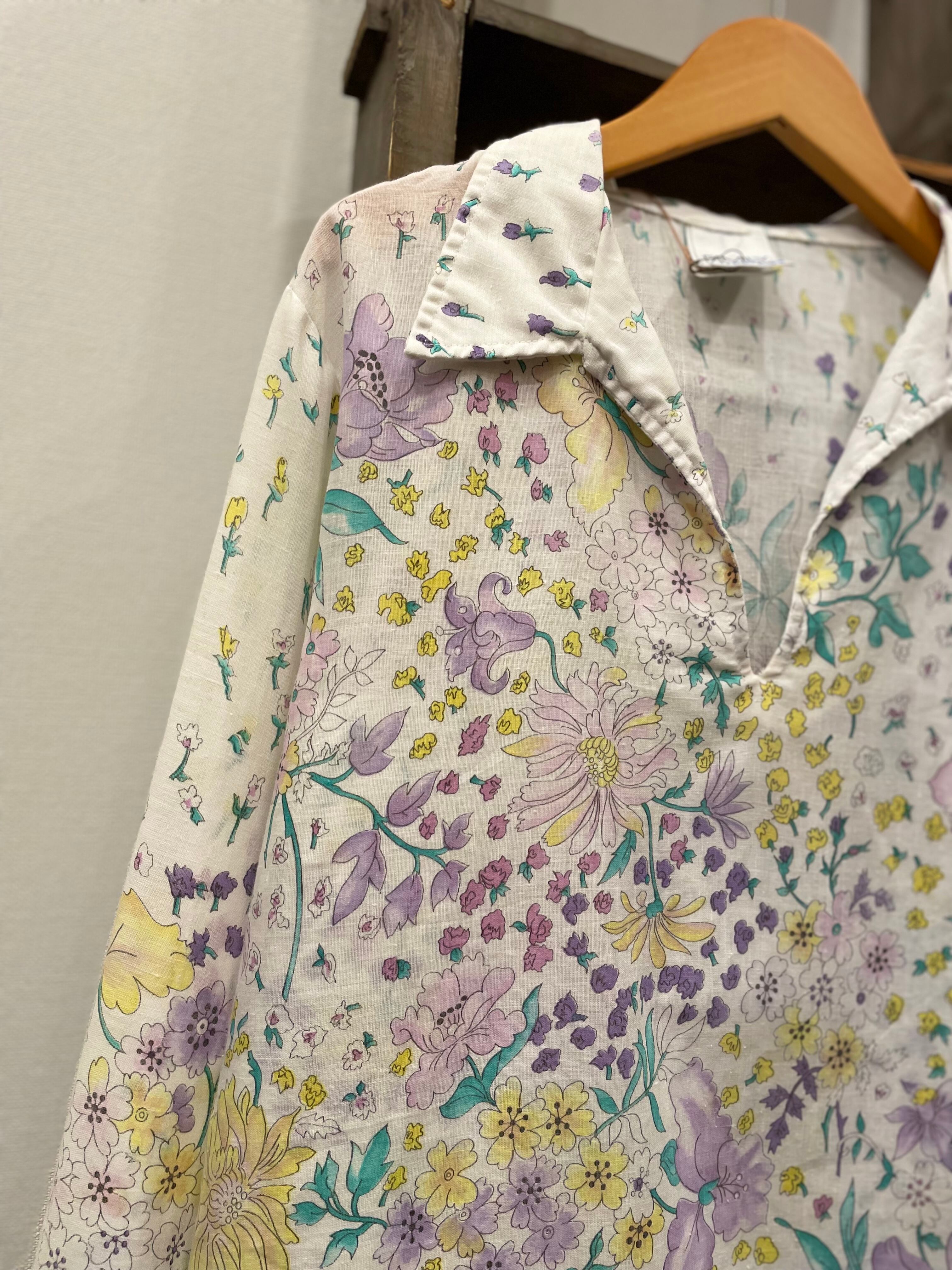 ホワイトボディに、繊細なタッチで描かれたフラワープリントが素敵な70sビンテージプルオーバー。