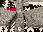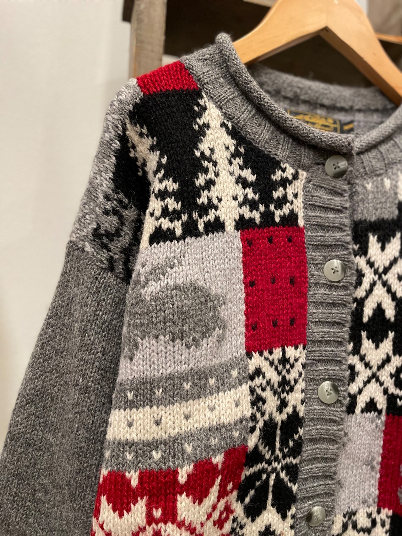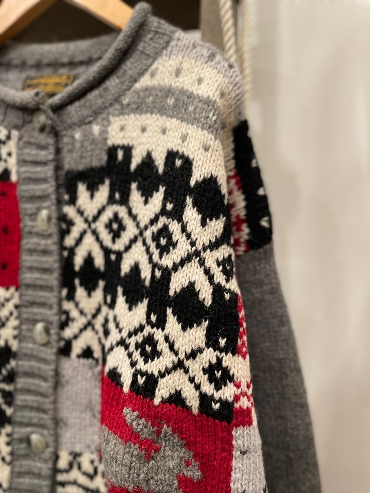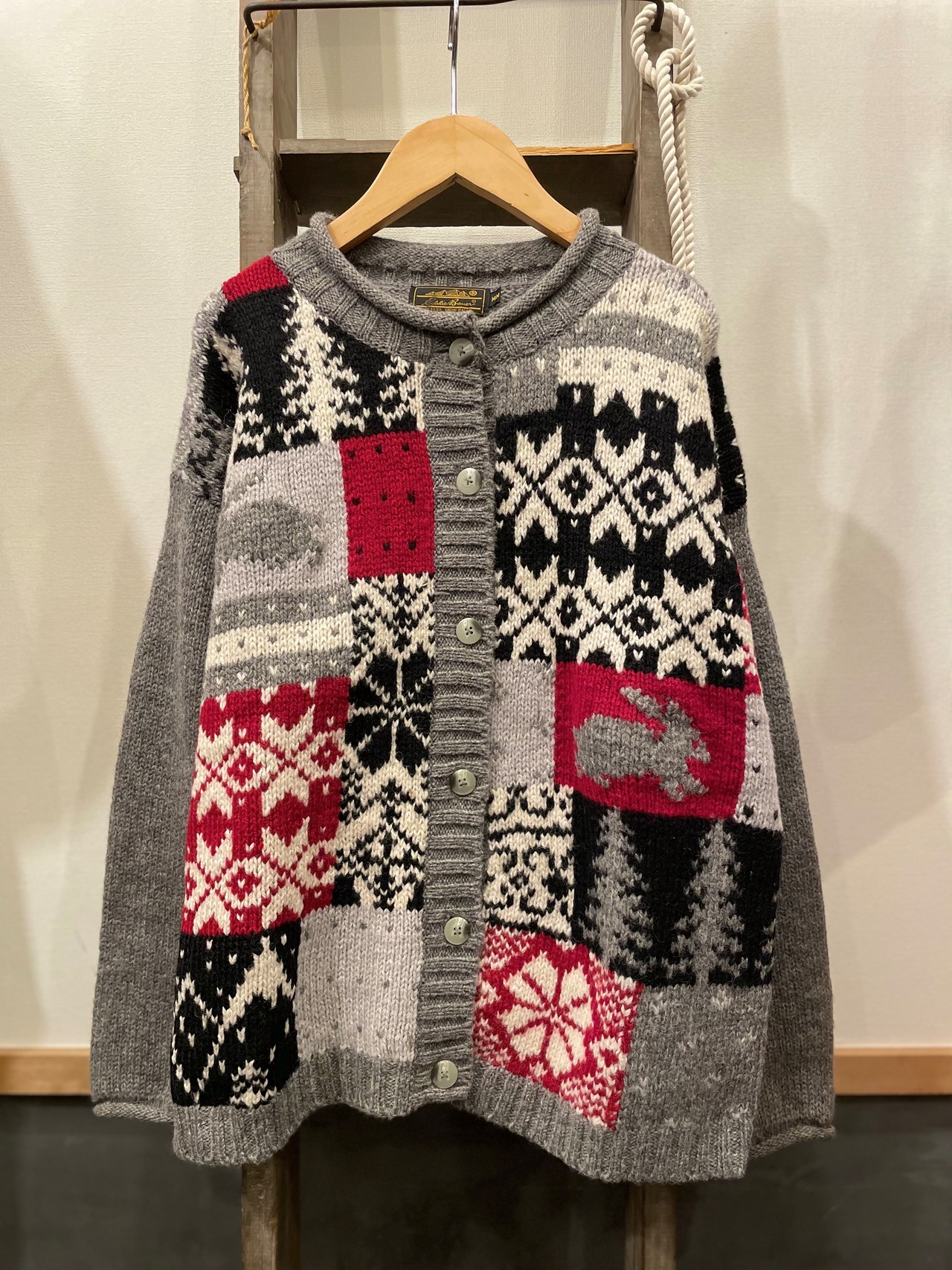 グレーボディに雪結晶やウサギのデザインが可愛らしいエディーバウアーのビンテージニットカーディガン。
