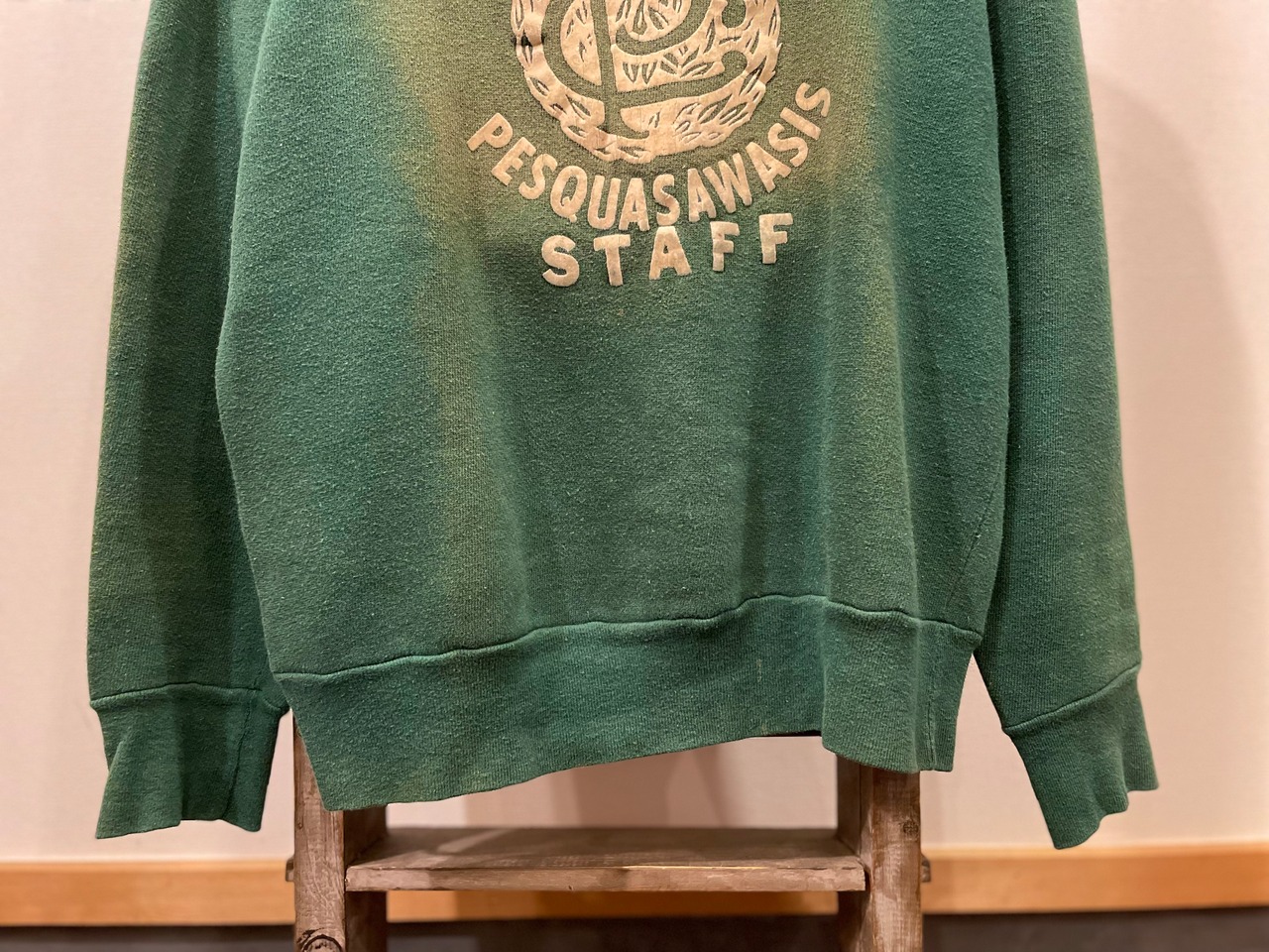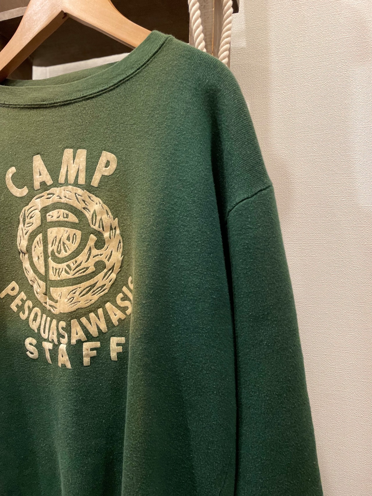 フロントには camp pesquasawasis staff のフロッキープリントが施され、フロッキー部分にも経年変化が伺えて一味違います。