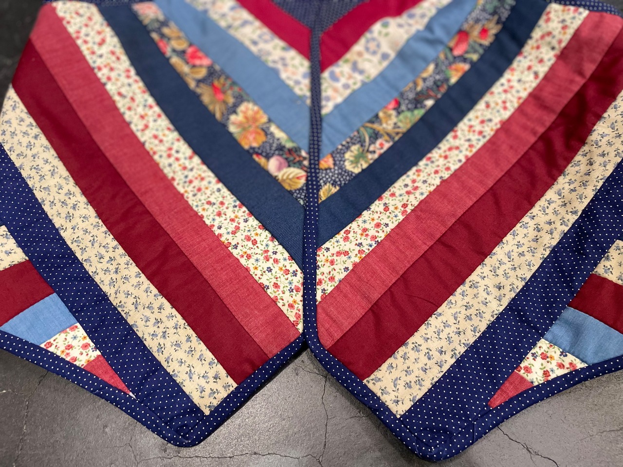 背中はひし形のようなモチーフのパッチワークで、真ん中にはフラワーステッチが施された手の込んだデザイン。