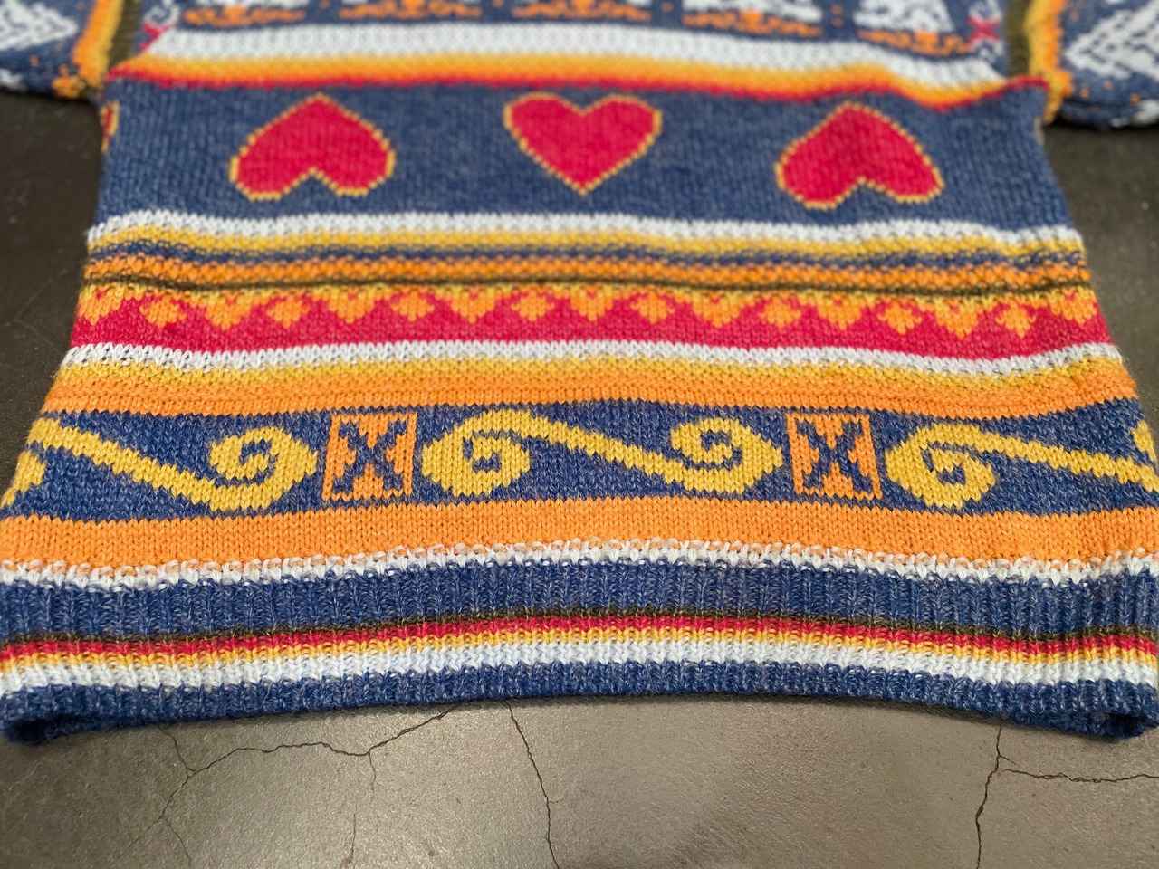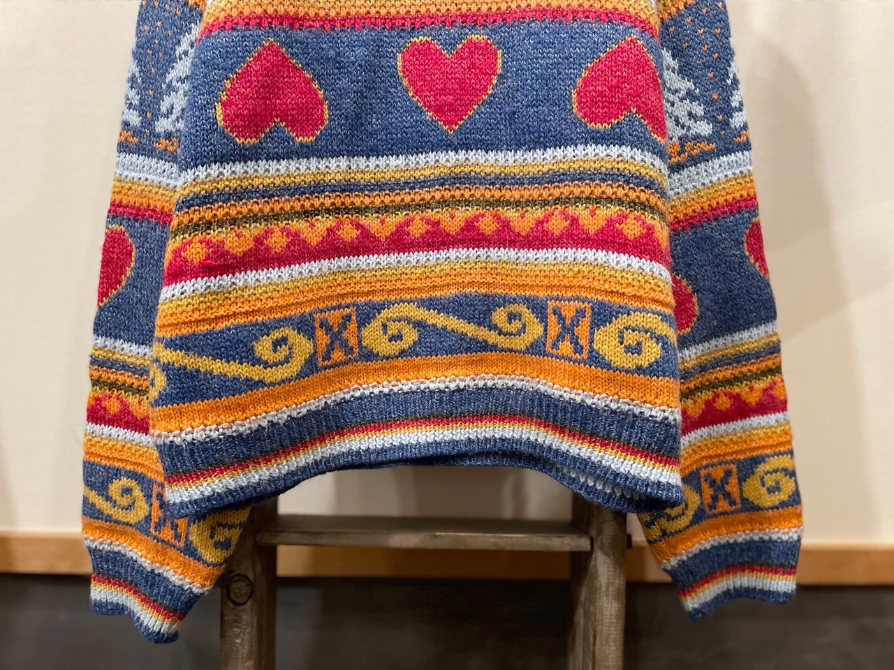 くすみブルーボディにカラフルデザインが素敵なビンテージタートルニット。