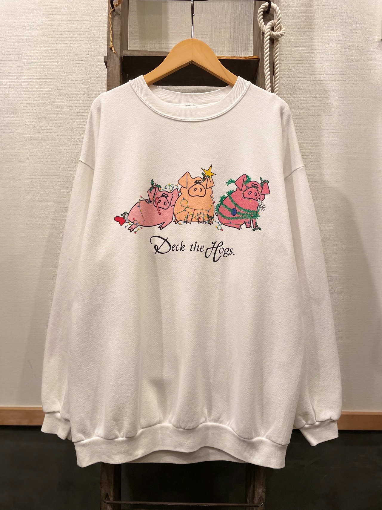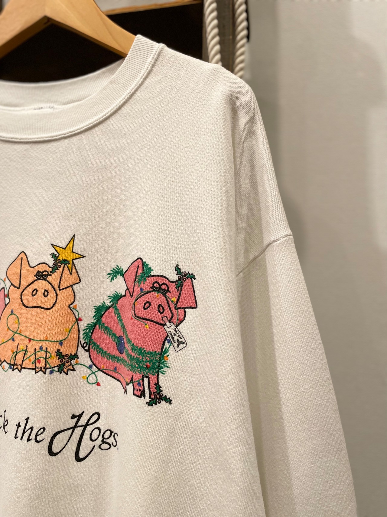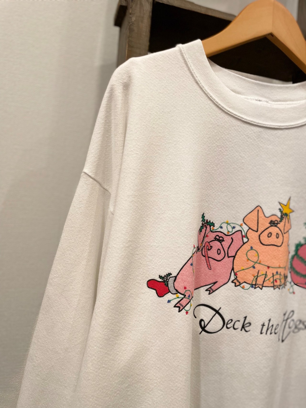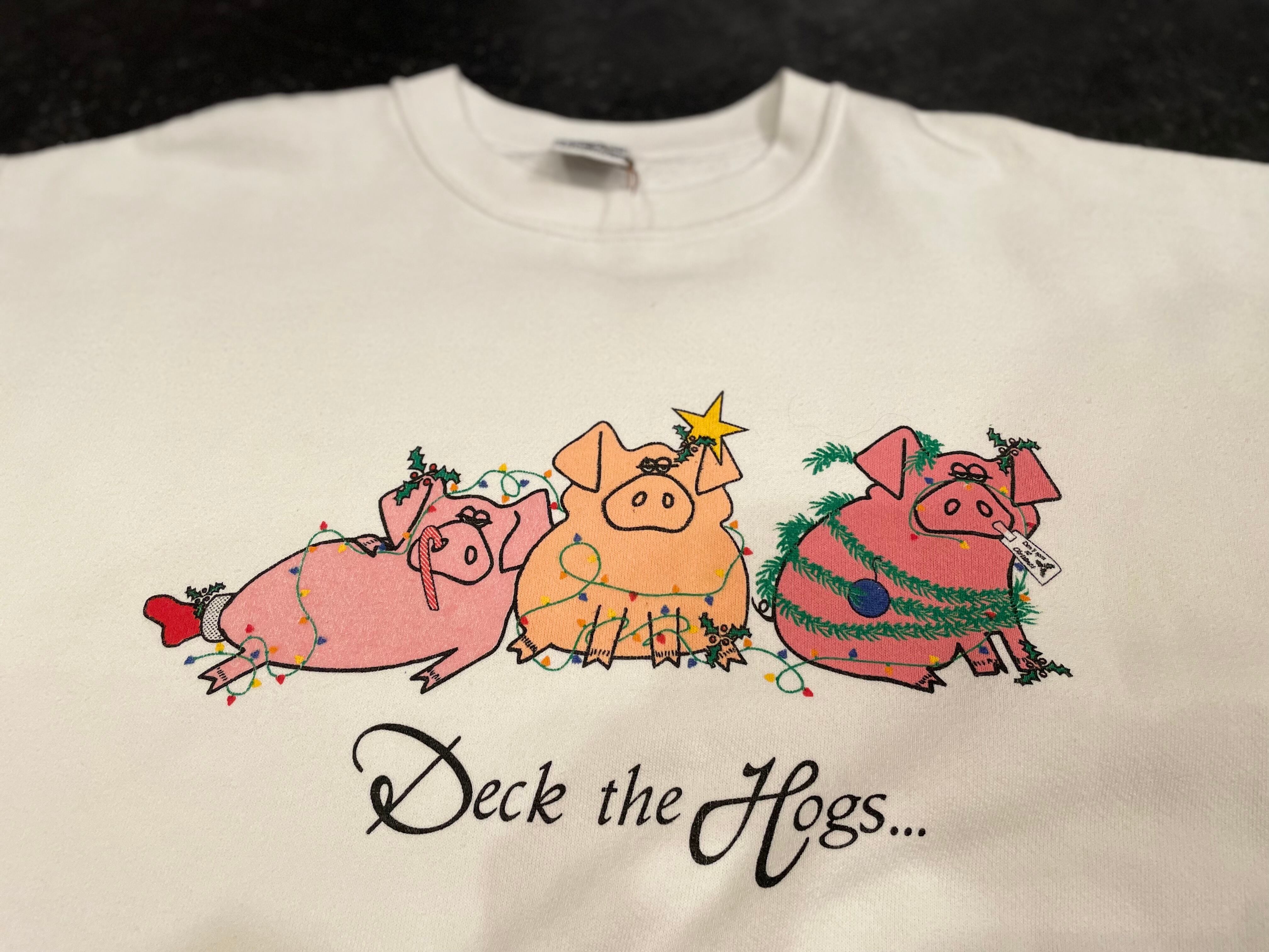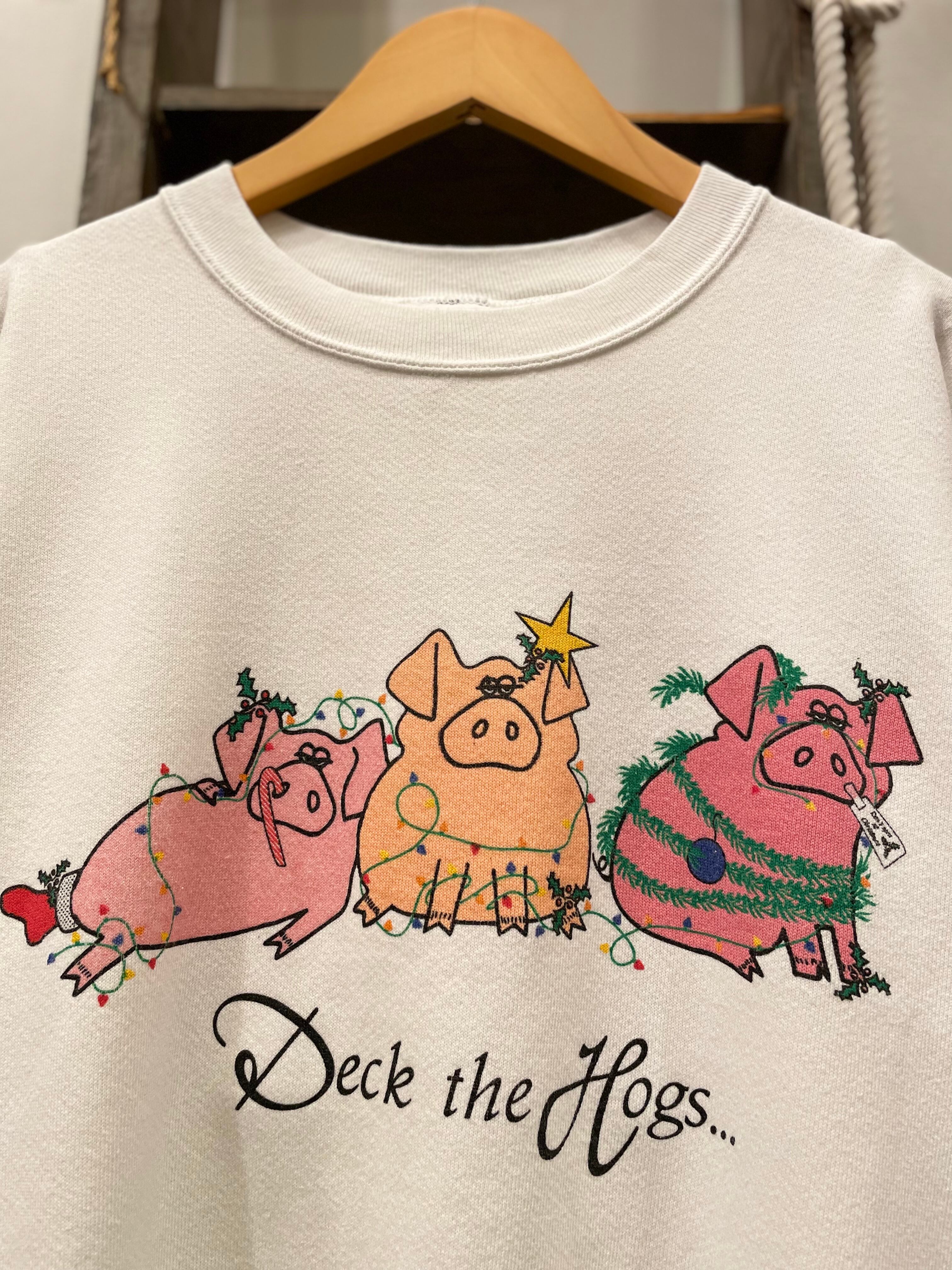 フロントには仲良しな3匹のブタと deck the hogs のプリントが施され、ビンテージならではなストーリー性のあるポップなプリント。