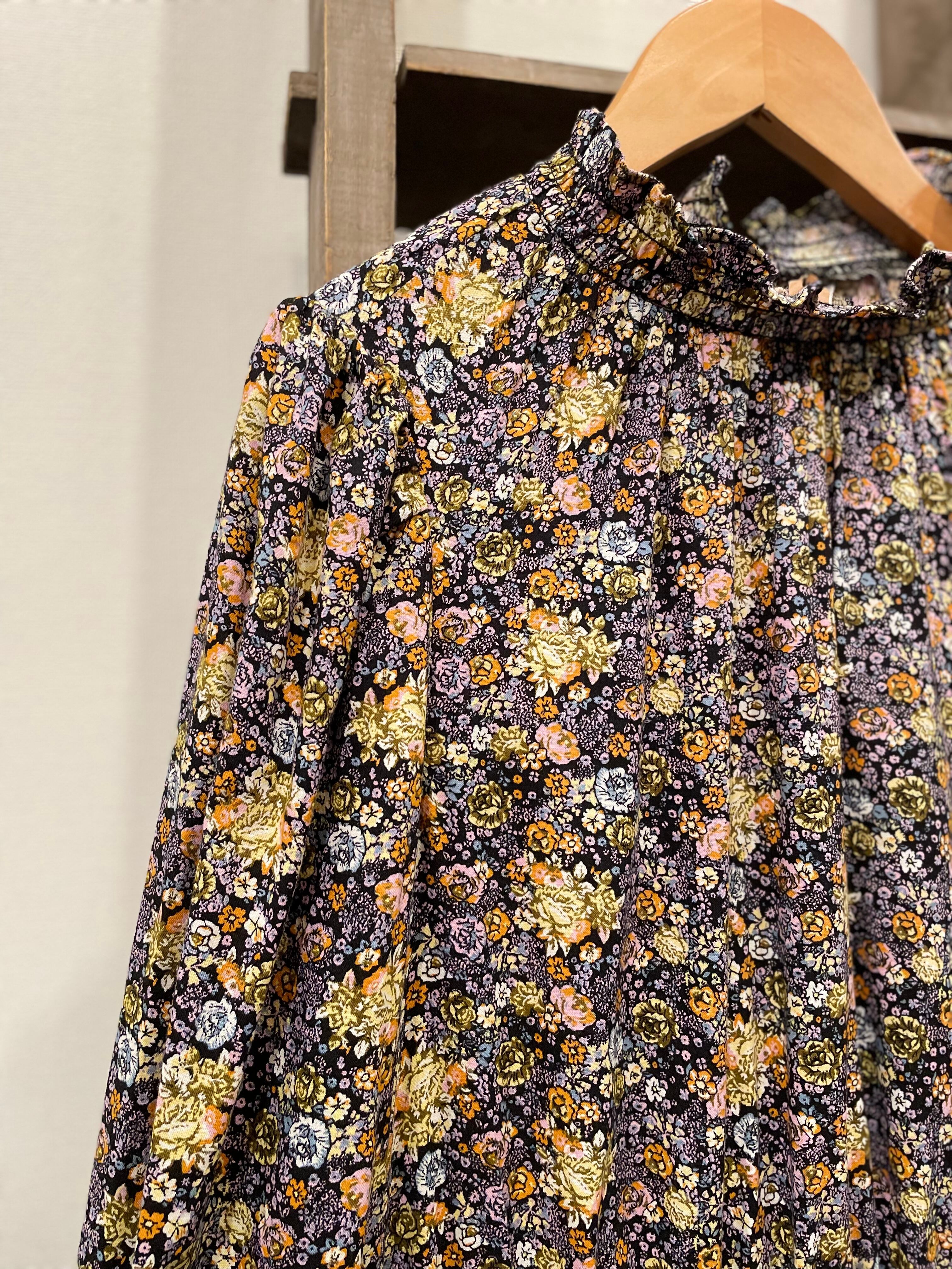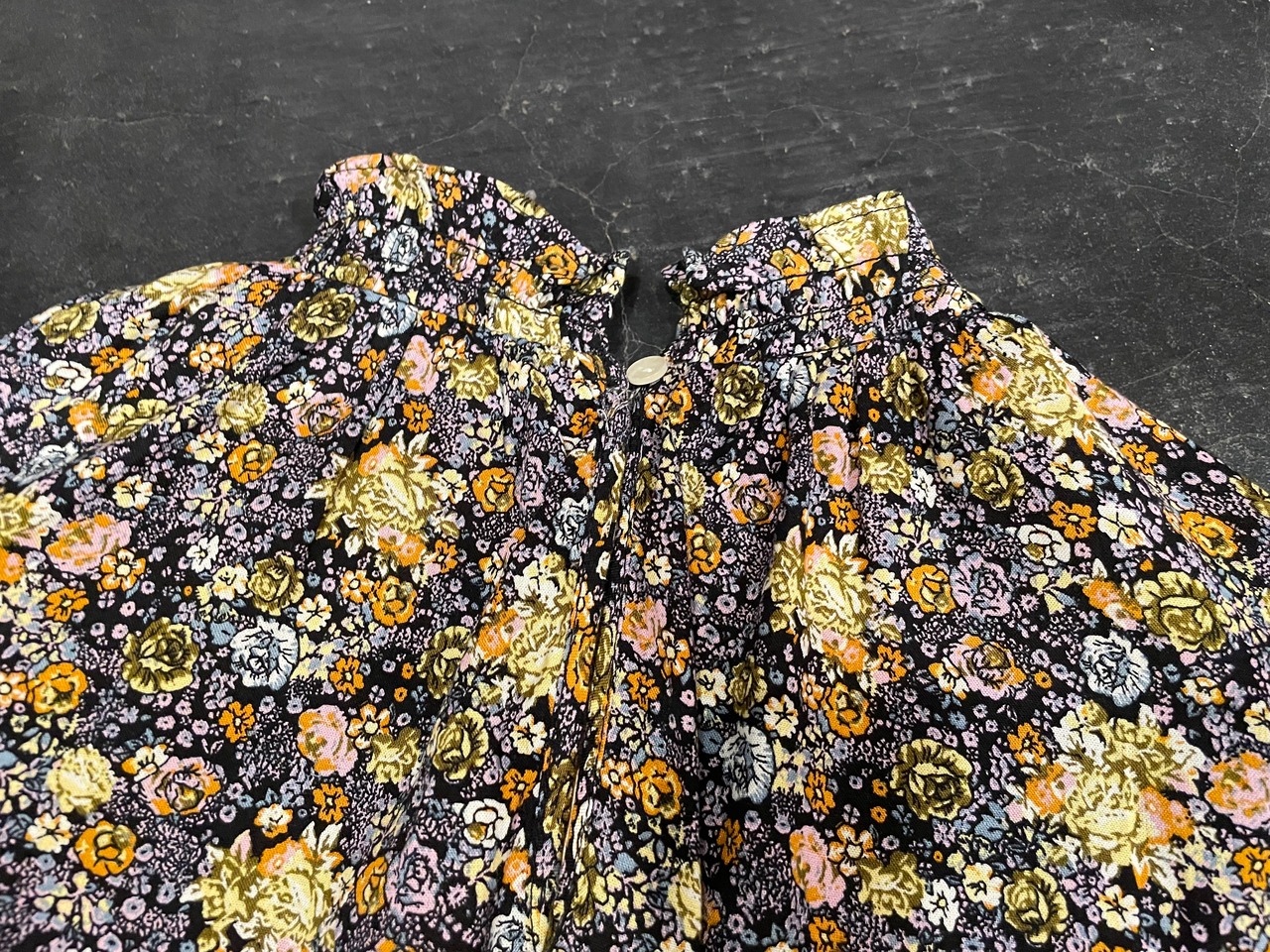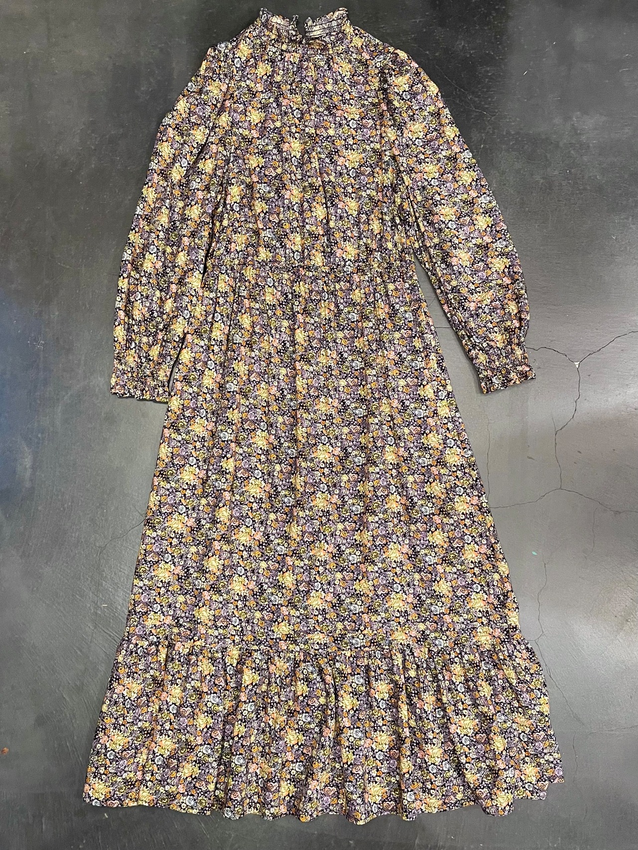 ブラック〜ネイビーに近い落ち着いたボディにロマンティックなフラワープリントがぎっしりなビンテージドレス。