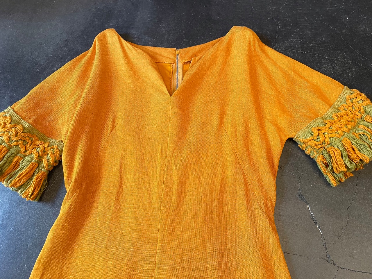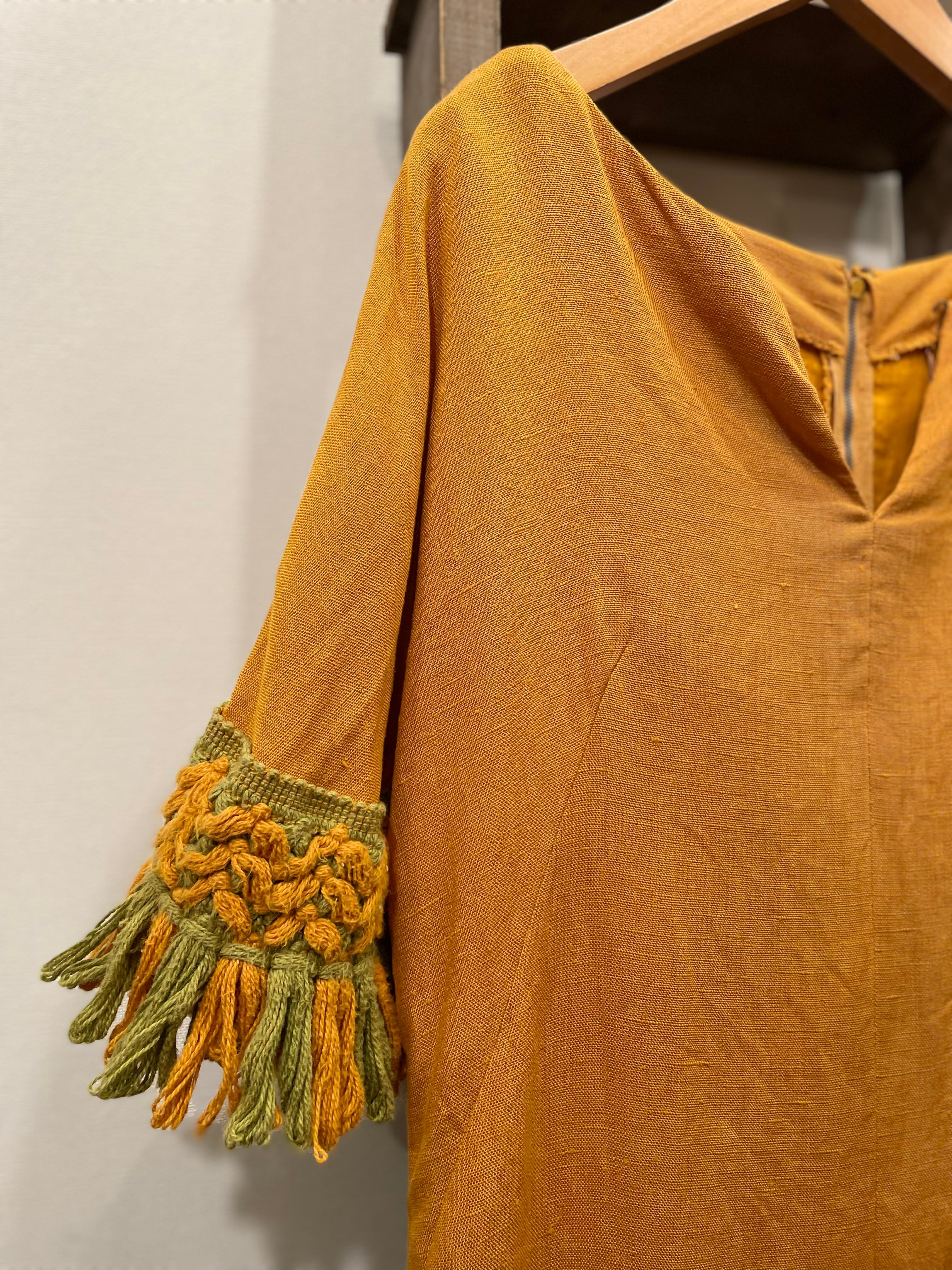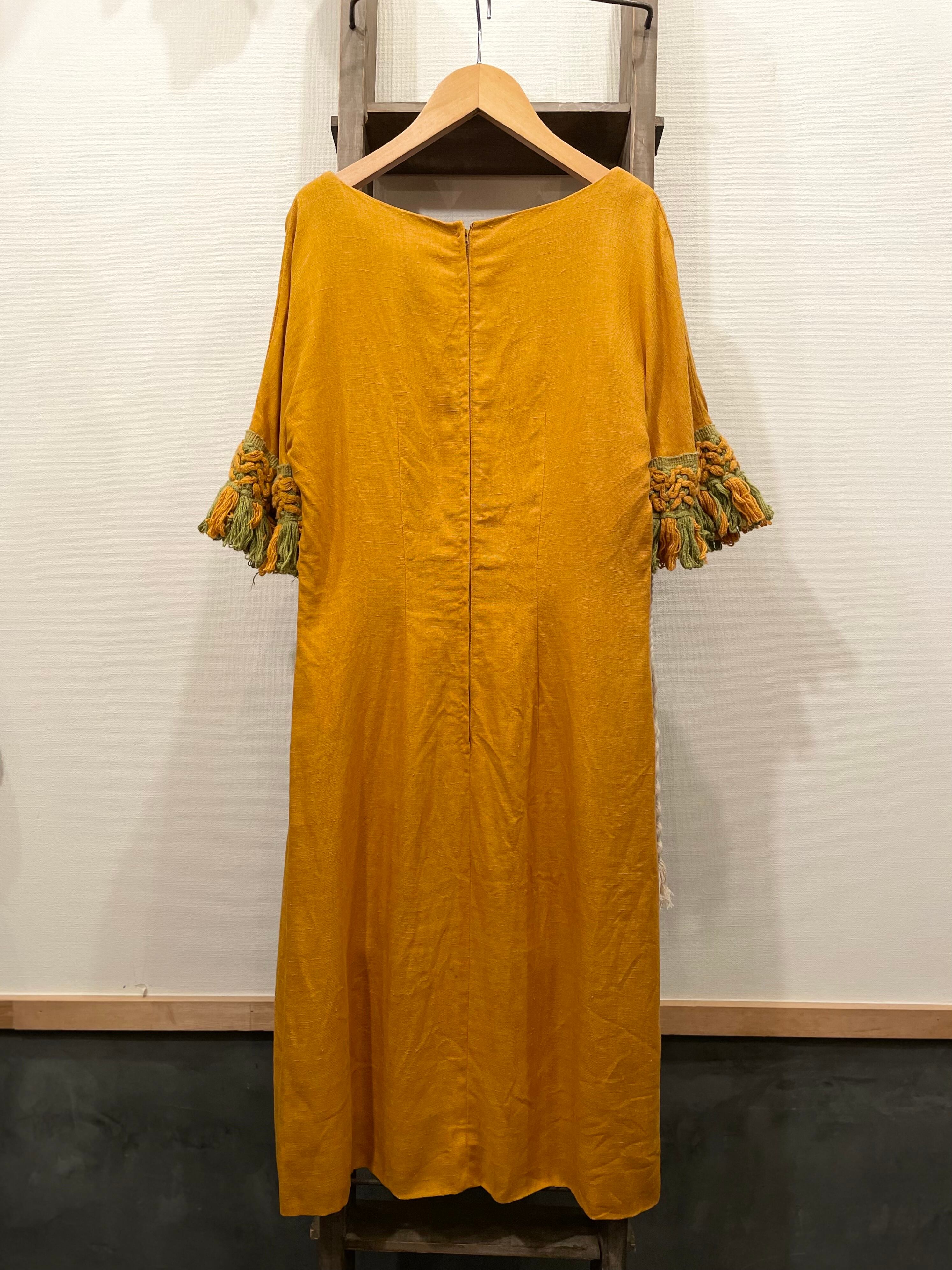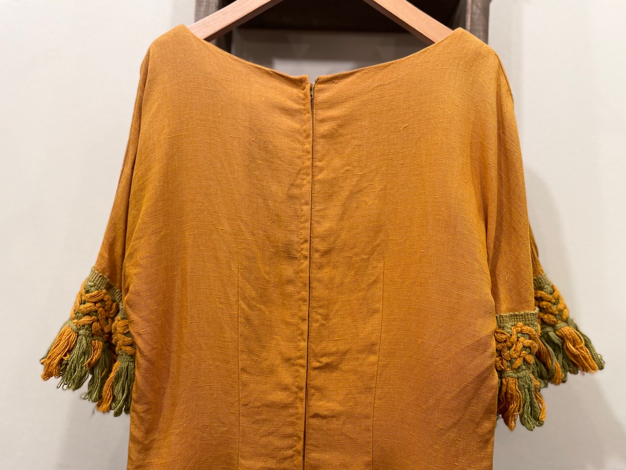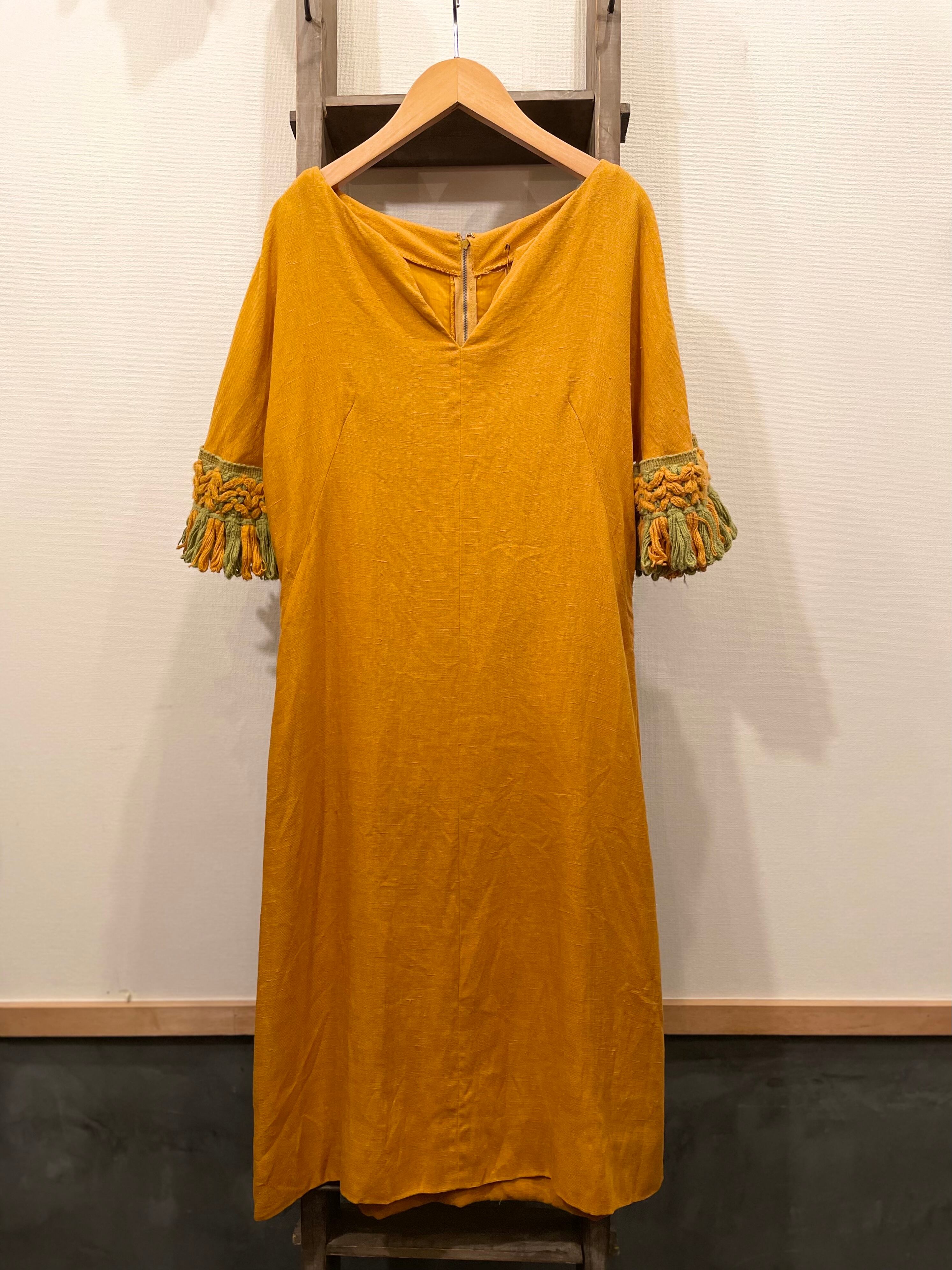 落ち着いたマスタードボディに袖のタッセル装飾が存在感抜群な60-70sビンテージドレス。