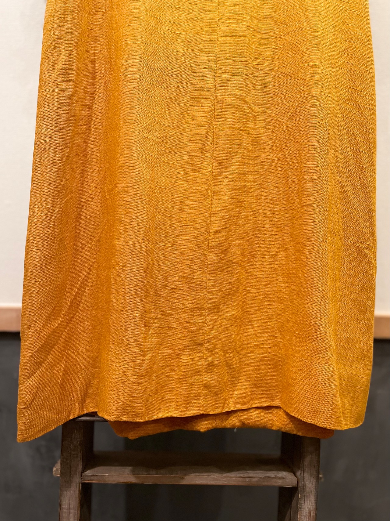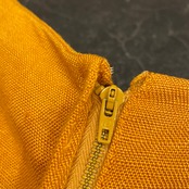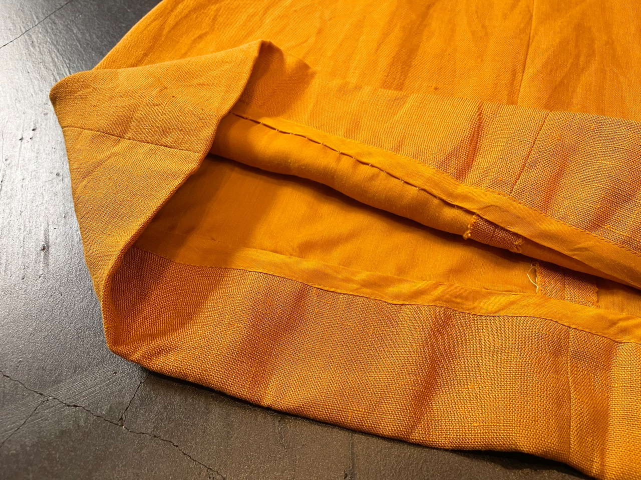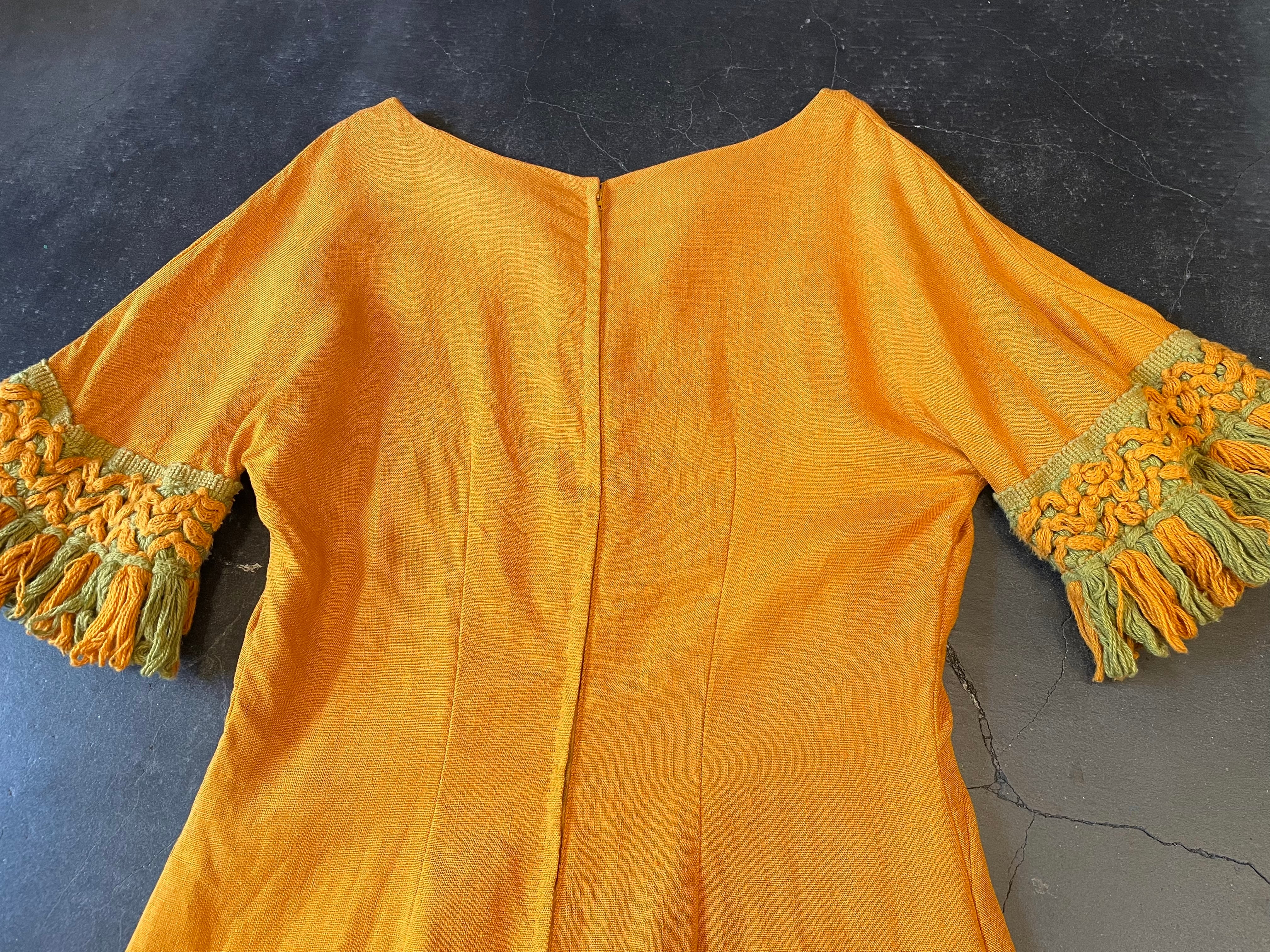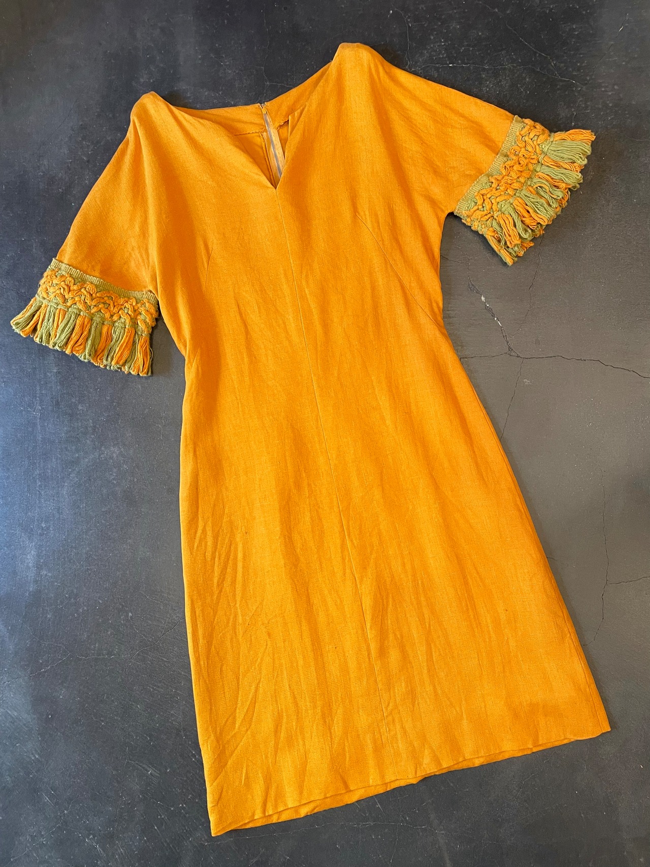 落ち着いたマスタードボディに袖のタッセル装飾が存在感抜群な60-70sビンテージドレス。