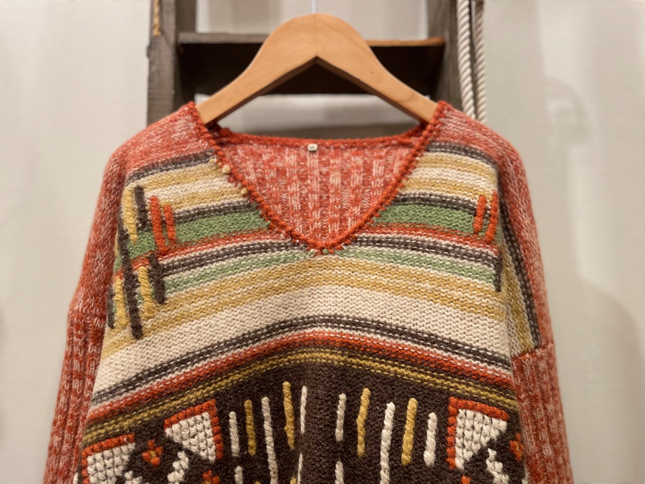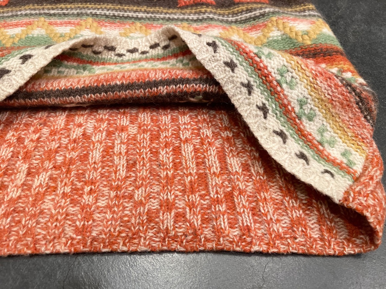 オレンジ×ホワイトのミックスボディに、ぷっくりとしたひし形やギザギザ等のネイティブ調なデザインがクロスステッチで丁寧に表現されたグッドアイテム◎