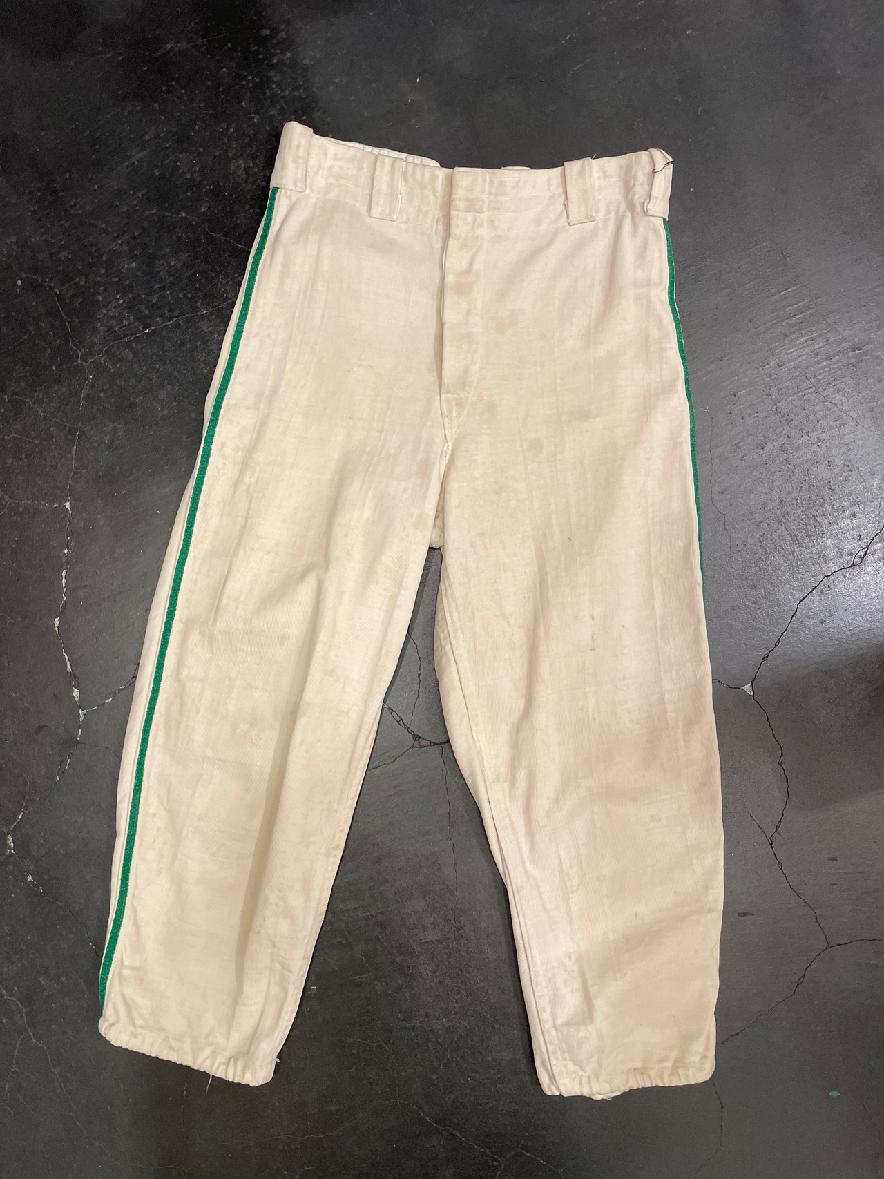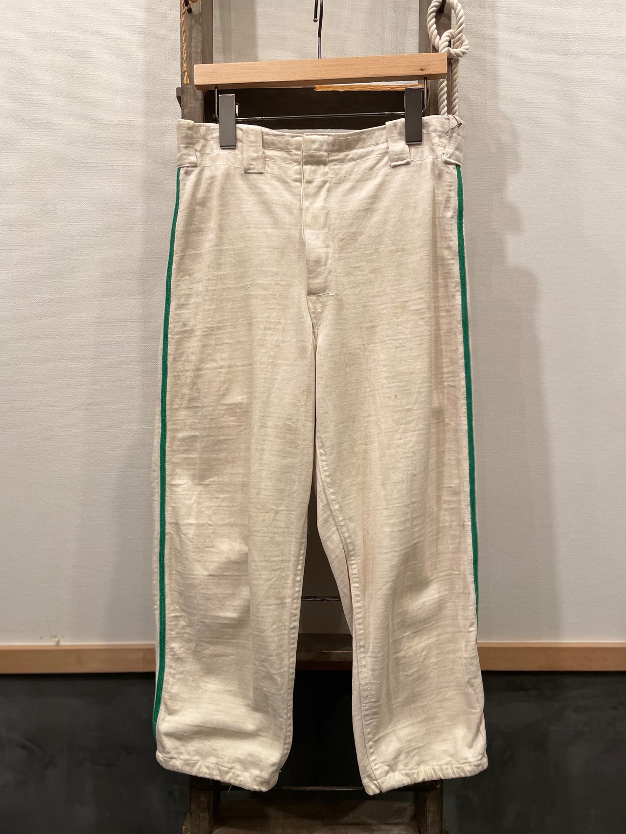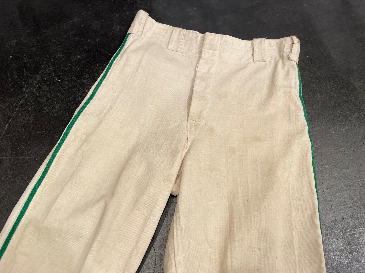 合わせやすいホワイトカラーに緑ラインが映えてる50-60sビンテージベースボールパンツ。
