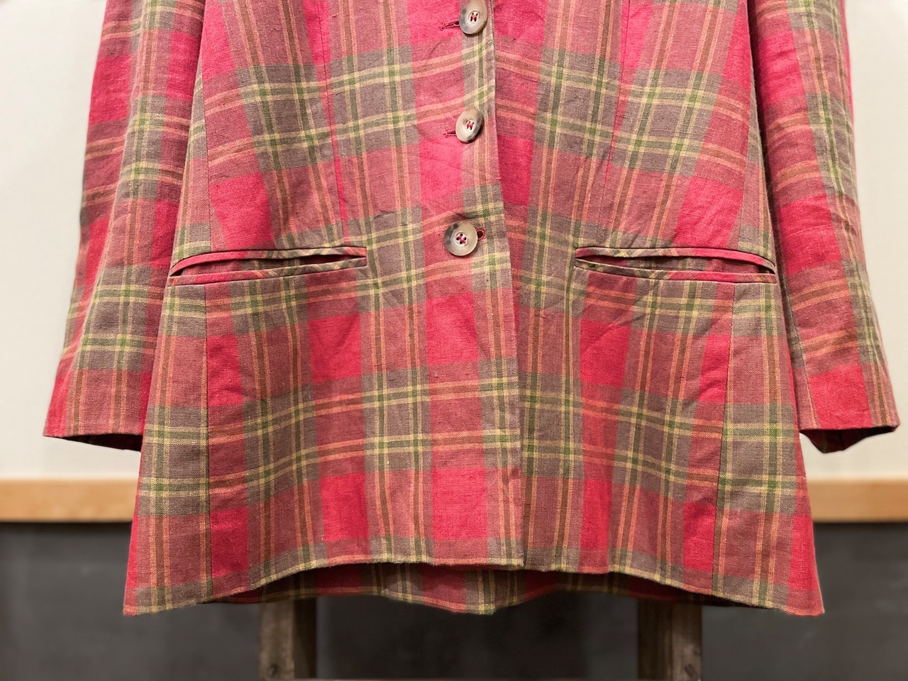 くすみ感のある落ち着いたレッド×カーキのチェックの良い柄。