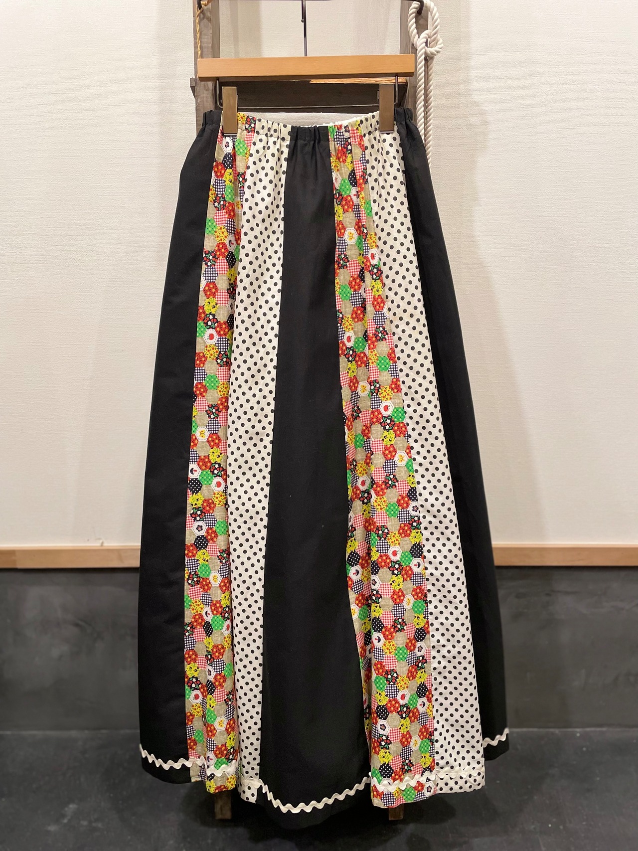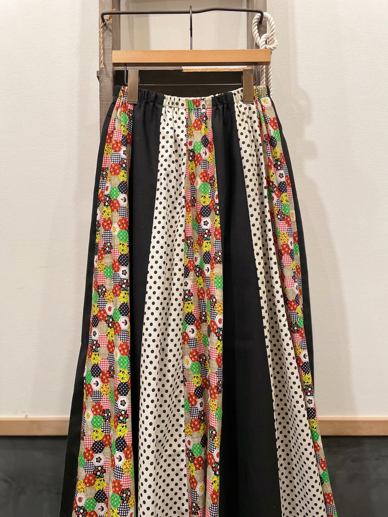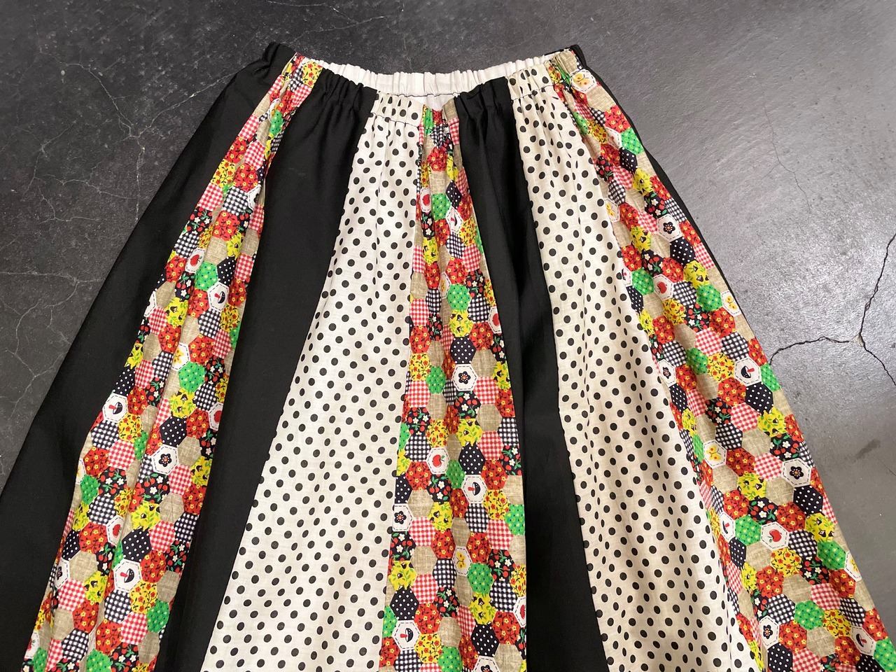 柄はポップなパッチワークパターン×ドット×ブラックの生地を繋ぎ合わせた贅沢なアイテム◎
