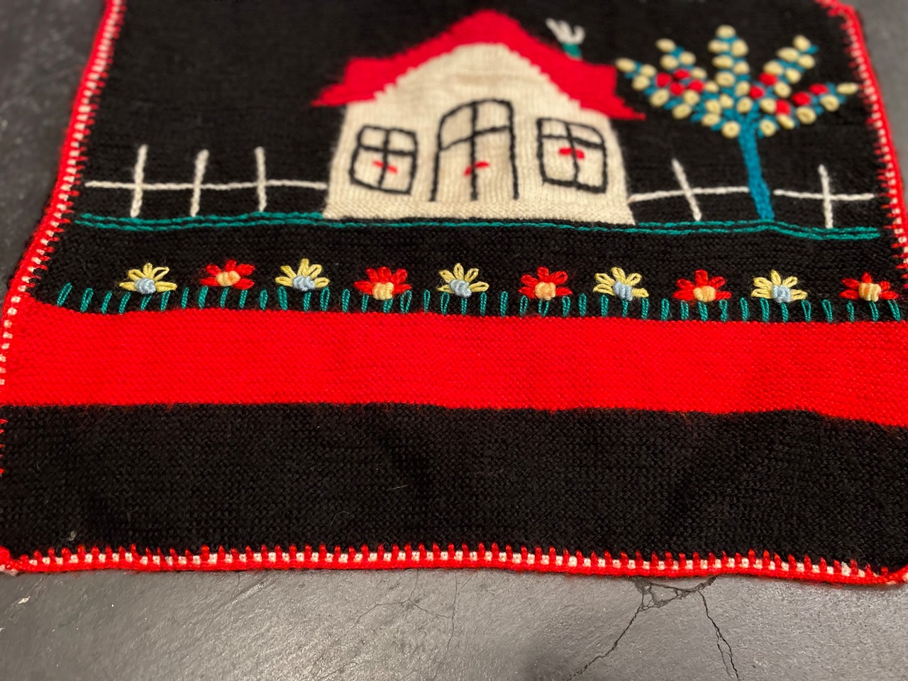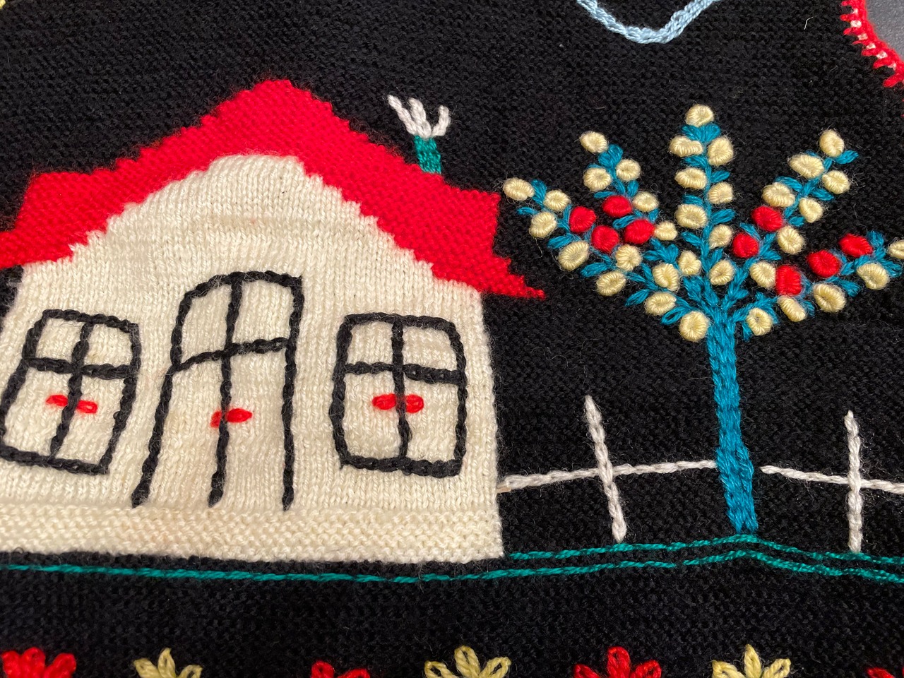 ブラックボディに、刺繍で表現されたお家やお花のデザインが施された可愛らしいアイテム◎