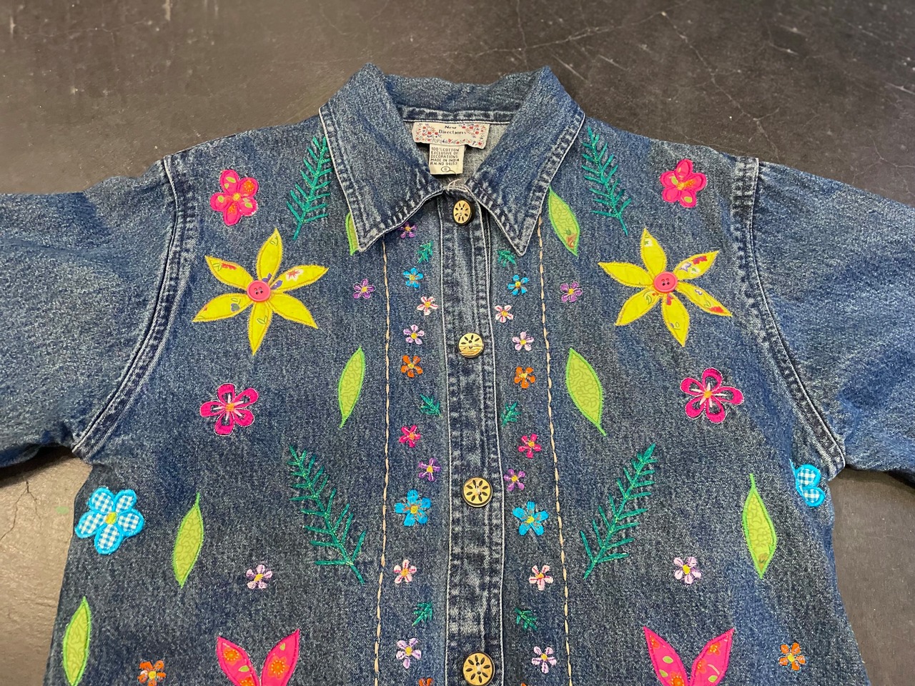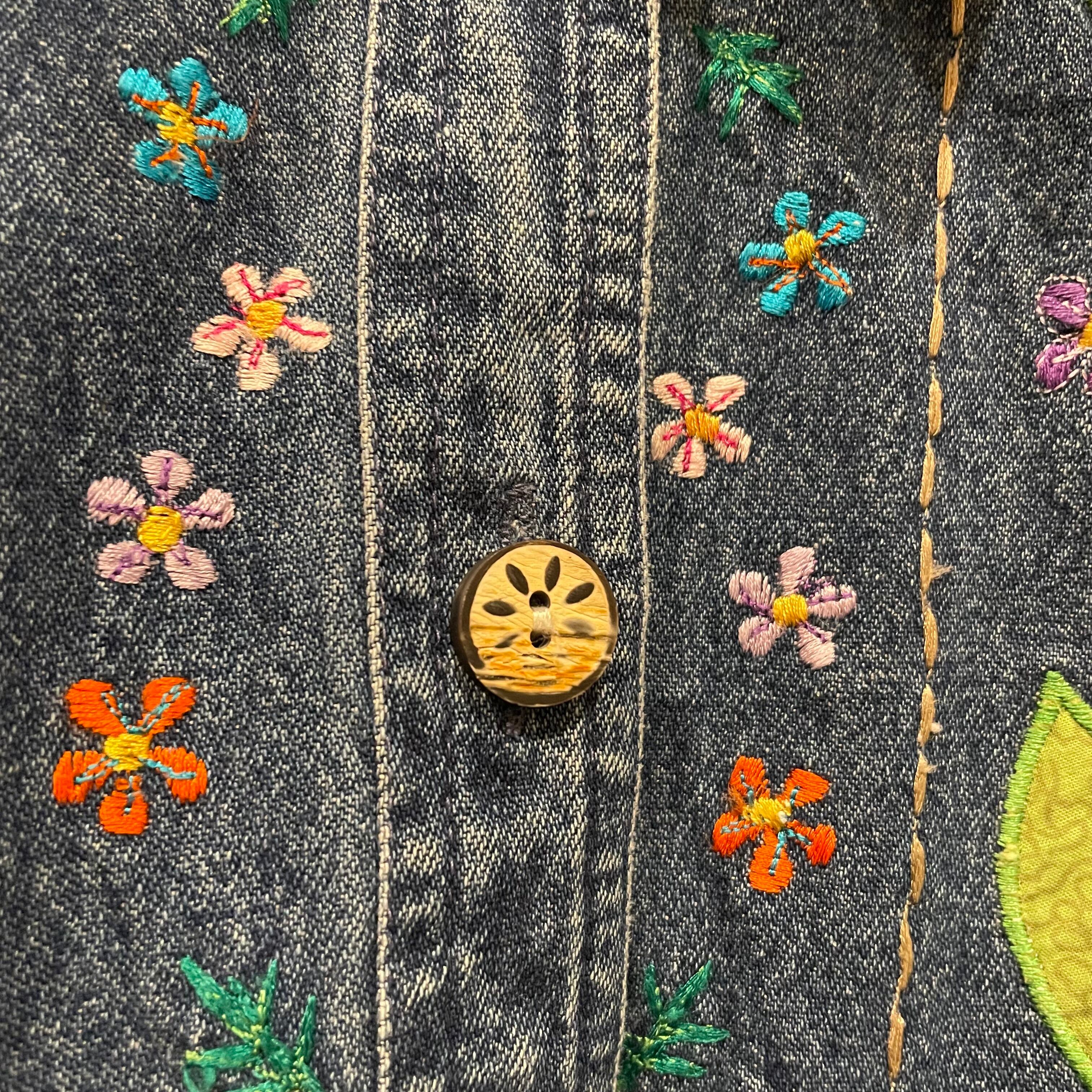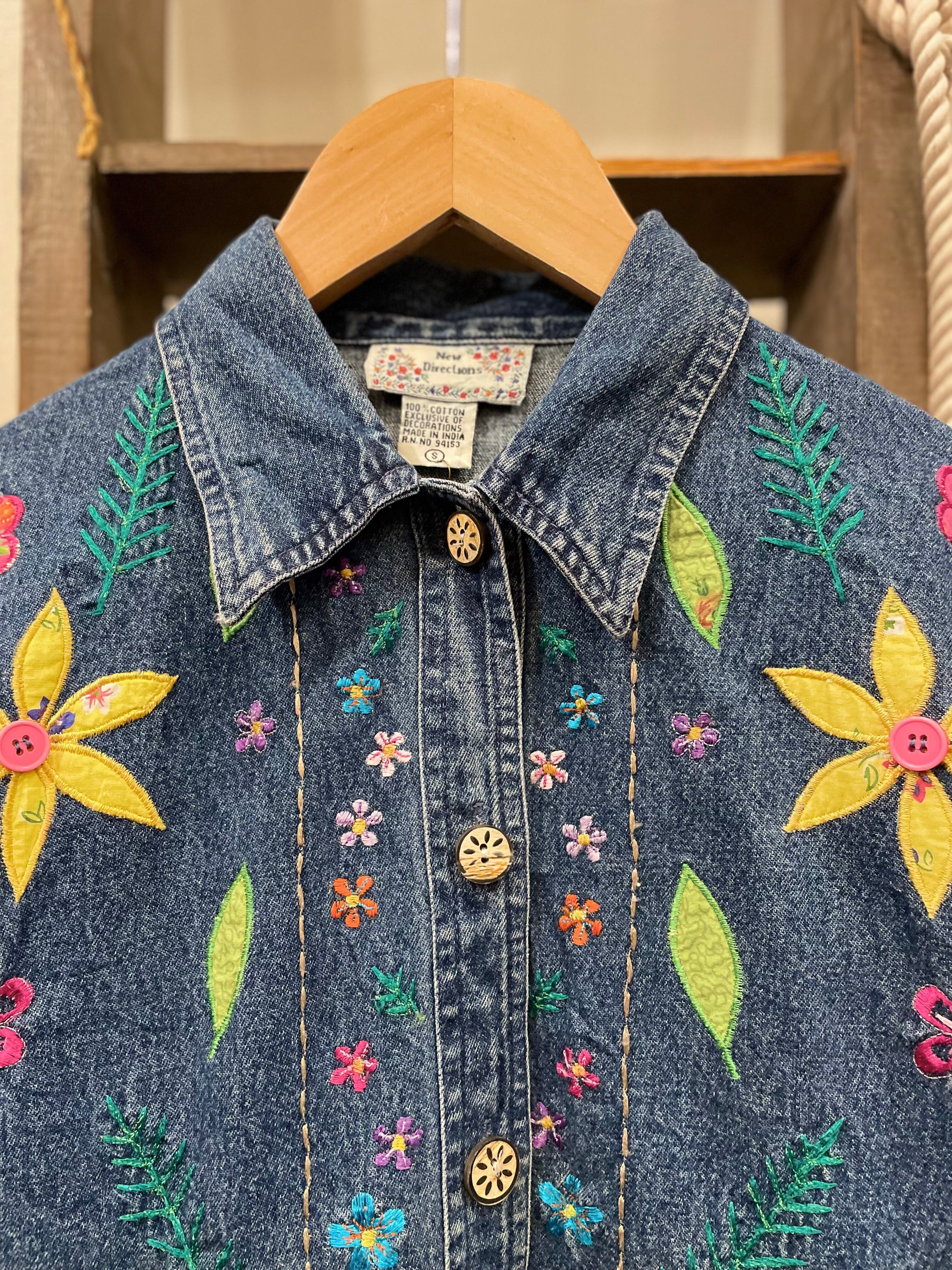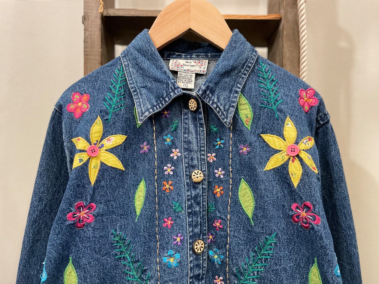 濃いめのデニムボディに、テンション上がるお花の刺繍や花のパッチが施されたアイテム◎