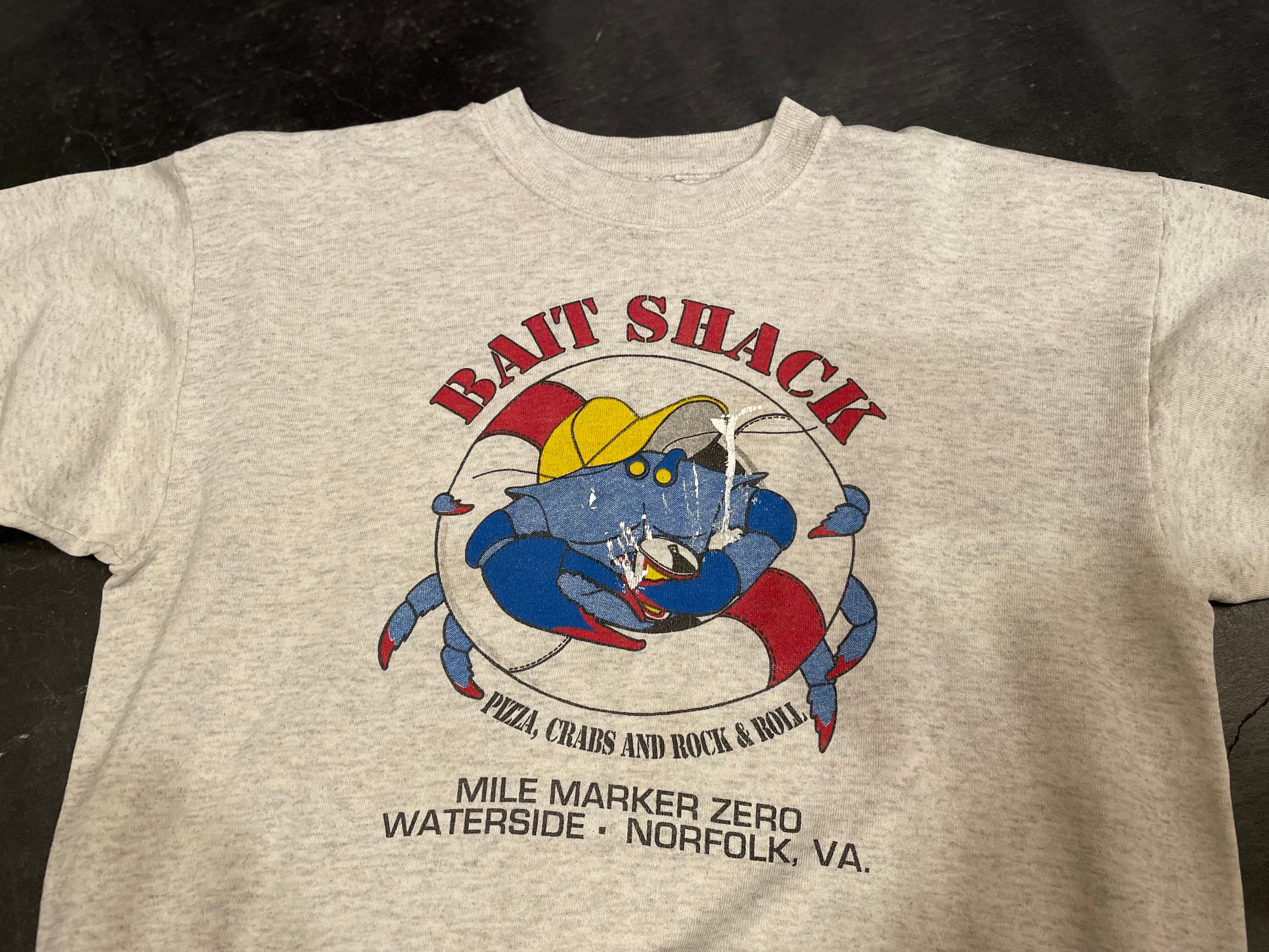 フロントにはBAIT SHACKと浮き輪を持ったカニのプリントが施され、ビンテージならではなグッドアイテム。
