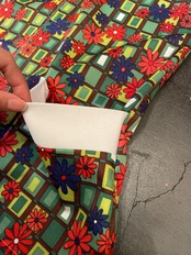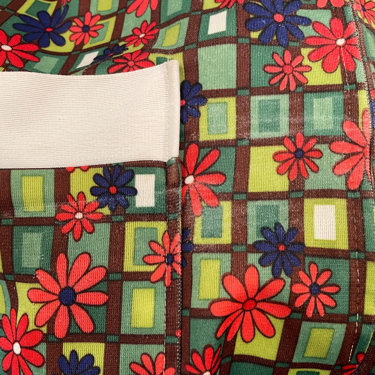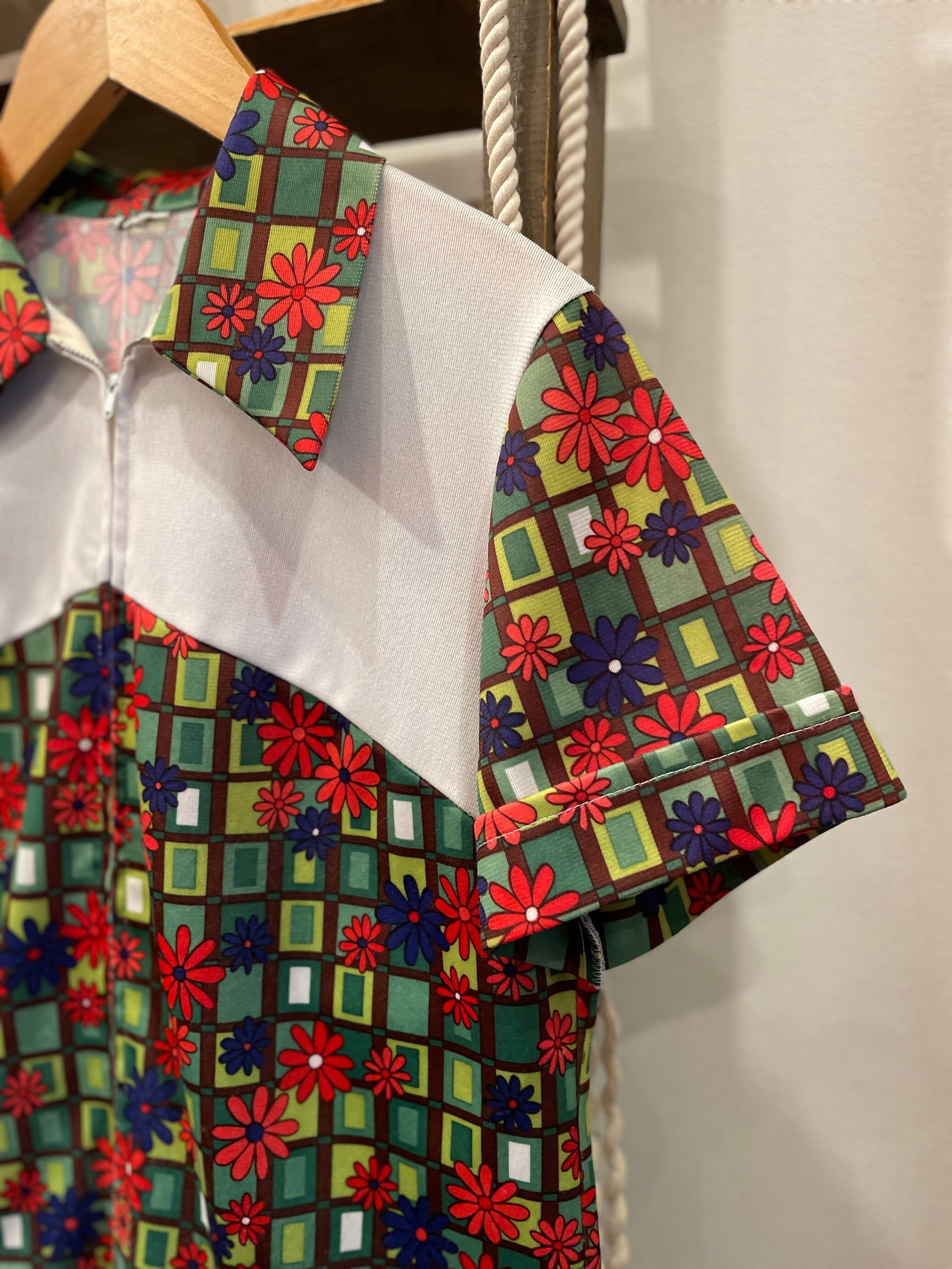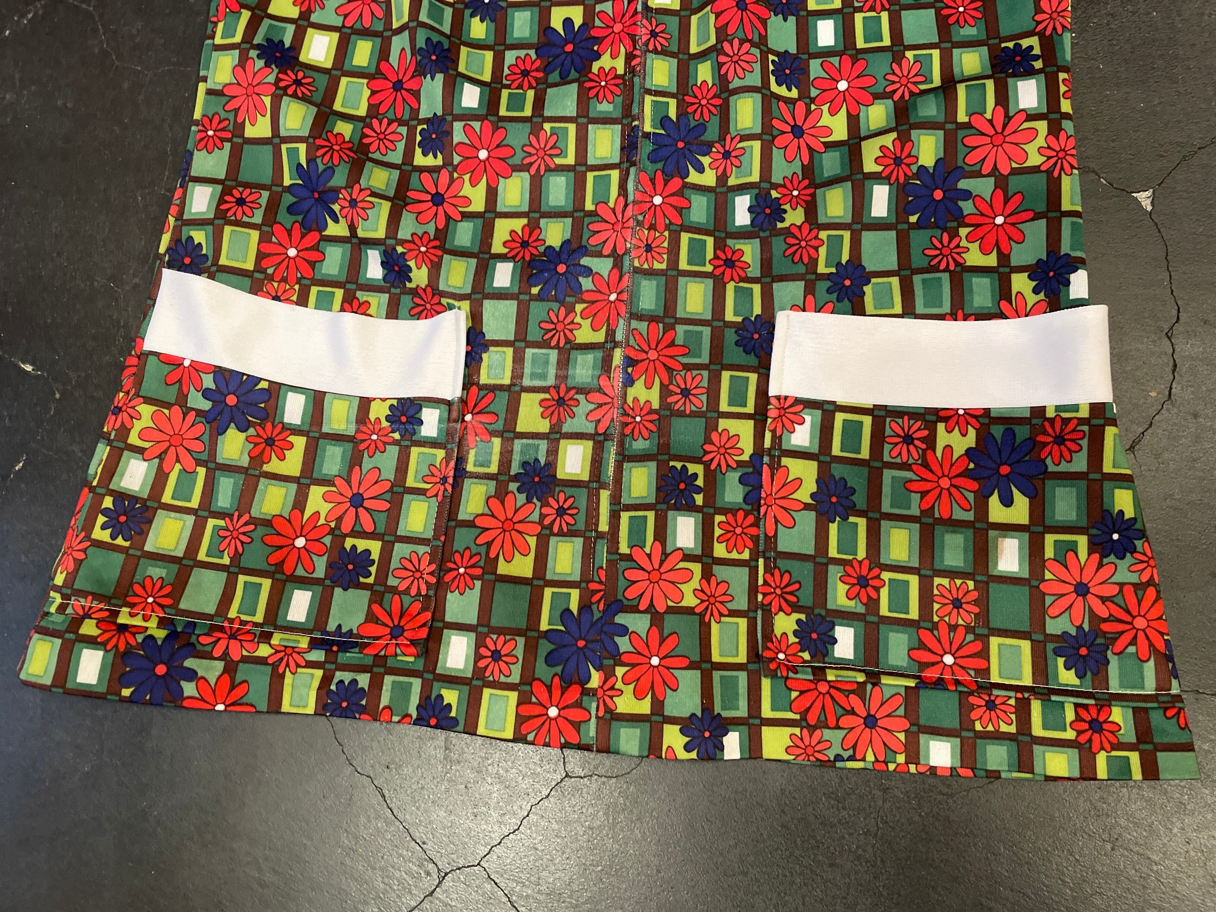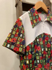 グリーンを基調にしたブロックパターンに、ピンクやネイビーのデイジープリントが可愛らしいアイテム◎