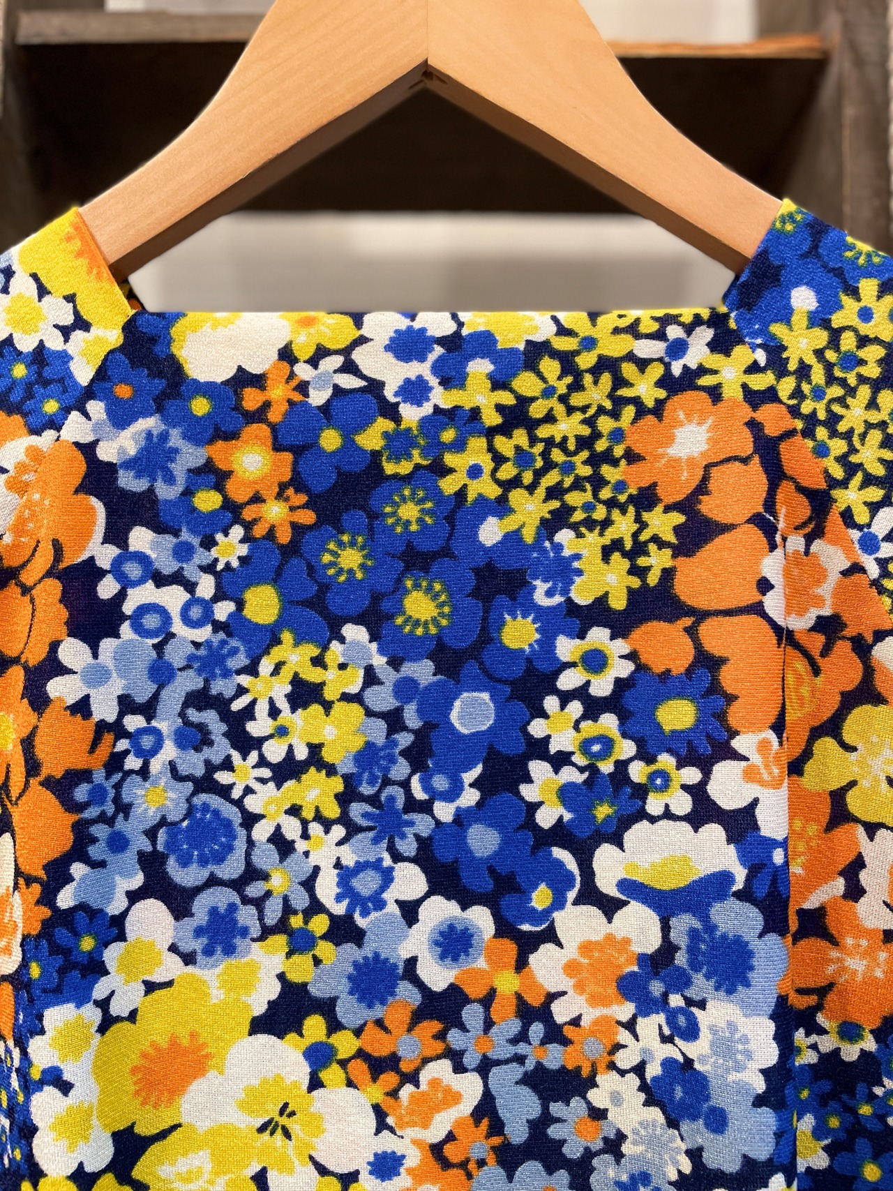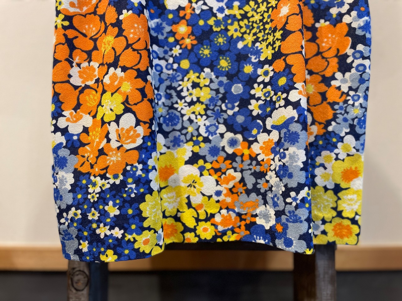 ネイビーボディに、この時代らしいポップなフラワープリントが目を惹きます。