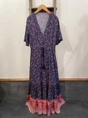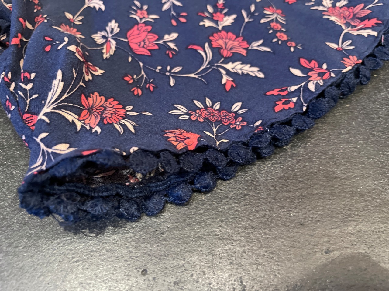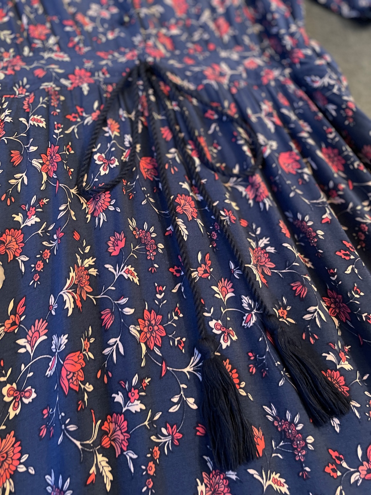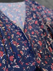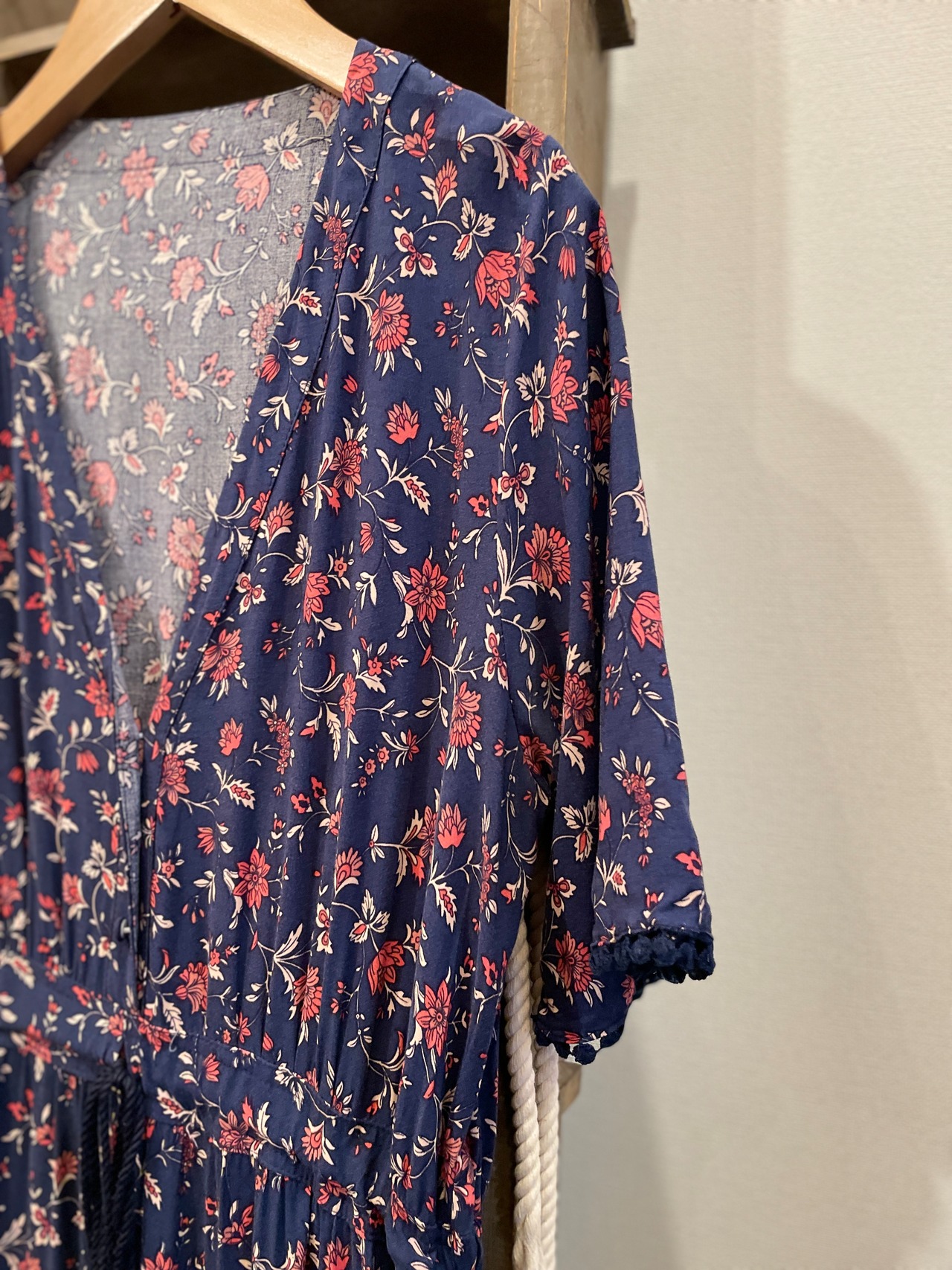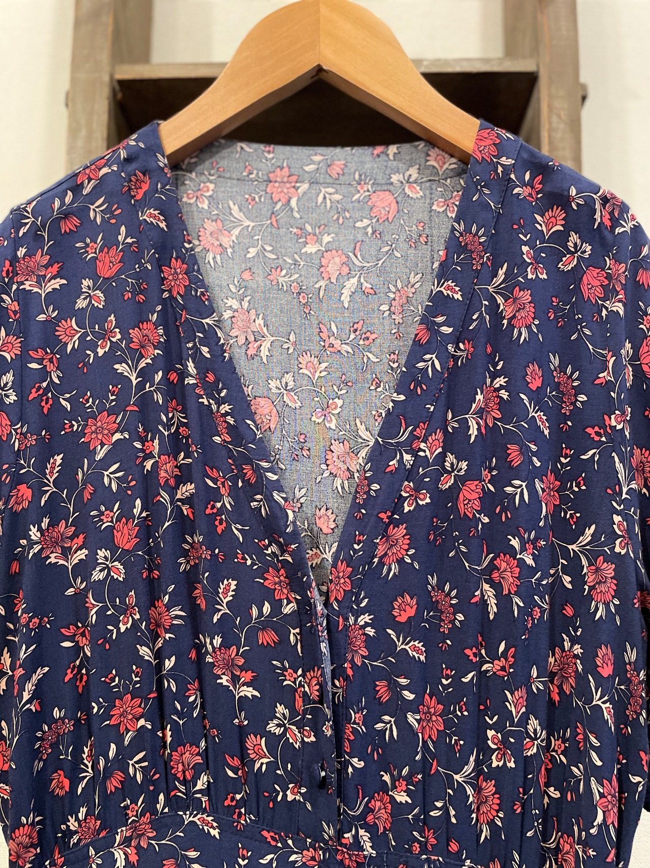 落ち着いたネイビーボディにピンクの花柄プリントが施されたアイテム。