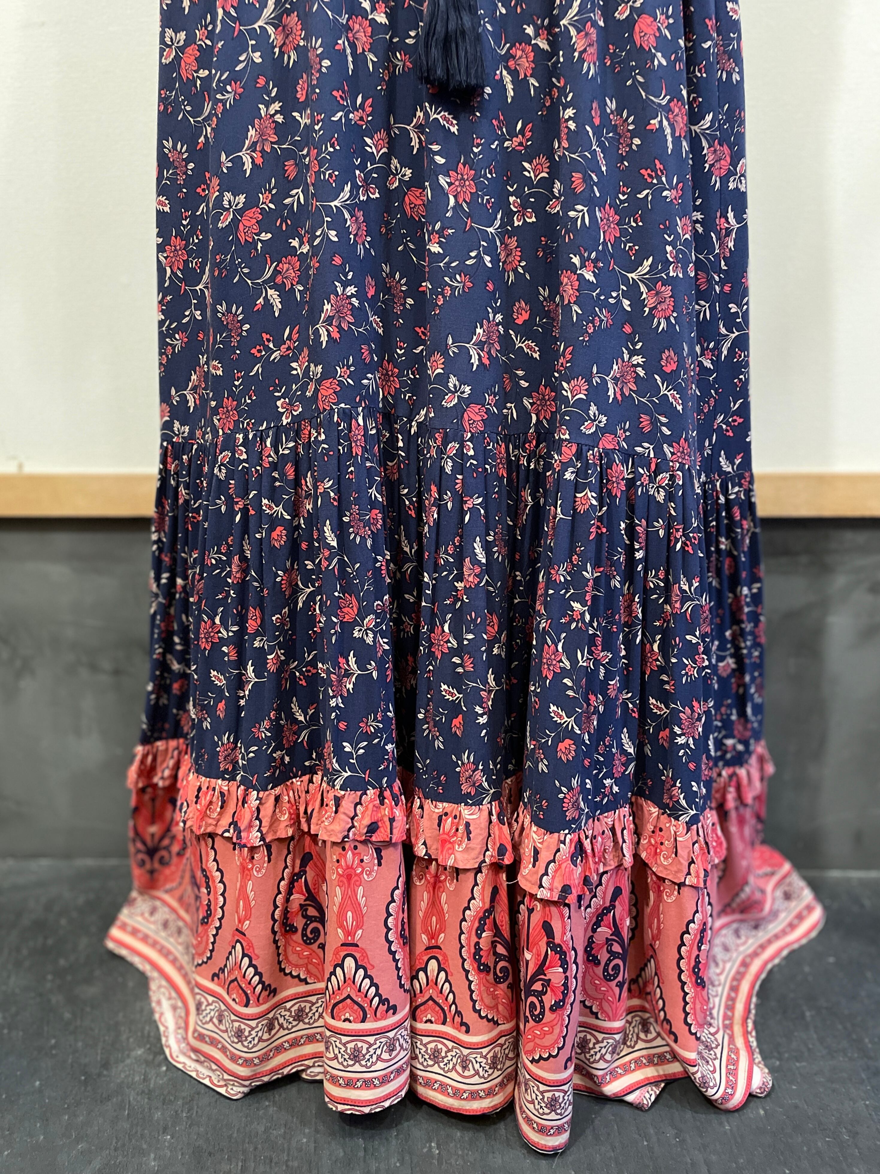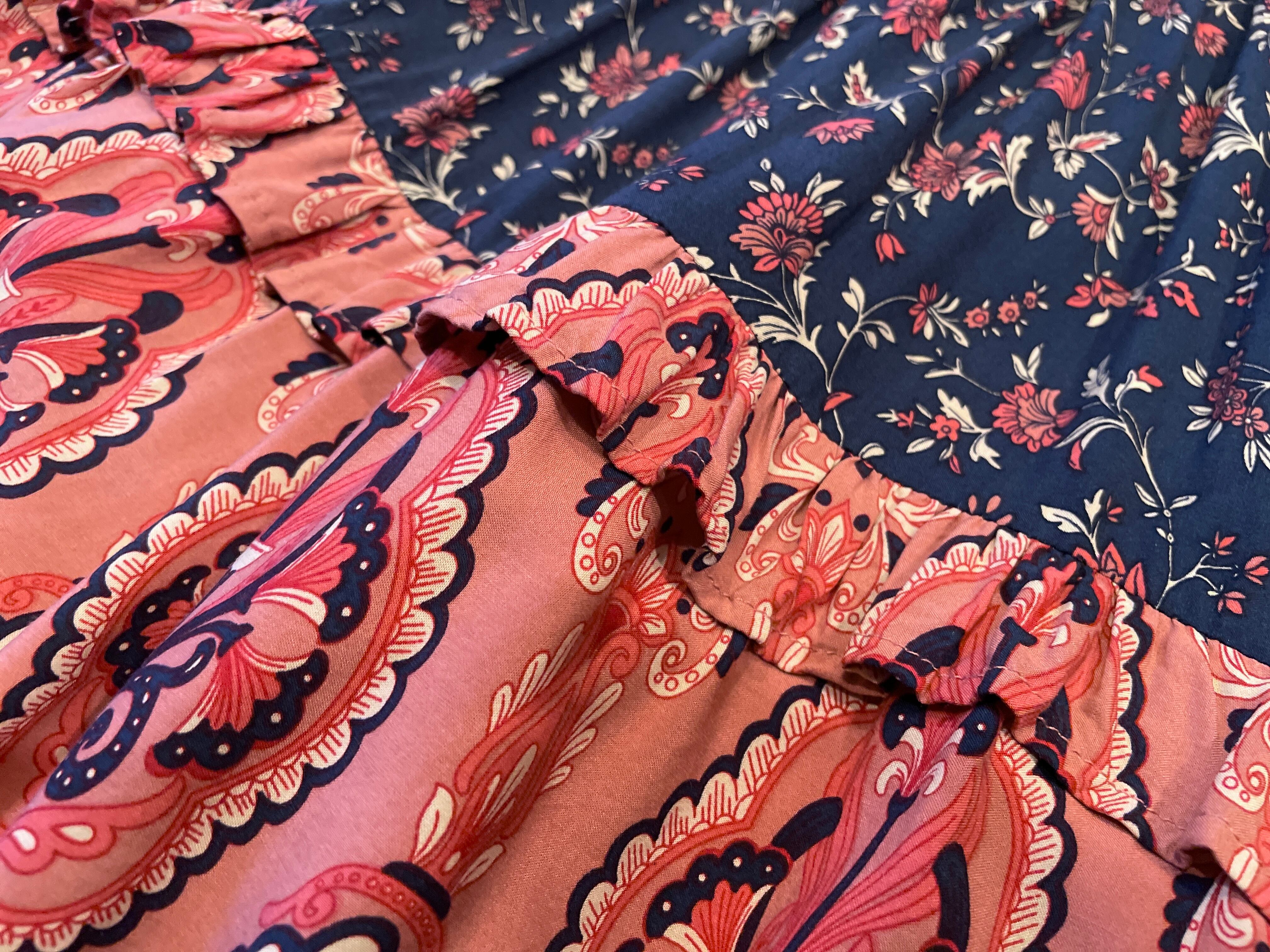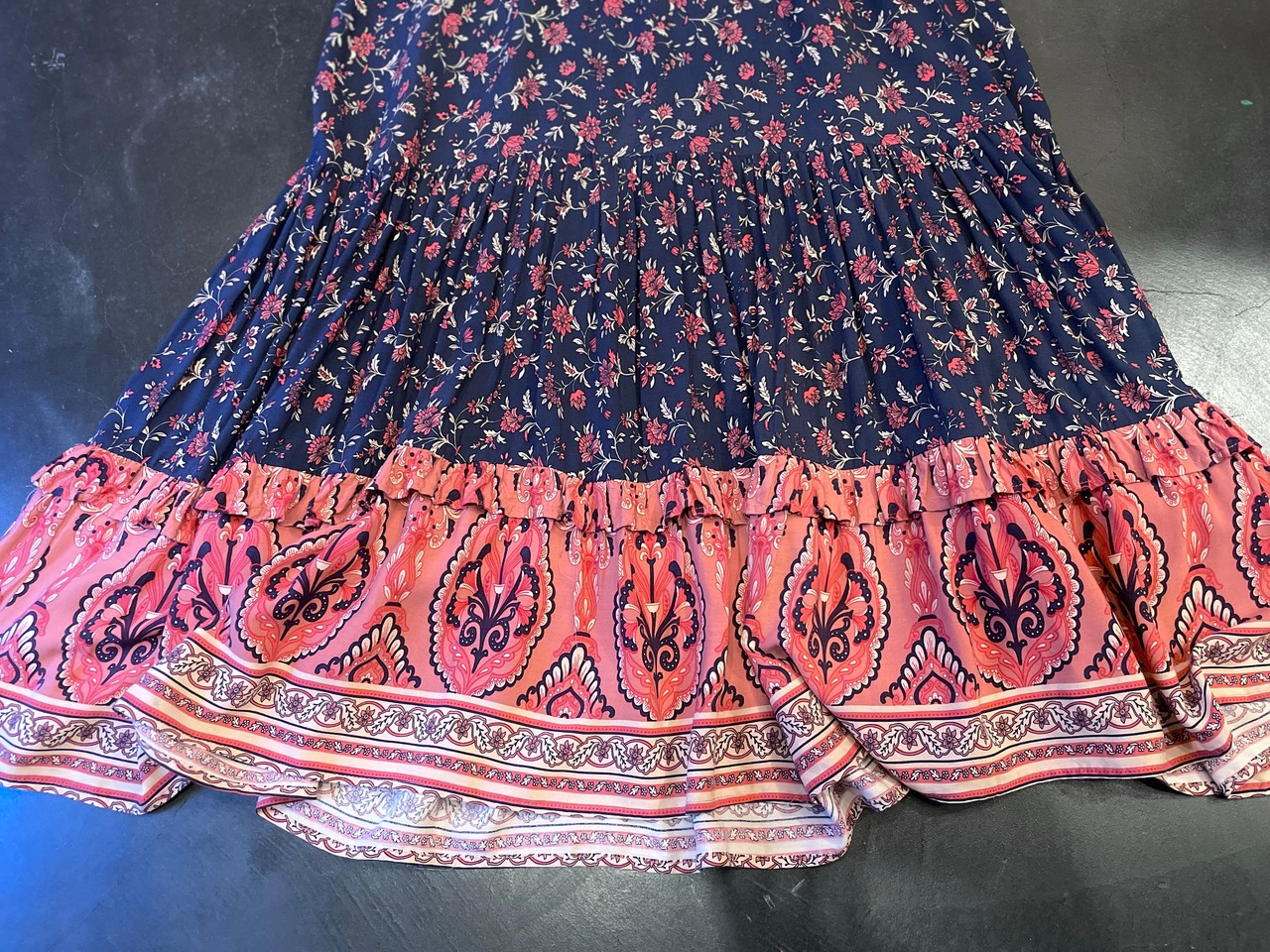 スカートの裾には違うテイストの生地を使用しており、切り替え箇所に施されたミニフリルも可愛らしいです♪