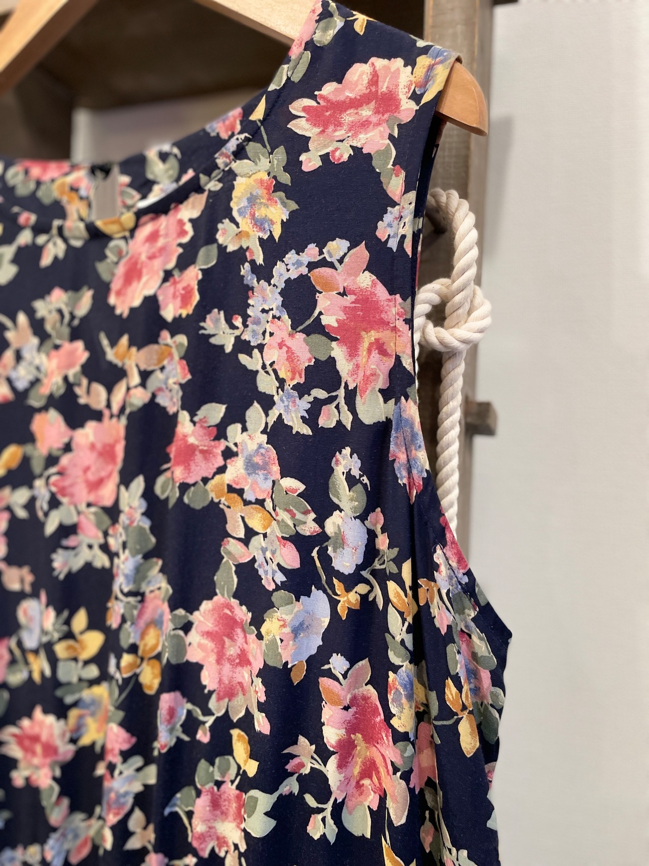 合わせやすいネイビーボディに、柔らかいタッチで描かれた花柄パターンがgood◎
