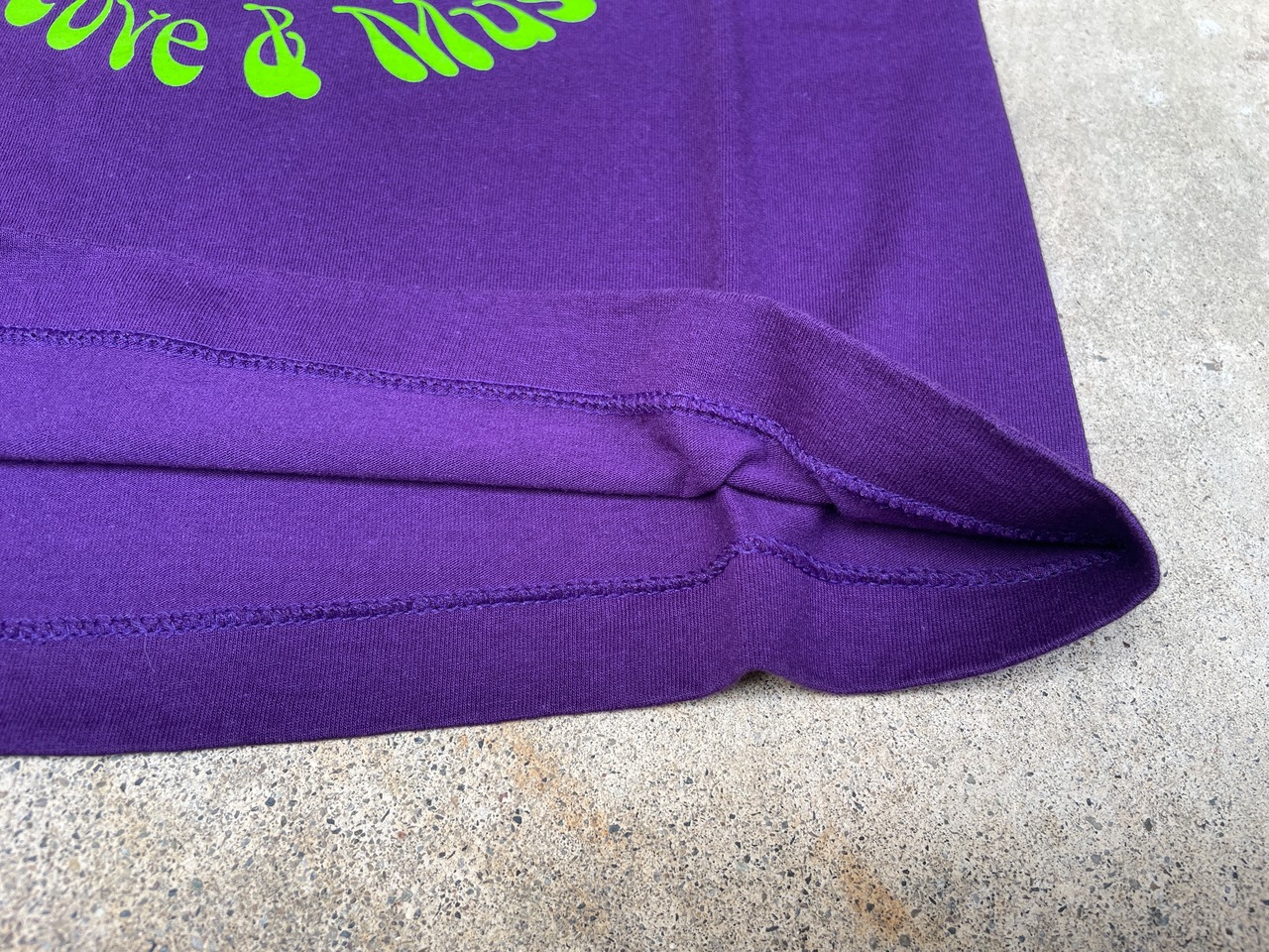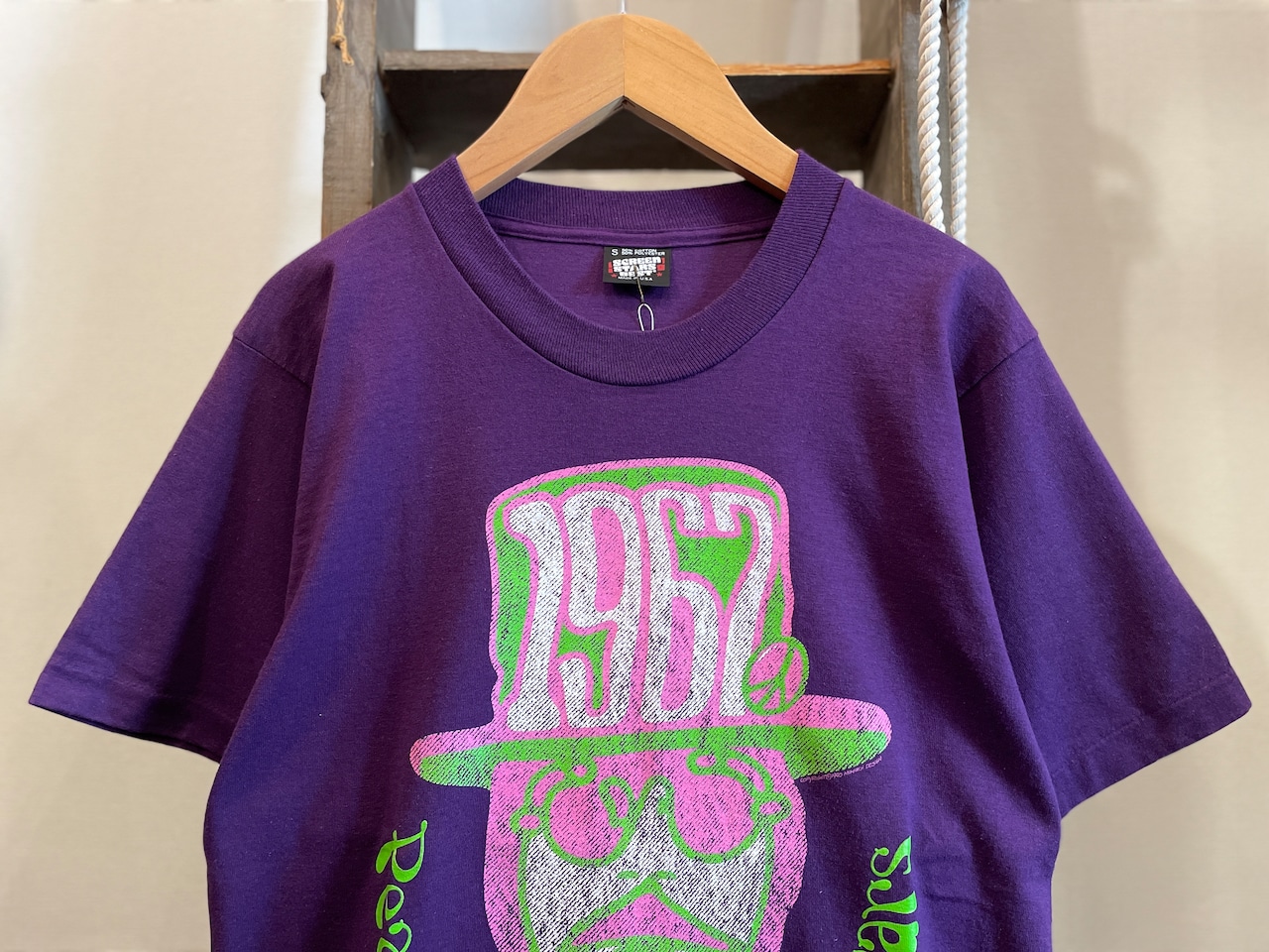 濃いめのパープルボディにヒッピーなプリントが施されたアイテム。