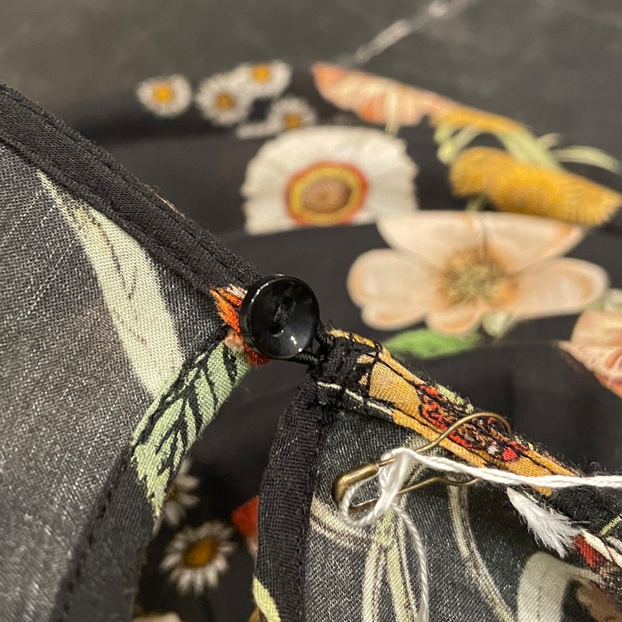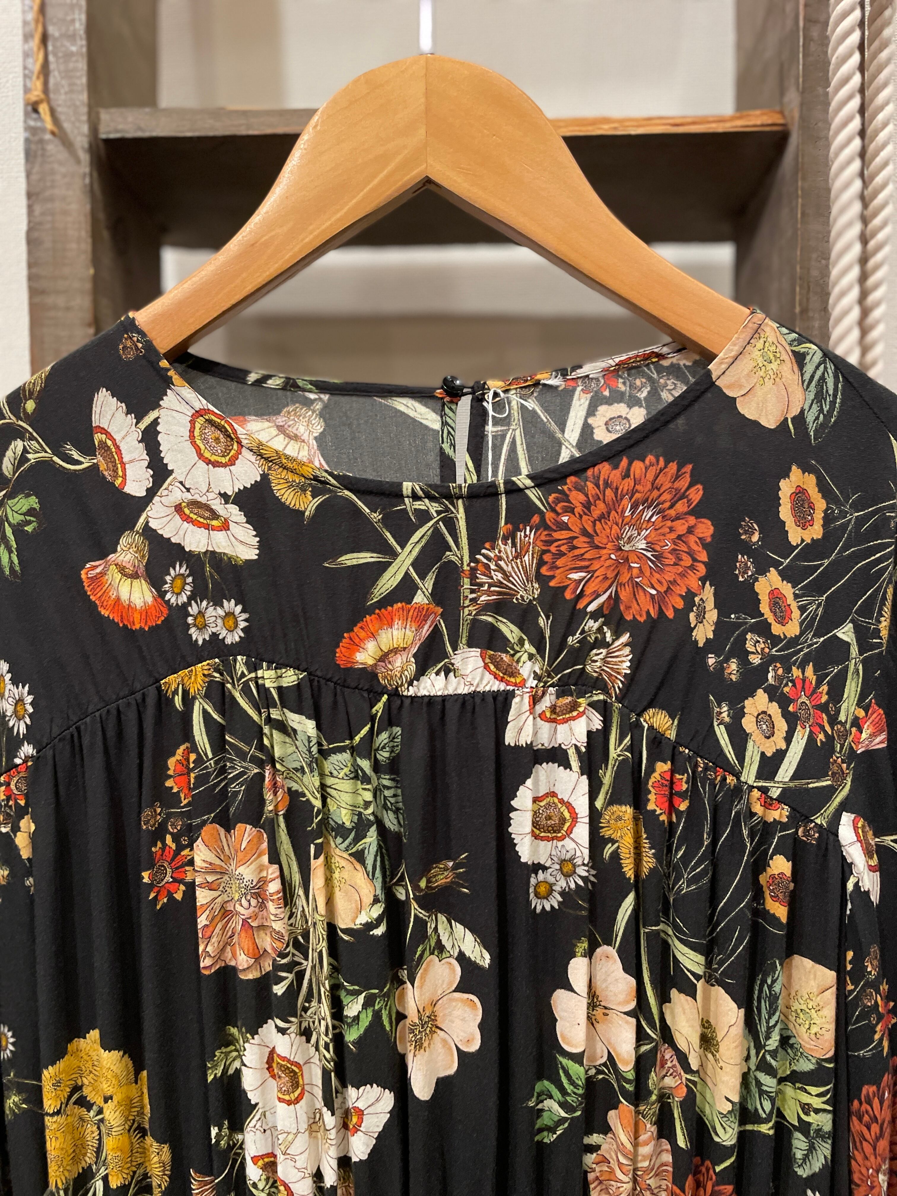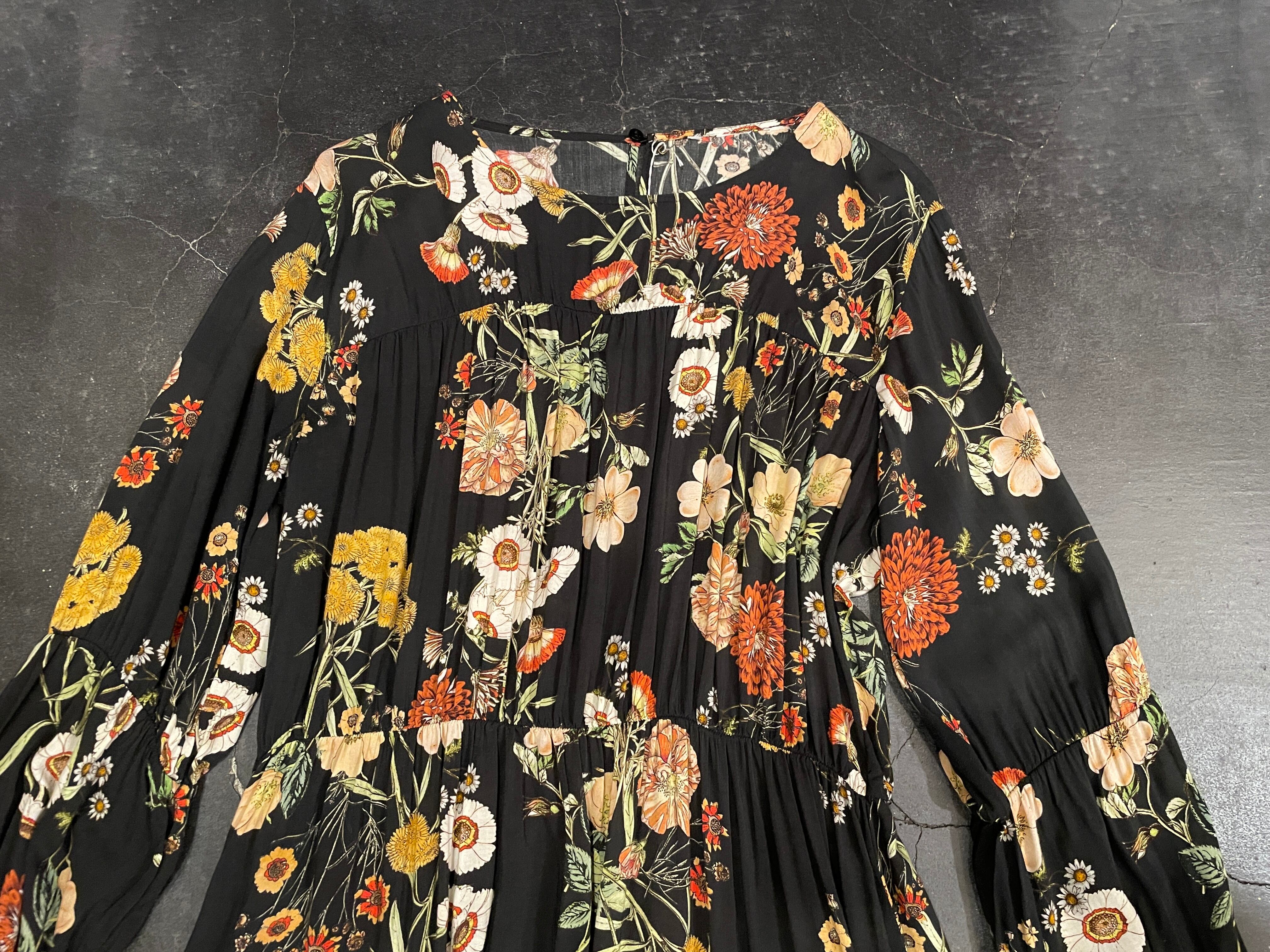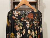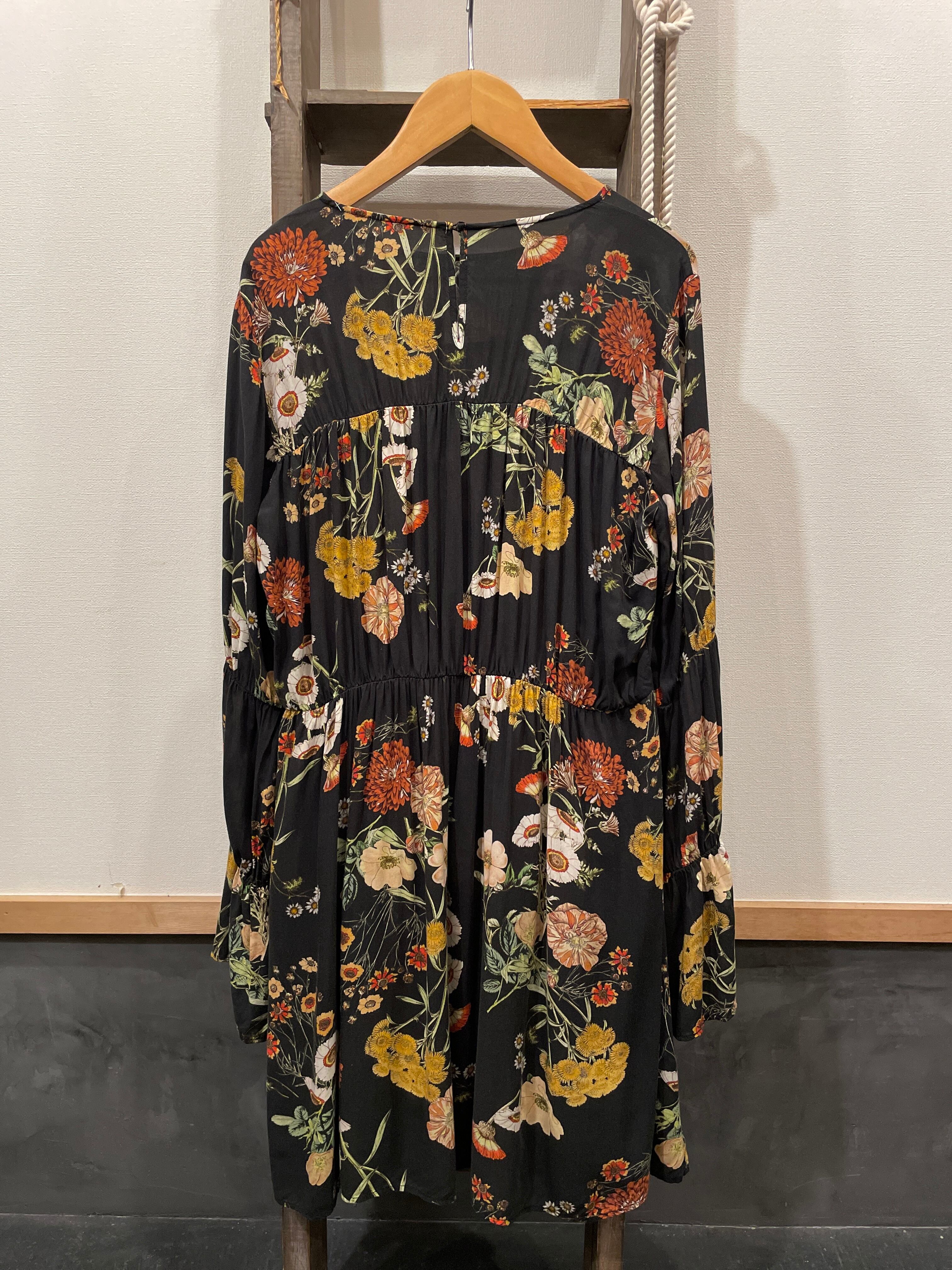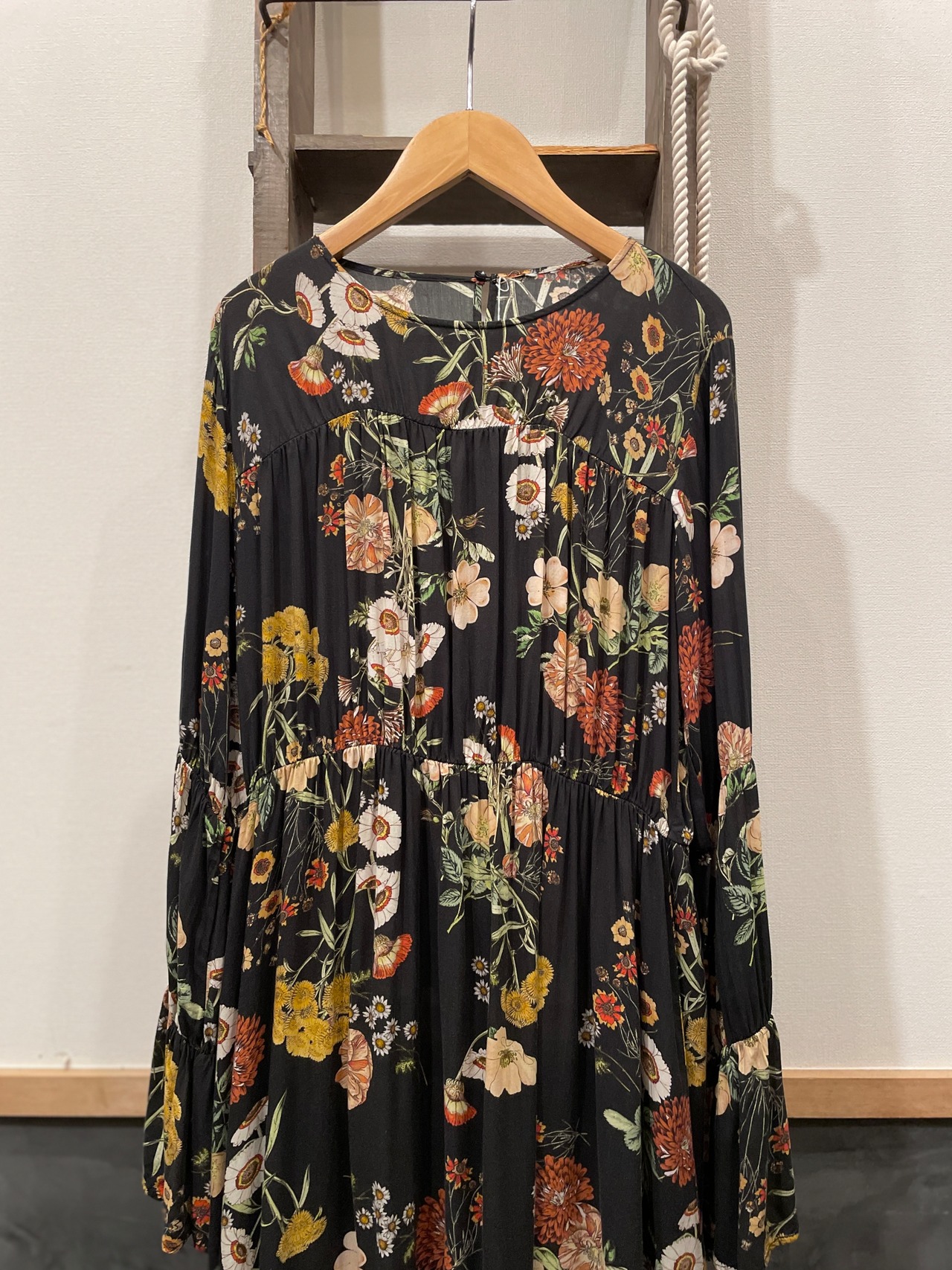 ブラックボディに繊細な花柄プリントが上品なアイテム。