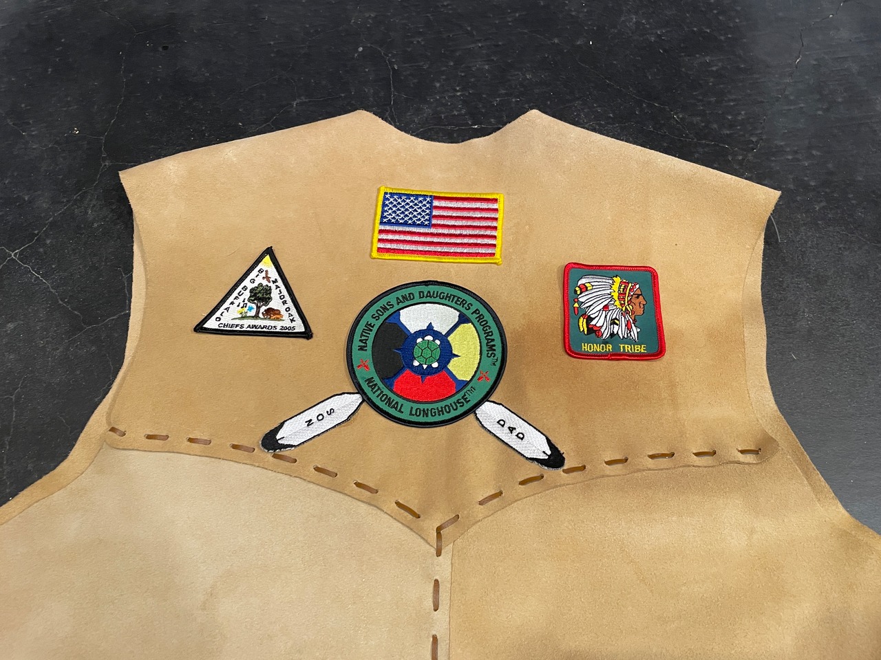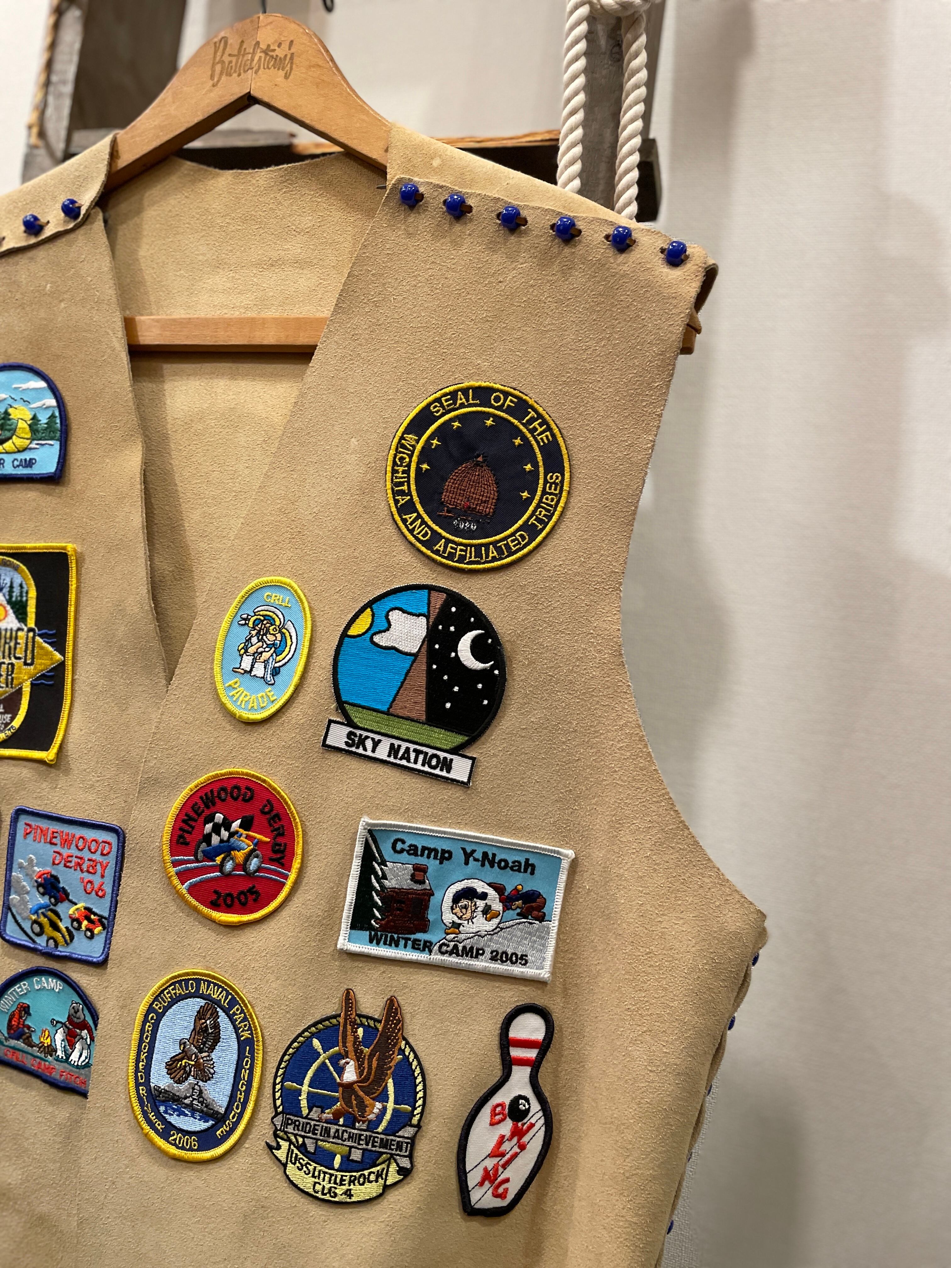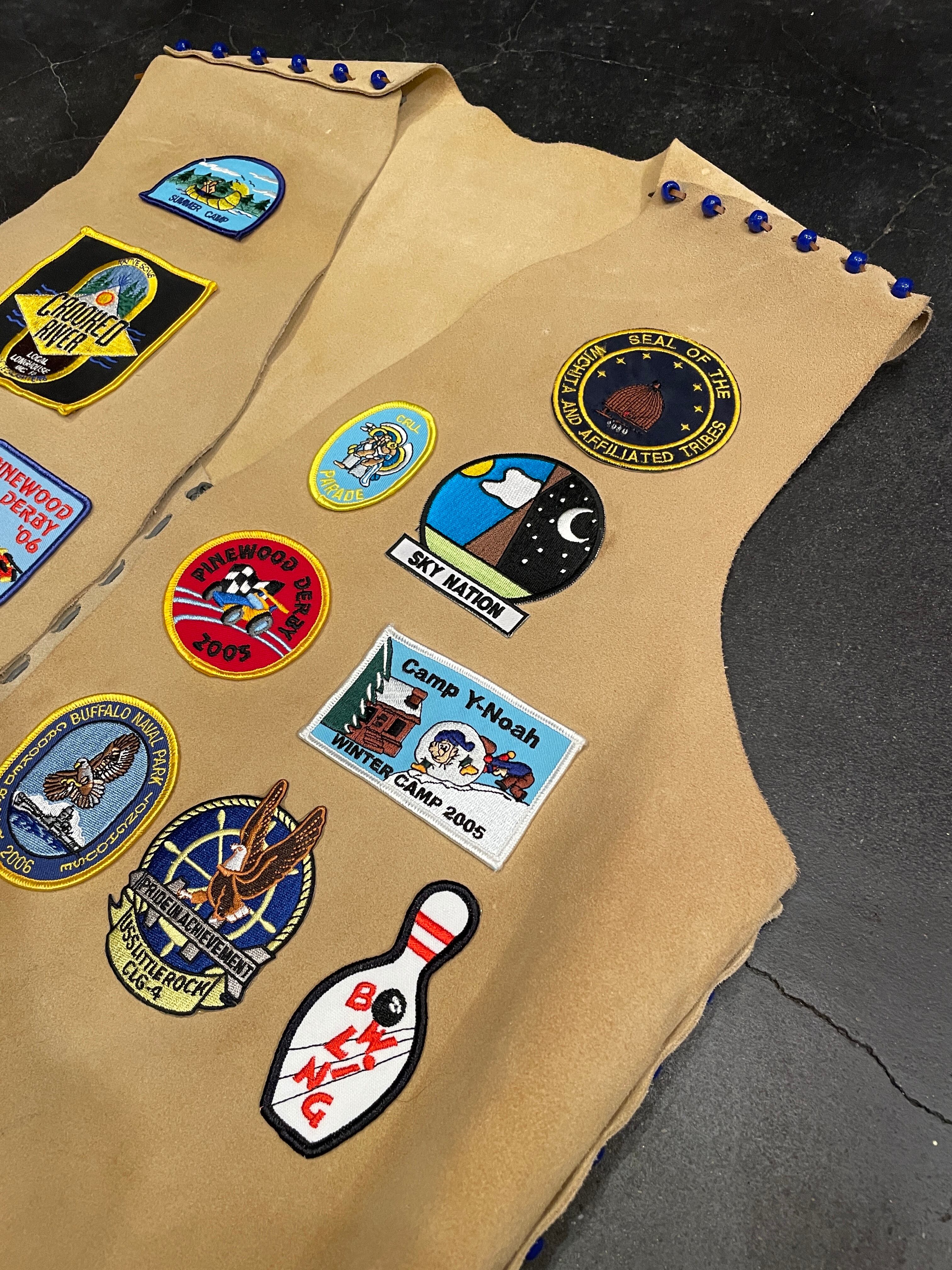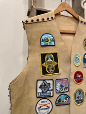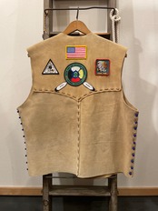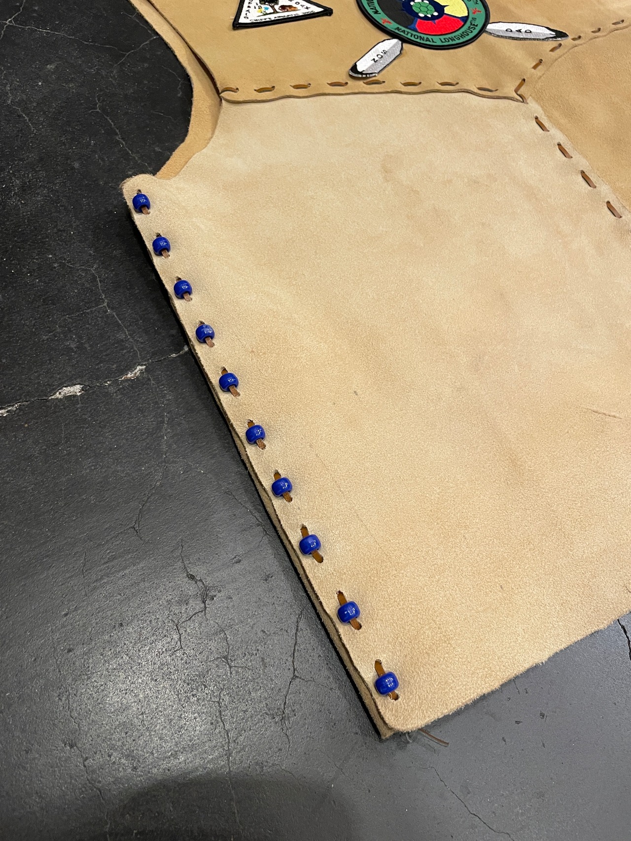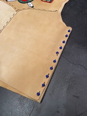 ベージュの柔らかいレザーを使用し、繋ぎ目には青ビーズの装飾が施された、まさに手作り感があるオンリーワンで遊び心満載 !!!