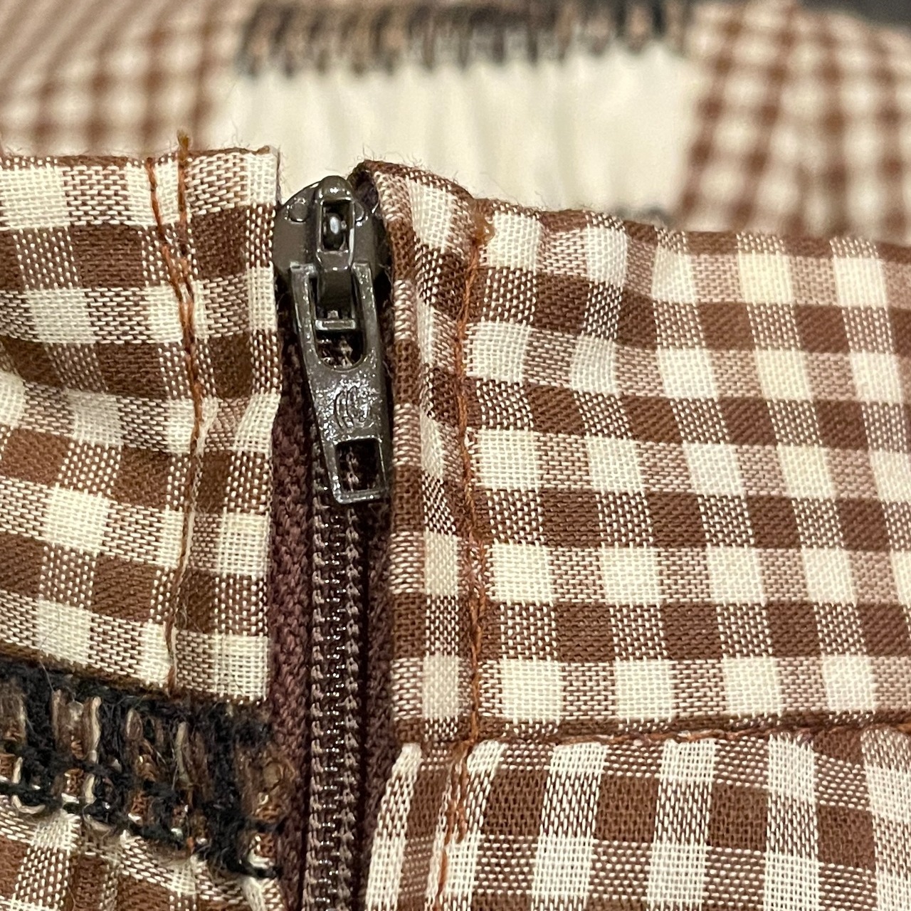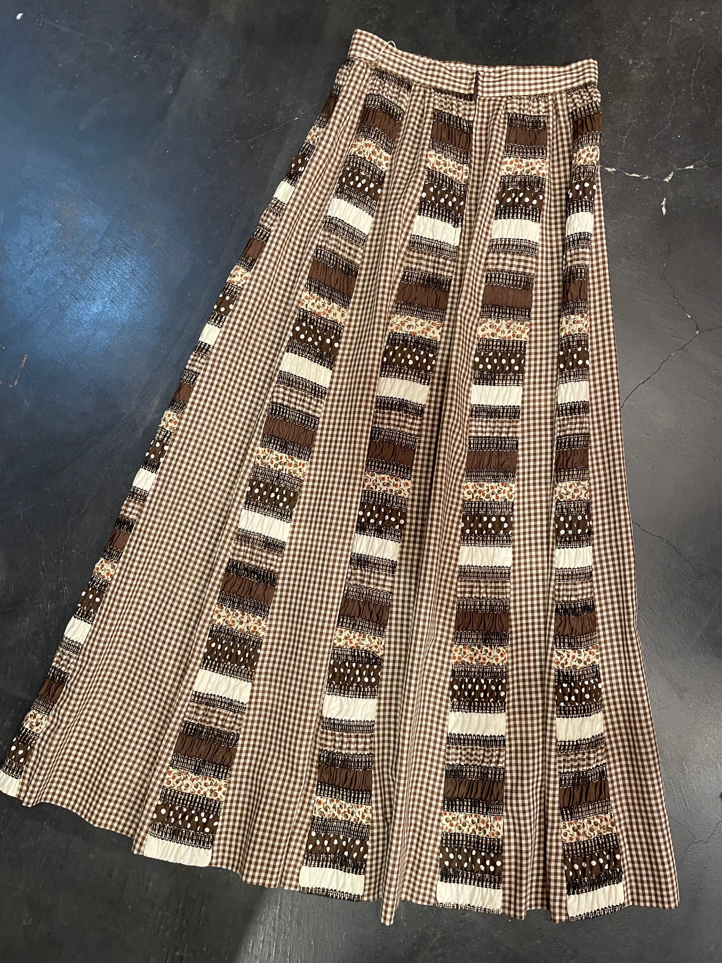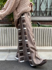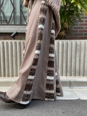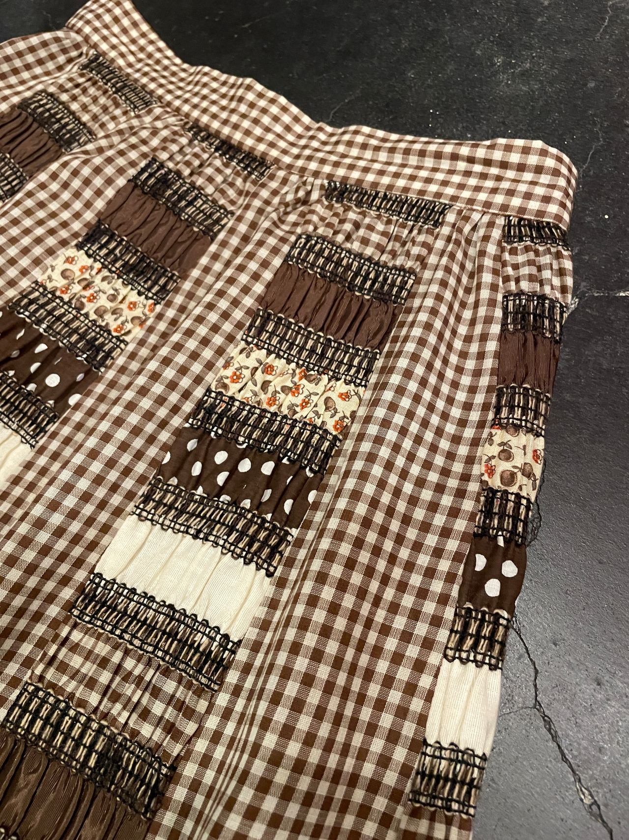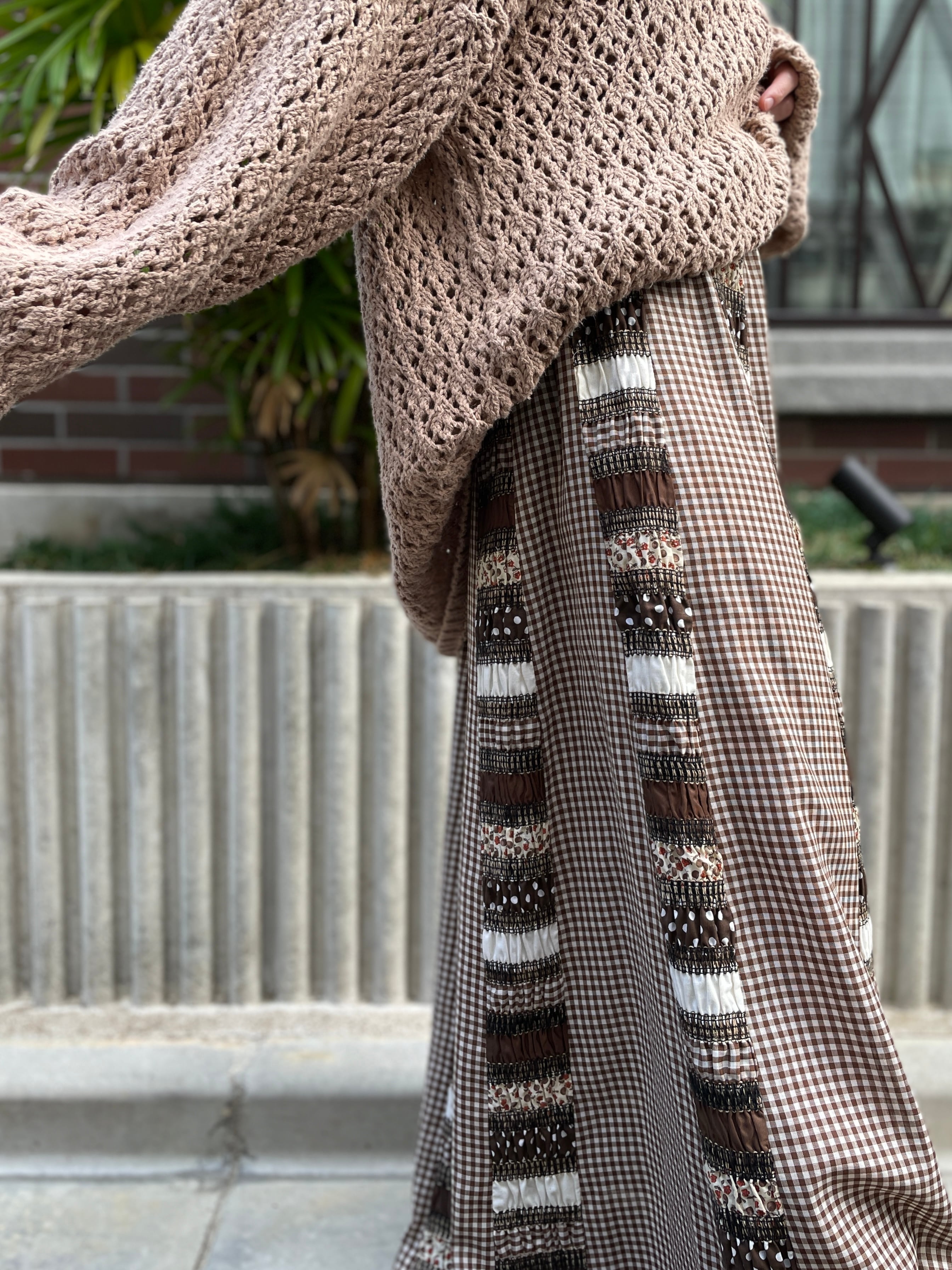 ブラウン×ホワイトのギンガムチェックをベースに、ドットや花柄のパッチワークを丁寧に繋ぎ合わせ縦ラインを意識した切り替えが素敵なアイテム。