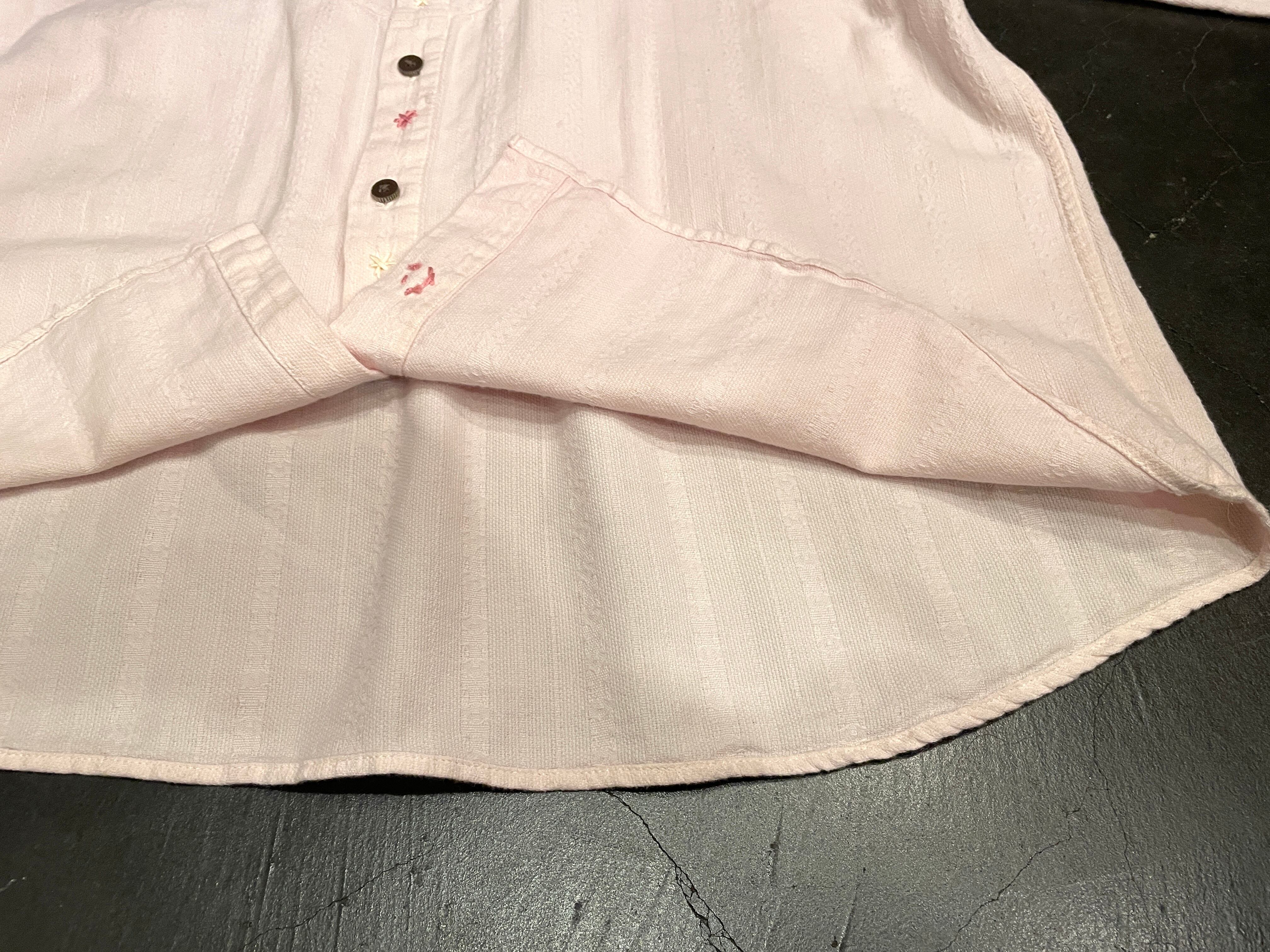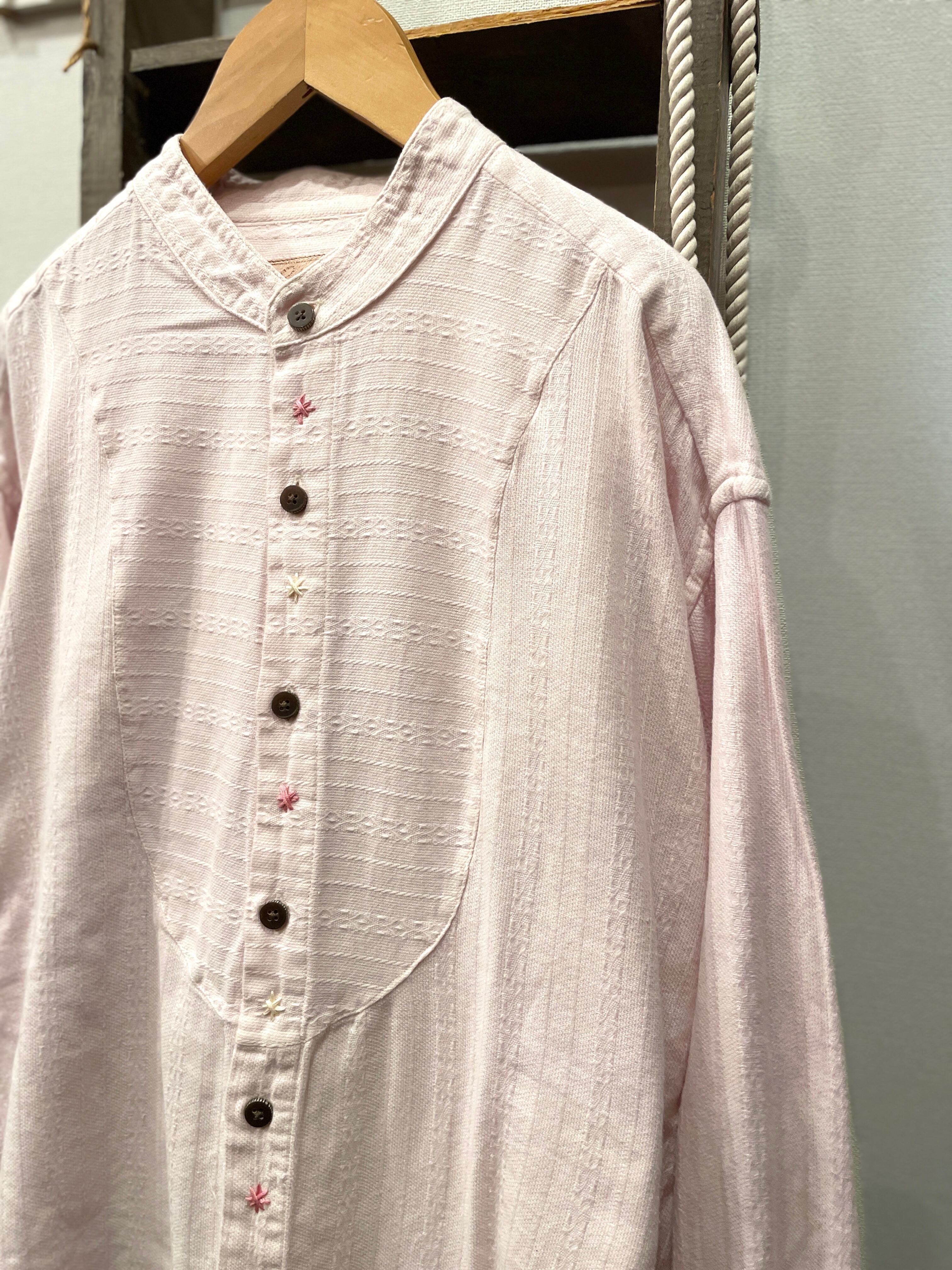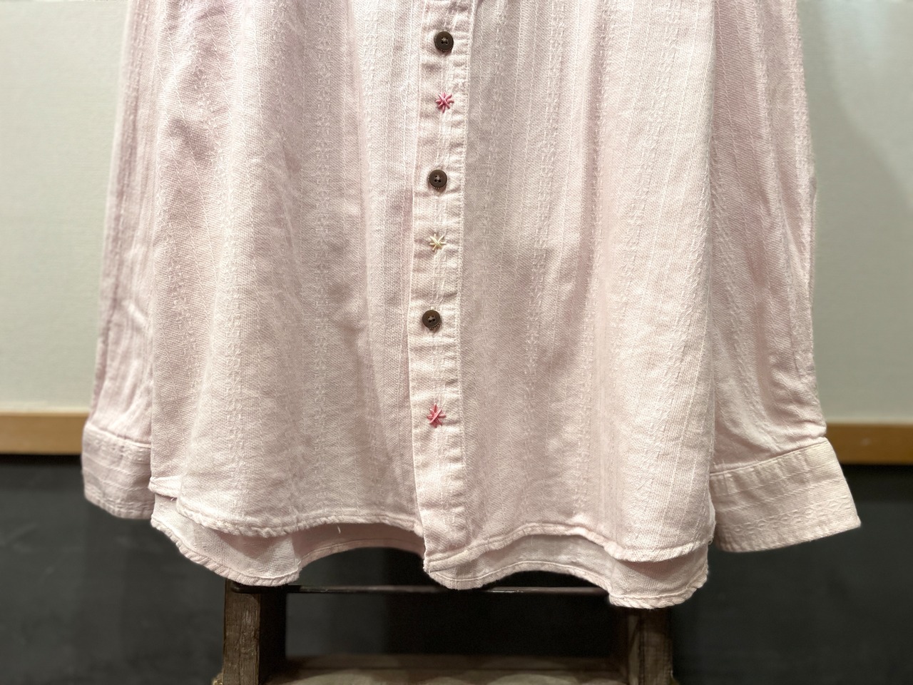 優しい薄らピンクのボディに、織りで表現されたネイティブ調なデザインやヨーク切り替えが素敵なアイテム。